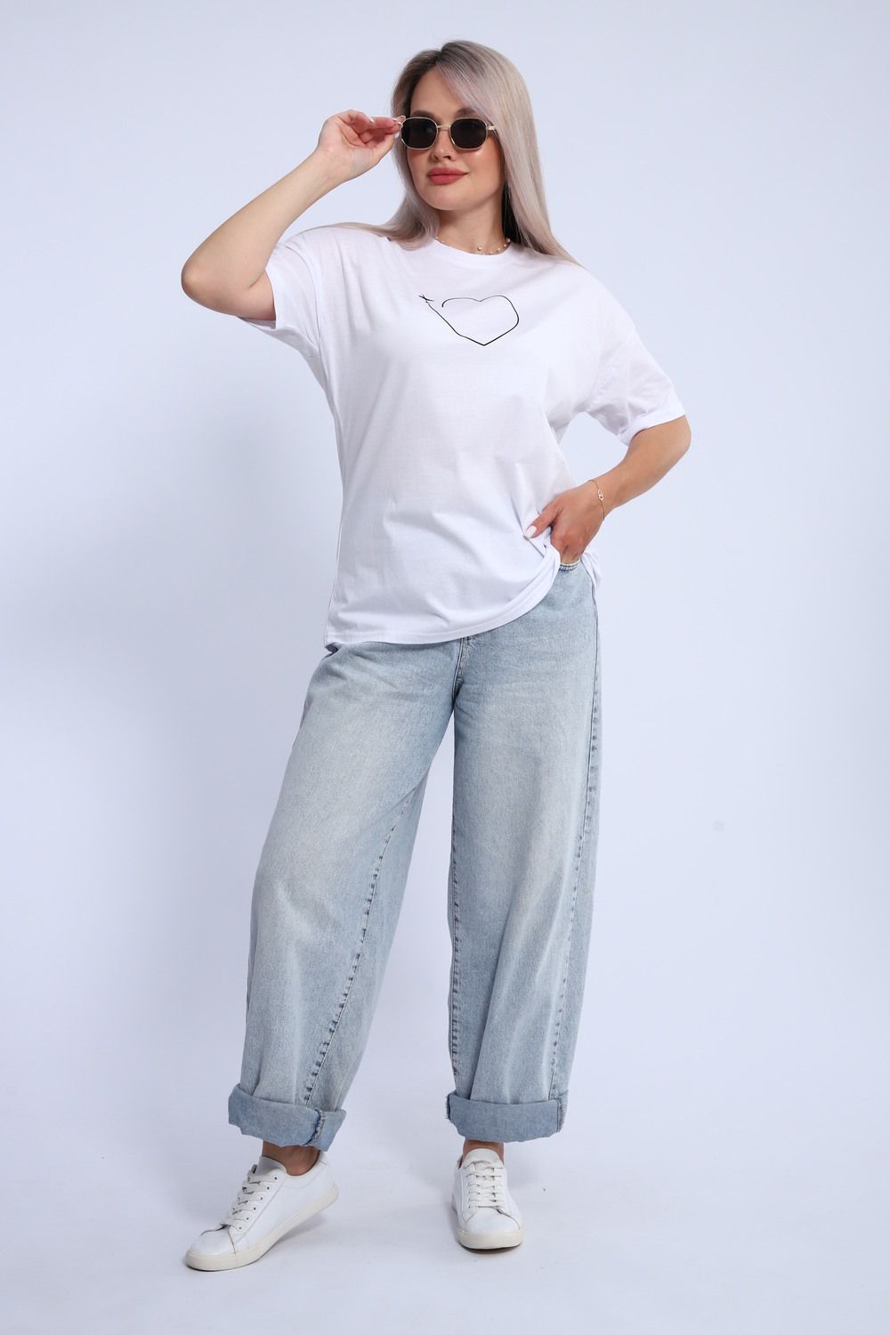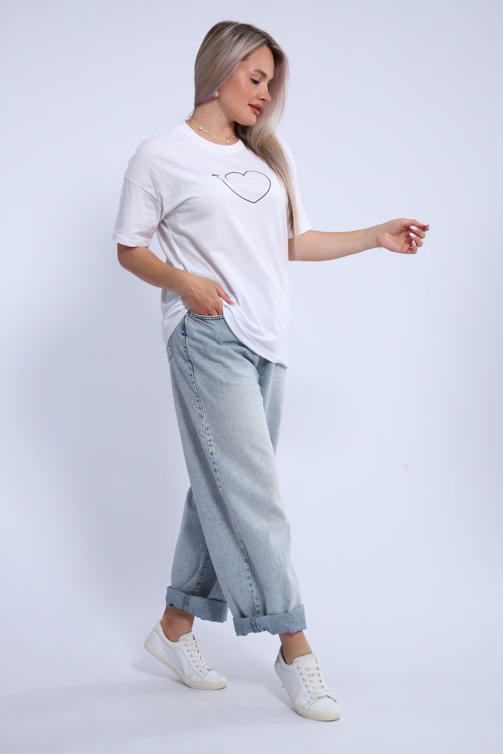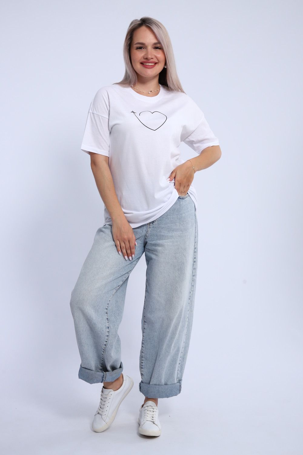 Футболка для женщин прямого силуэта, длиной до середины бедер. Рукав втачной, короткий. Горловина округлой формы. Полочка футболки украшена принтом.