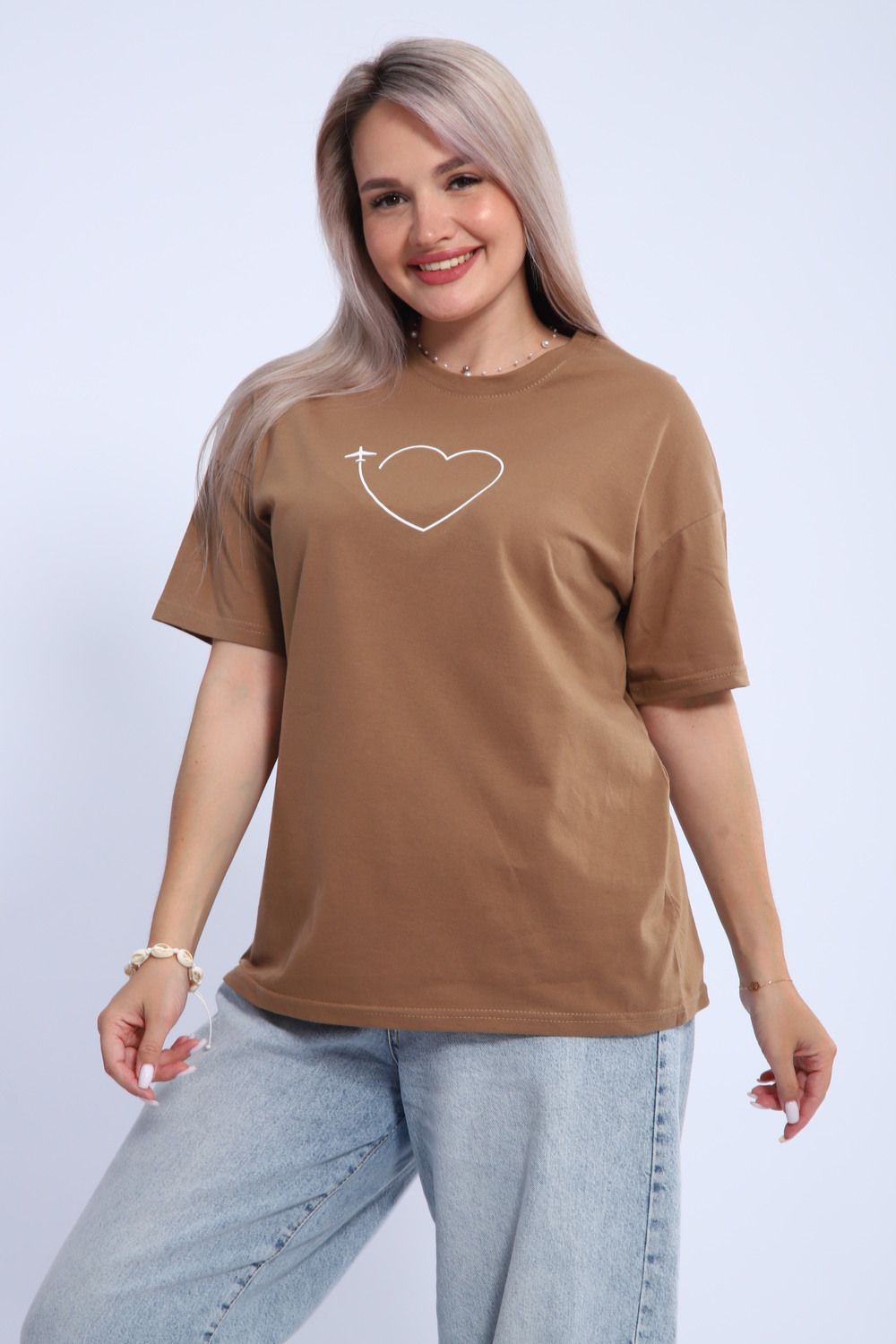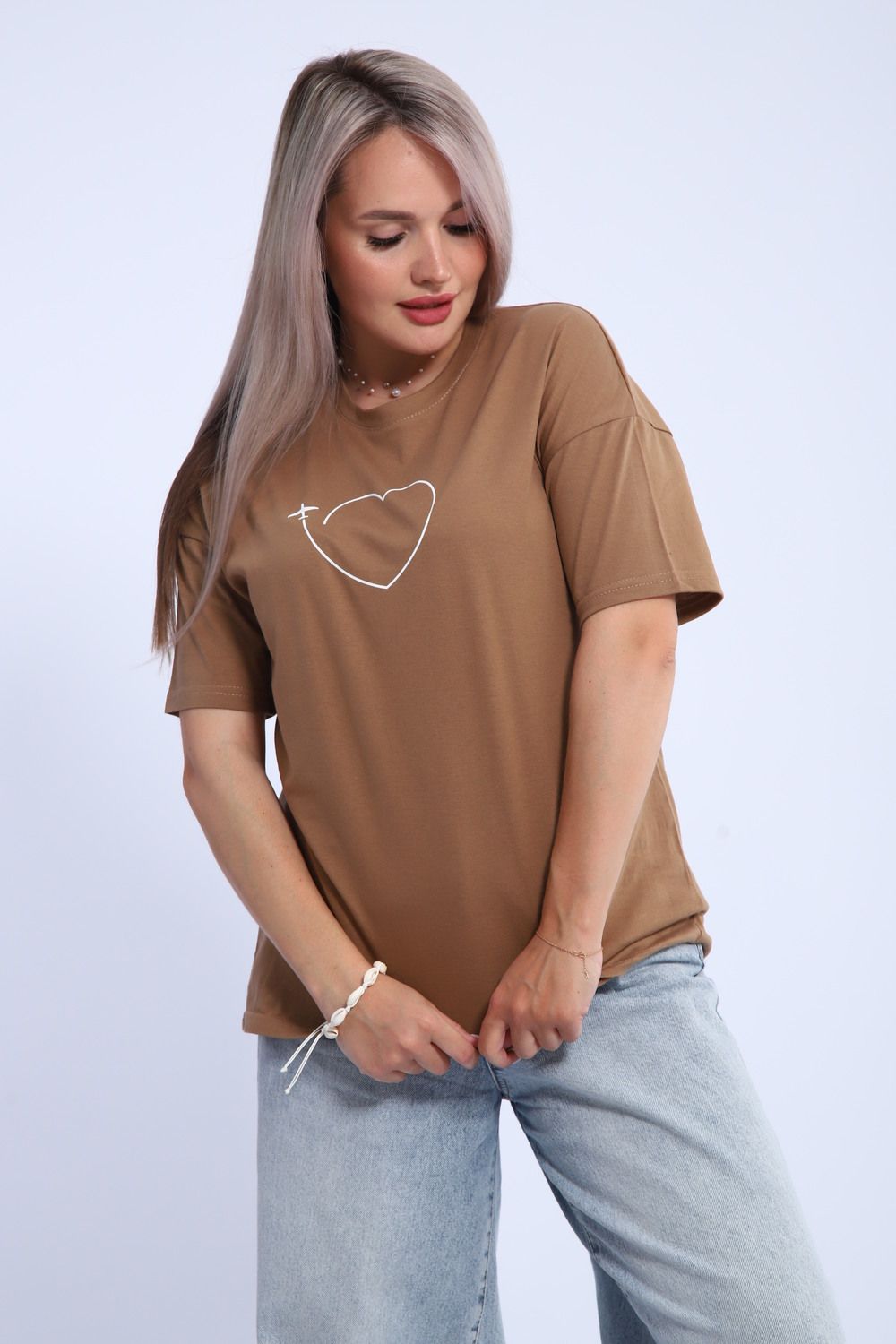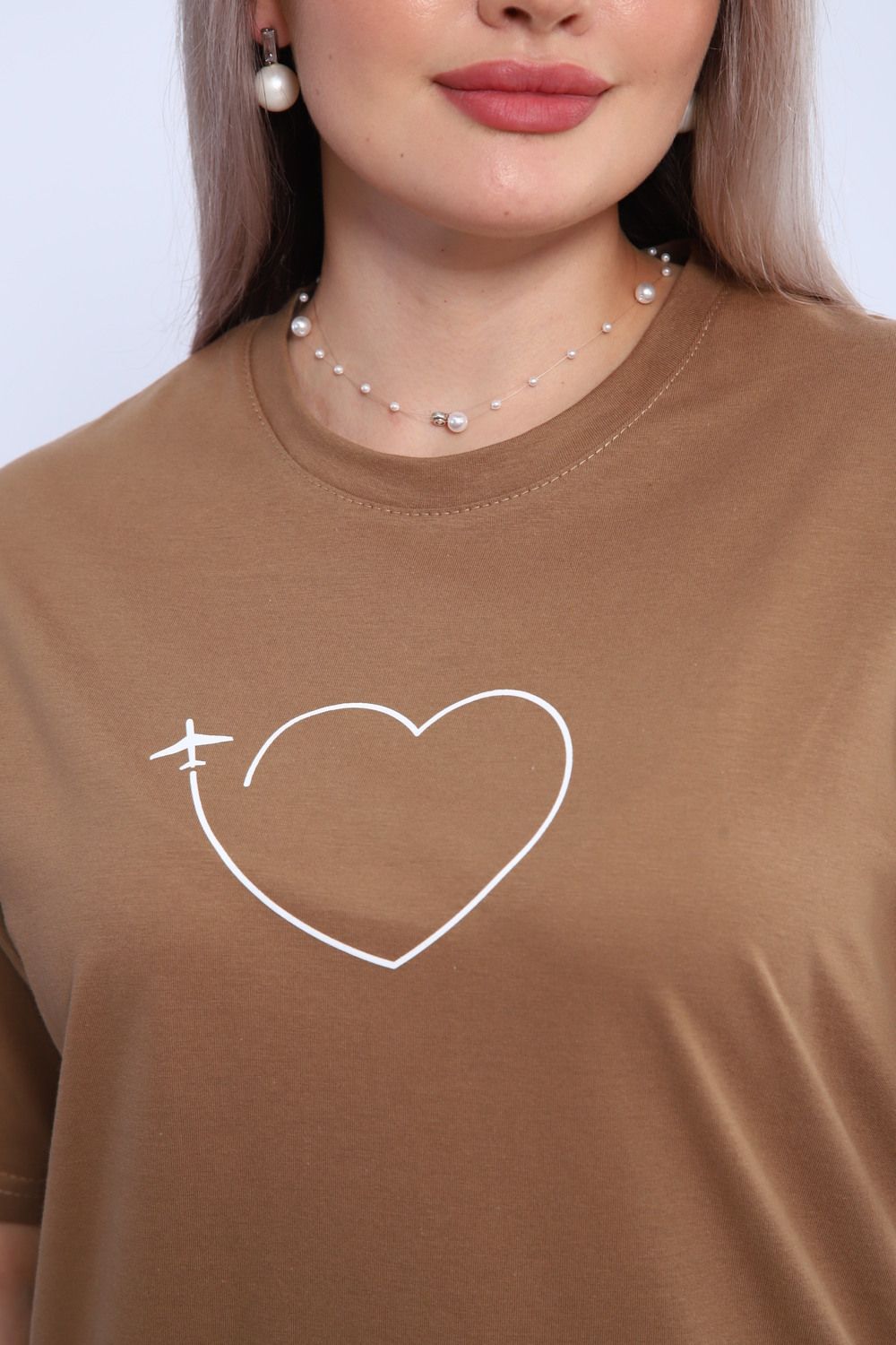 Футболка для женщин прямого силуэта, длиной до середины бедер. Рукав втачной, короткий. Горловина округлой формы. Полочка футболки украшена принтом.