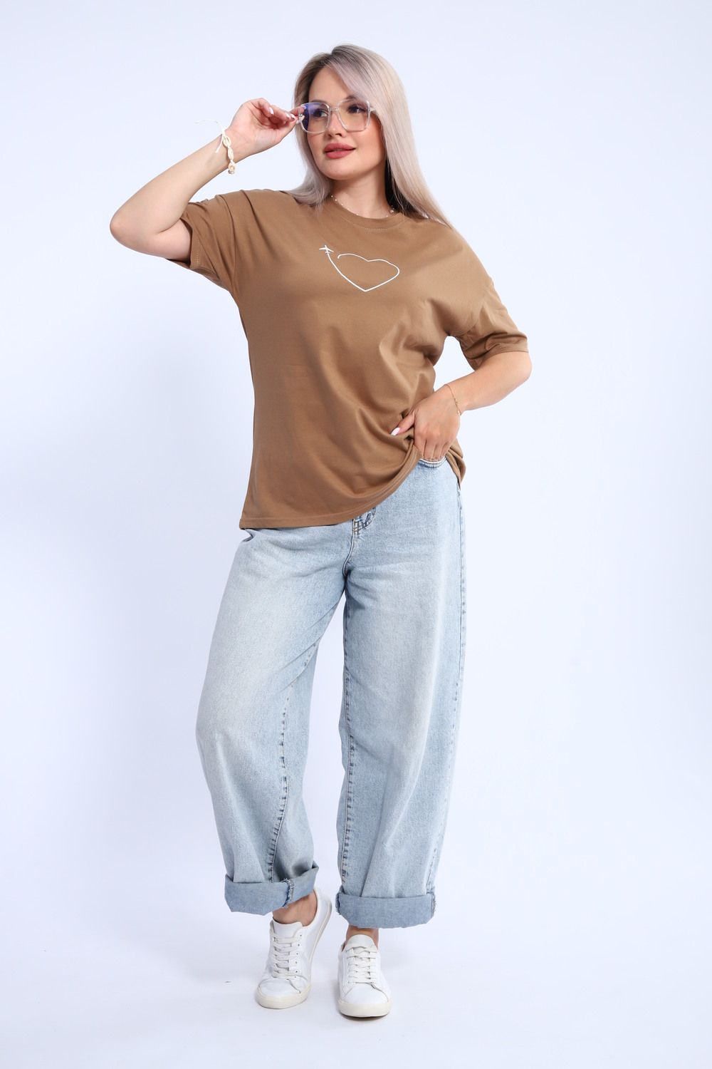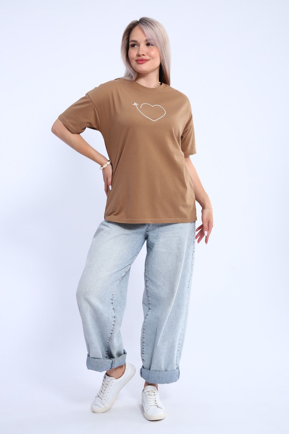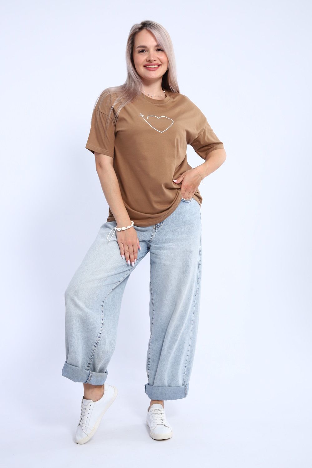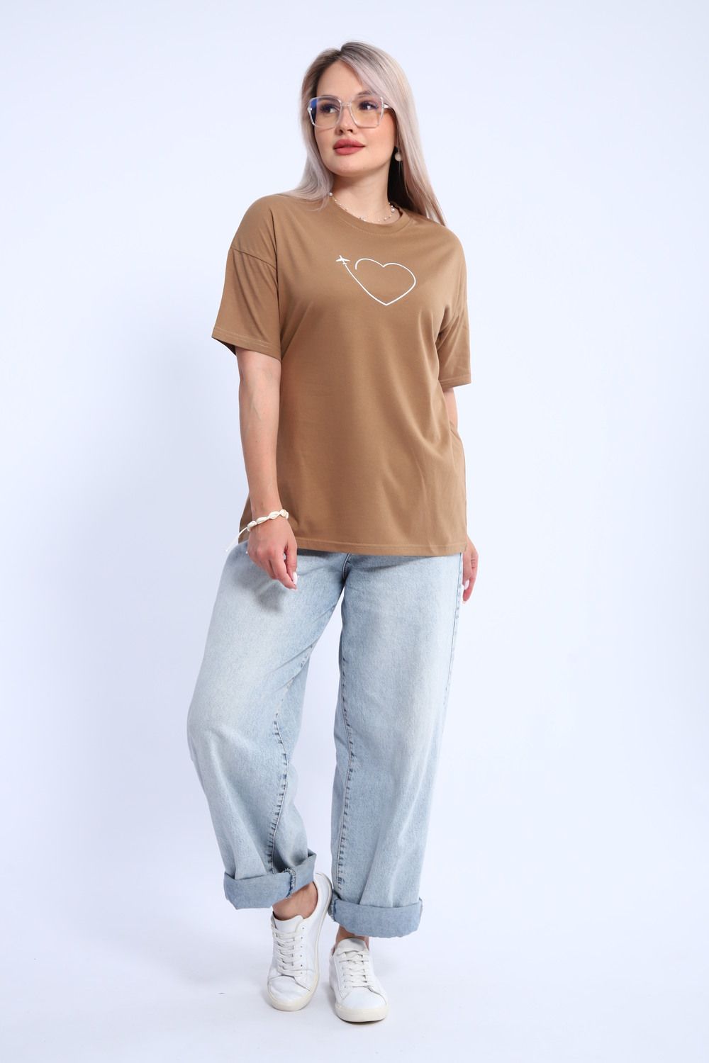 Футболка для женщин прямого силуэта, длиной до середины бедер. Рукав втачной, короткий. Горловина округлой формы. Полочка футболки украшена принтом.