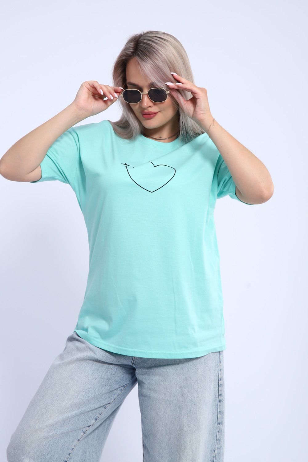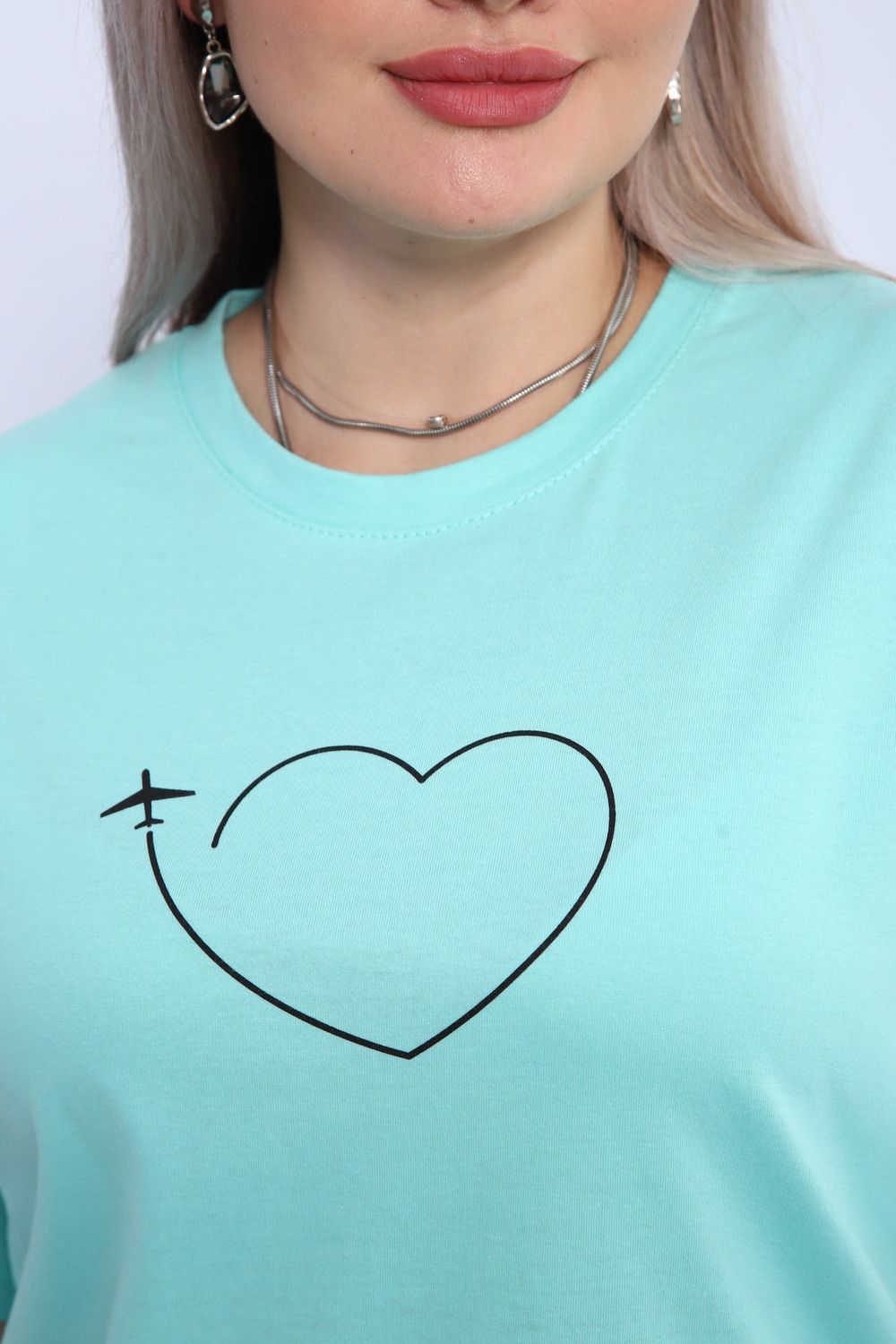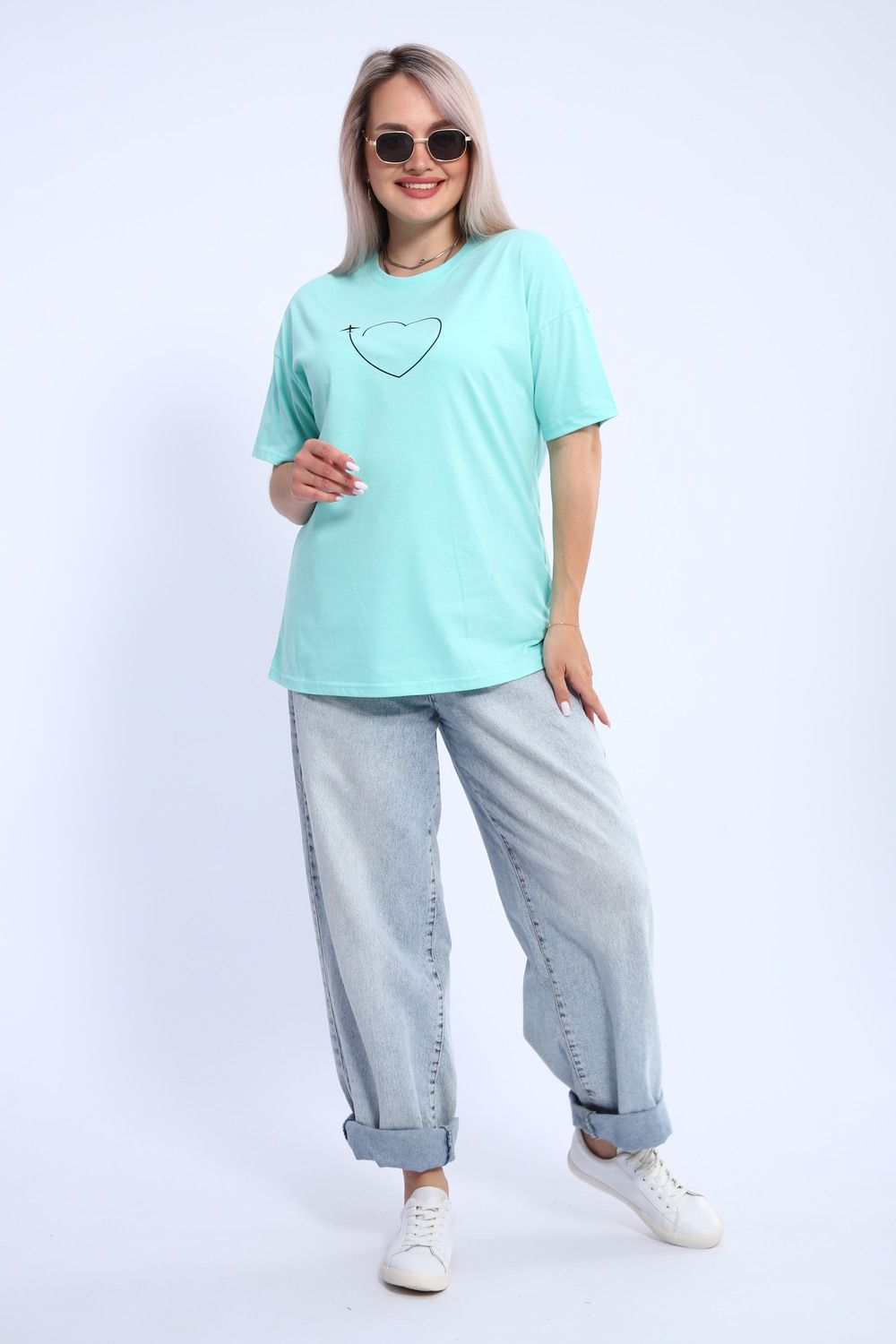 Футболка для женщин прямого силуэта, длиной до середины бедер. Рукав втачной, короткий. Горловина округлой формы. Полочка футболки украшена принтом.