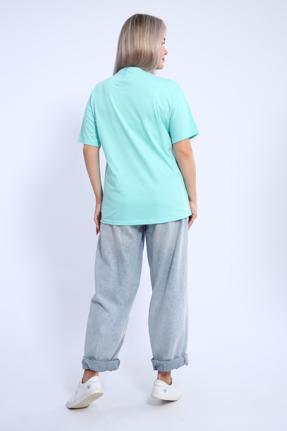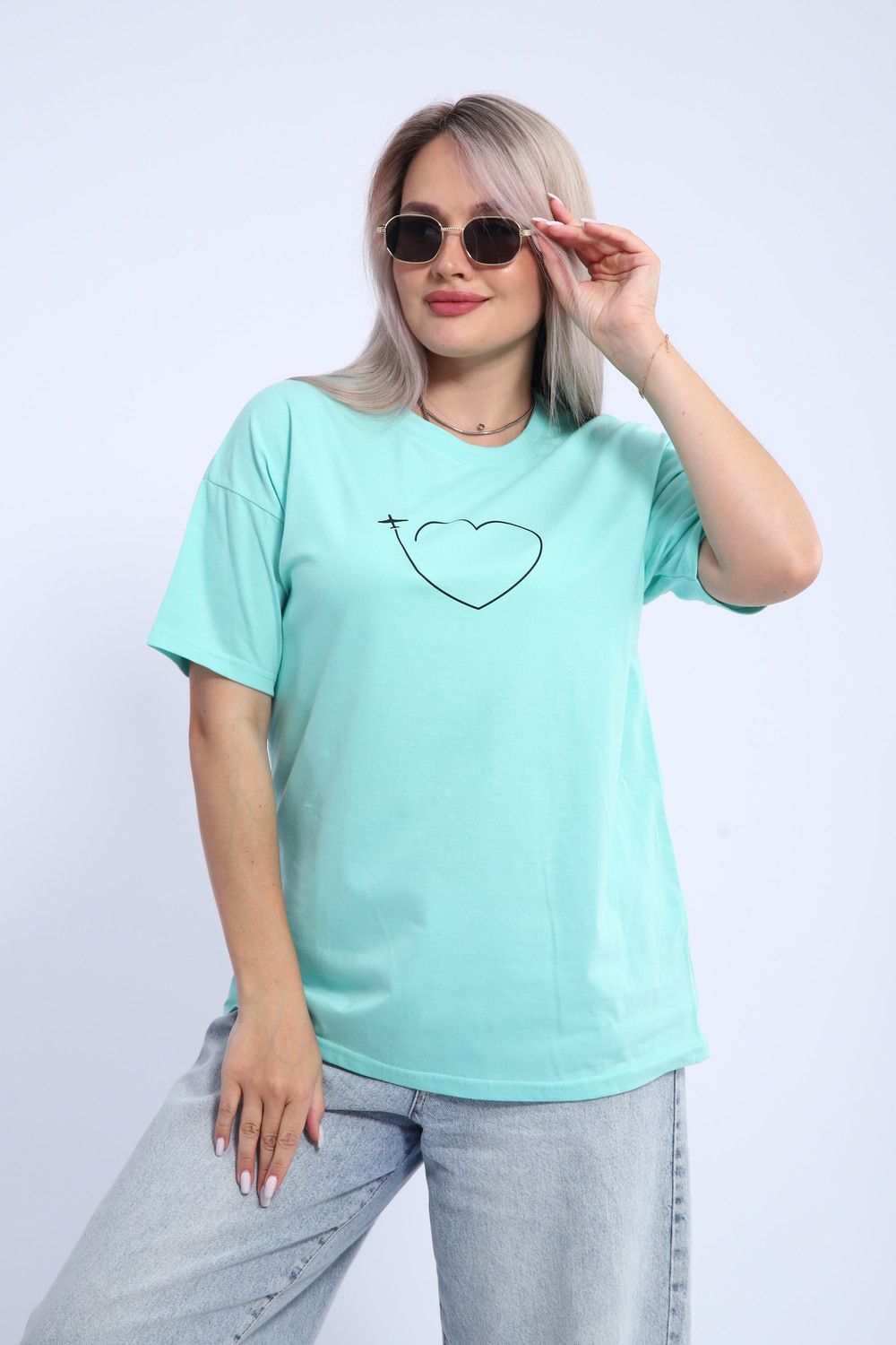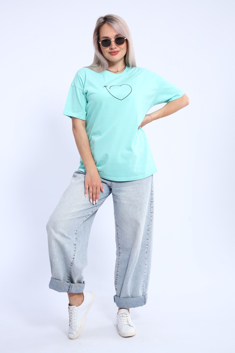 Футболка для женщин прямого силуэта, длиной до середины бедер. Рукав втачной, короткий. Горловина округлой формы. Полочка футболки украшена принтом.