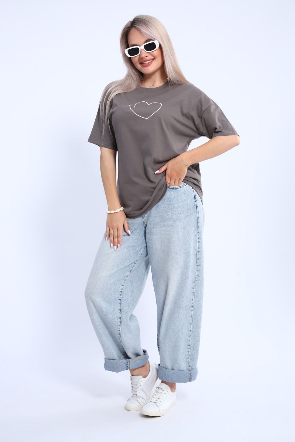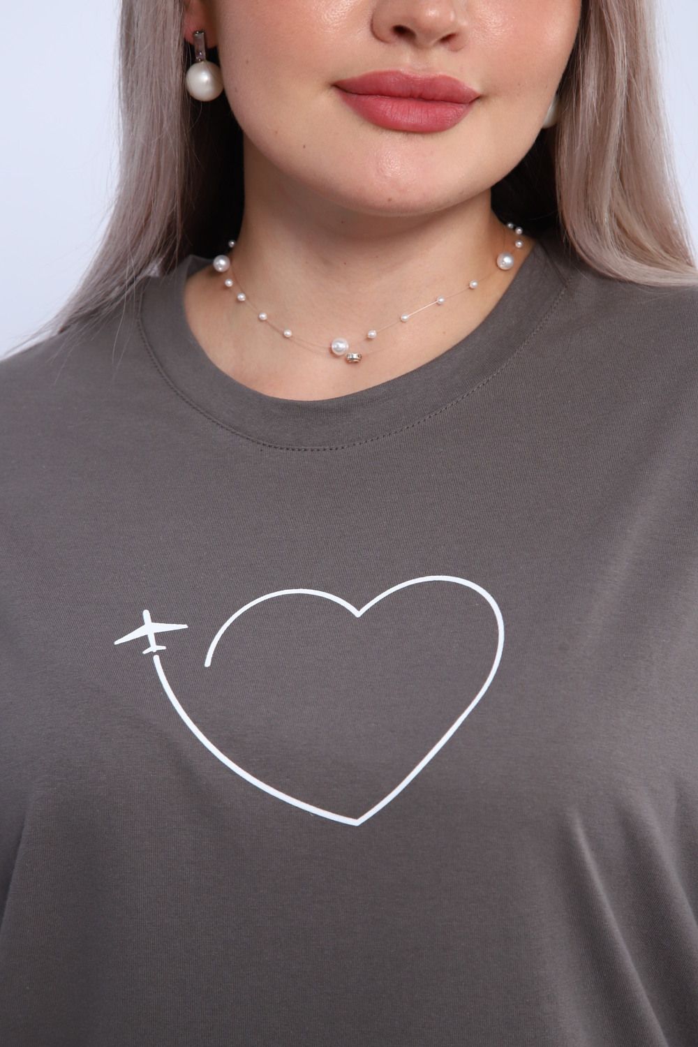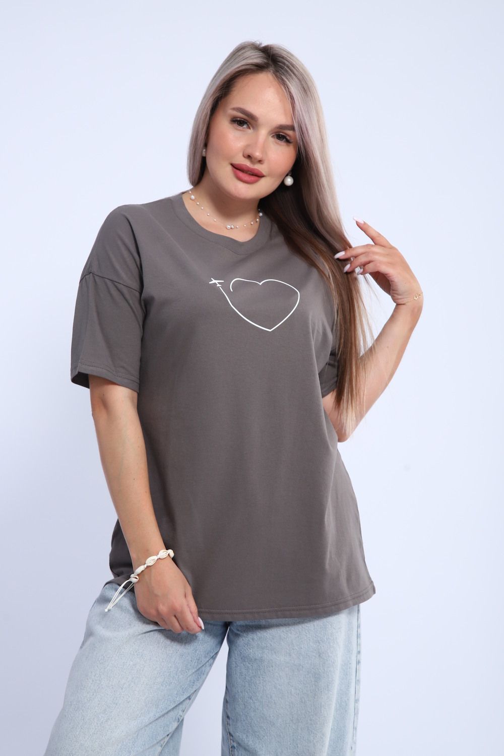 Футболка для женщин прямого силуэта, длиной до середины бедер. Рукав втачной, короткий. Горловина округлой формы. Полочка футболки украшена принтом.