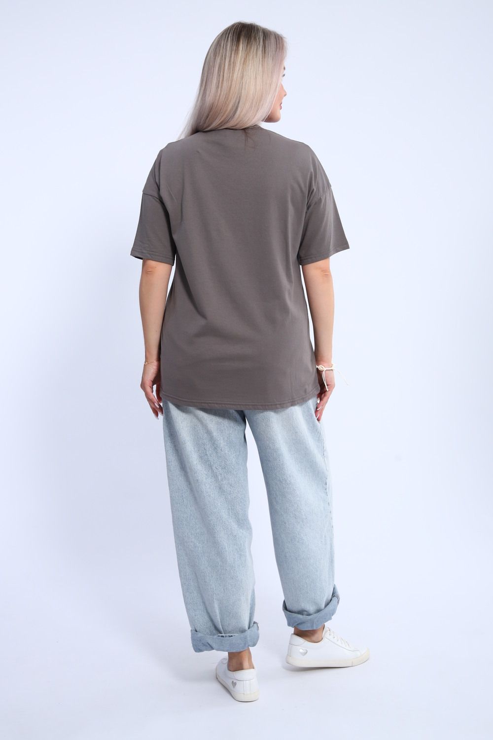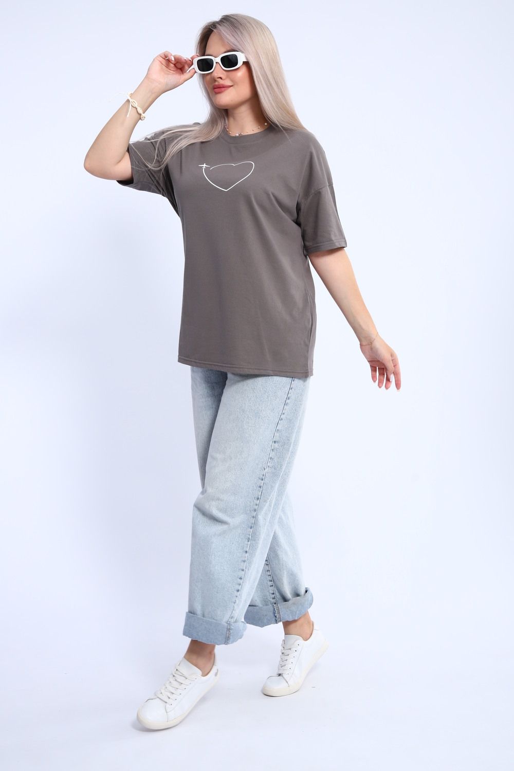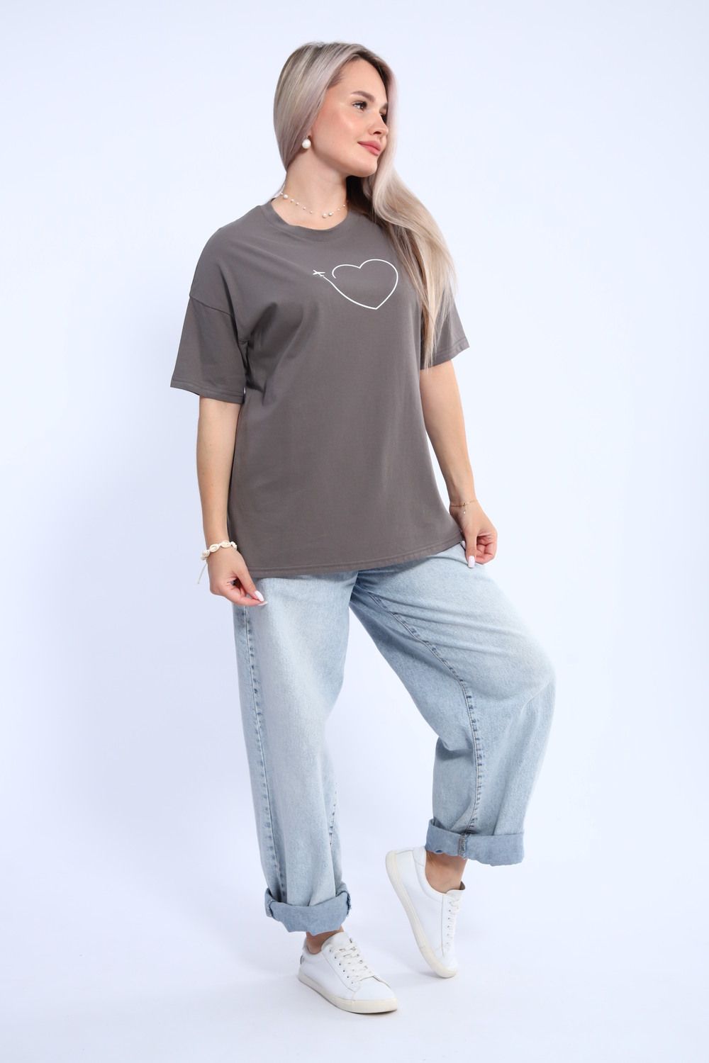 Футболка для женщин прямого силуэта, длиной до середины бедер. Рукав втачной, короткий. Горловина округлой формы. Полочка футболки украшена принтом.