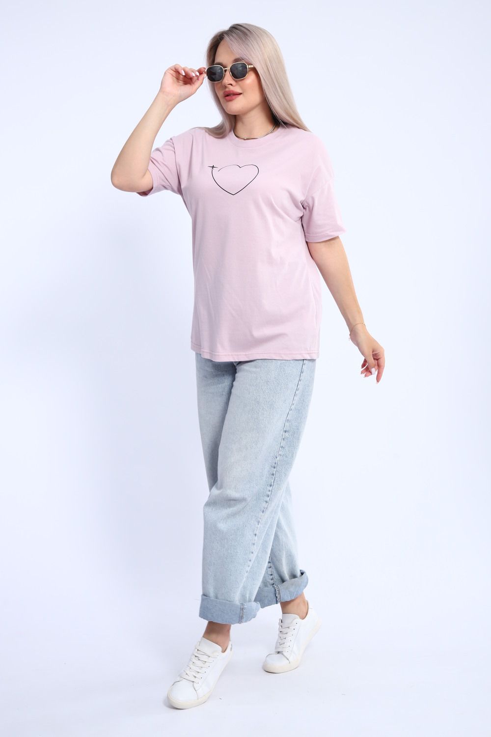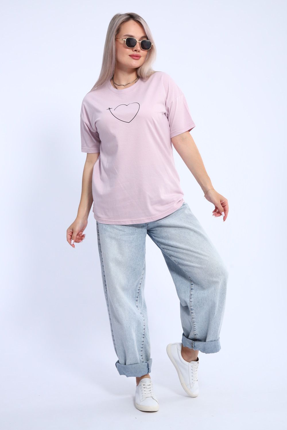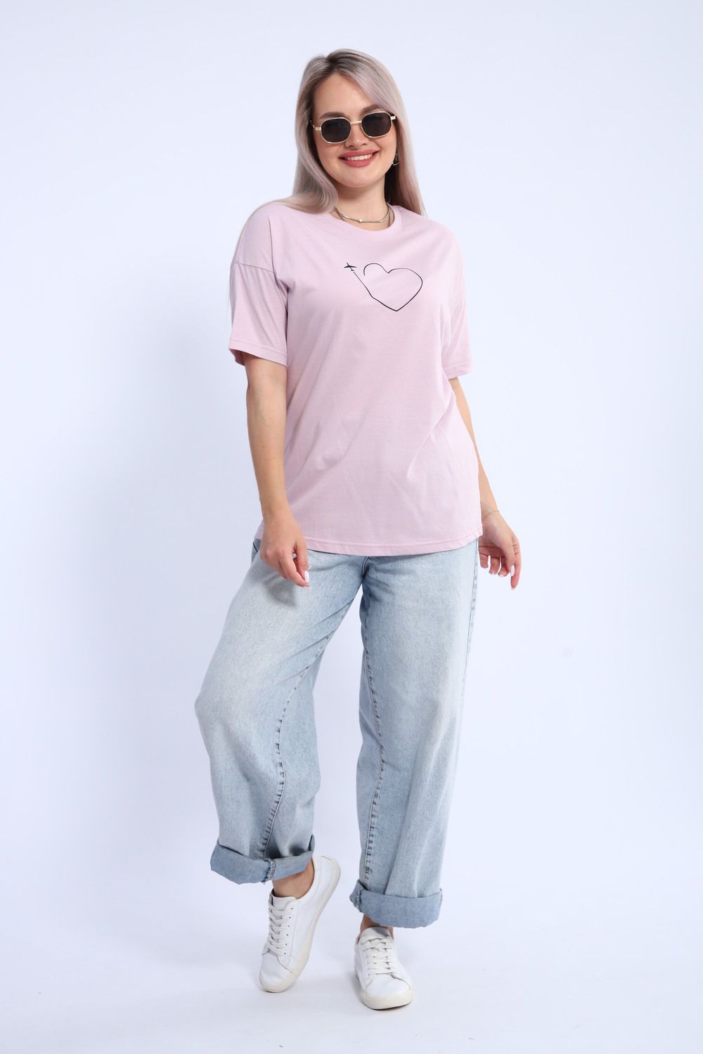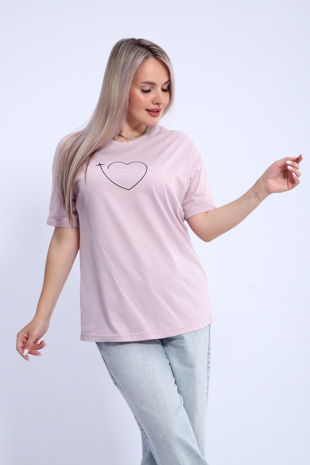 Футболка для женщин прямого силуэта, длиной до середины бедер. Рукав втачной, короткий. Горловина округлой формы. Полочка футболки украшена принтом.