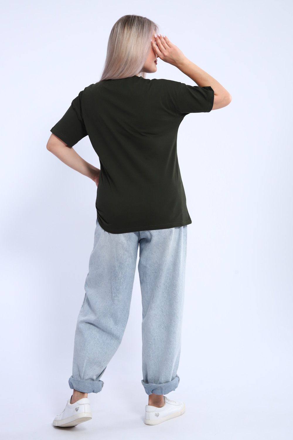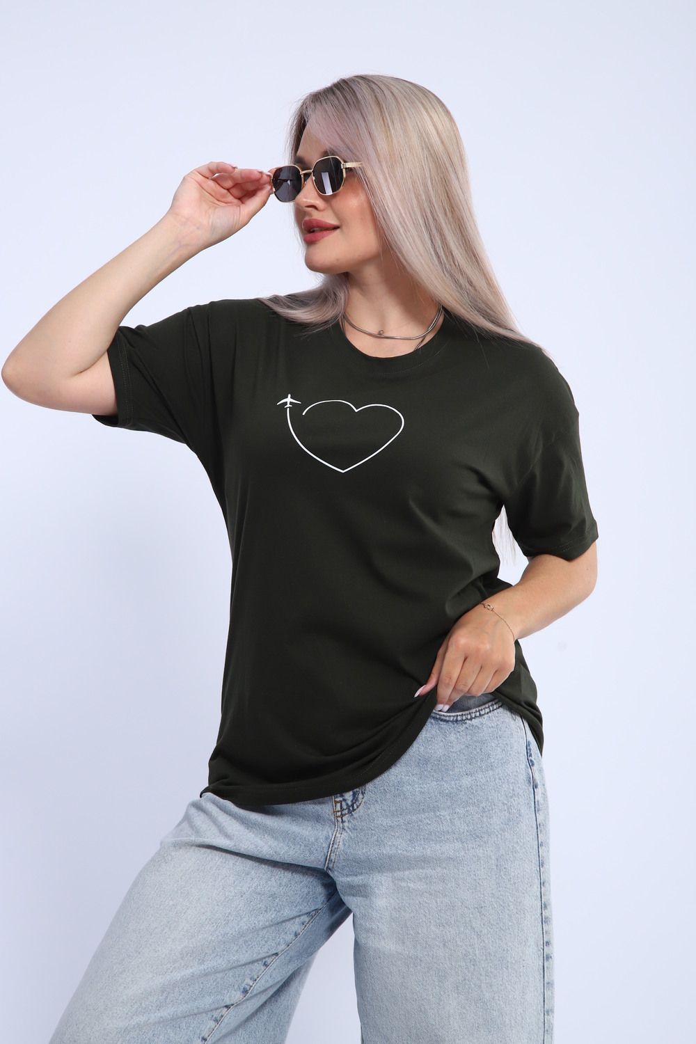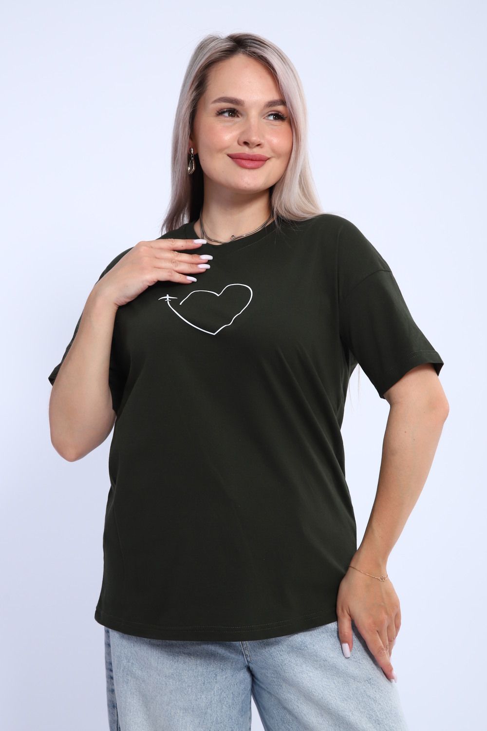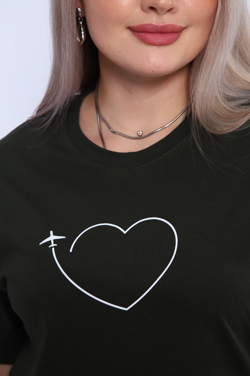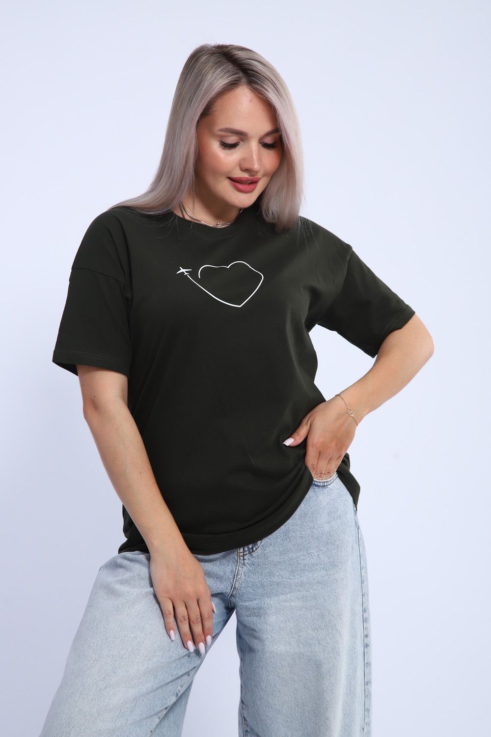 Футболка для женщин прямого силуэта, длиной до середины бедер. Рукав втачной, короткий. Горловина округлой формы. Полочка футболки украшена принтом.