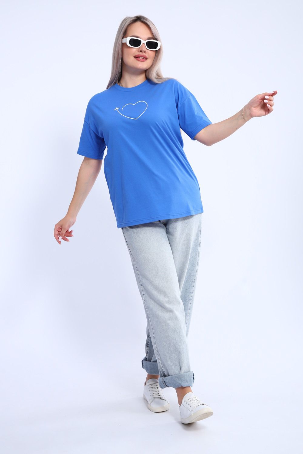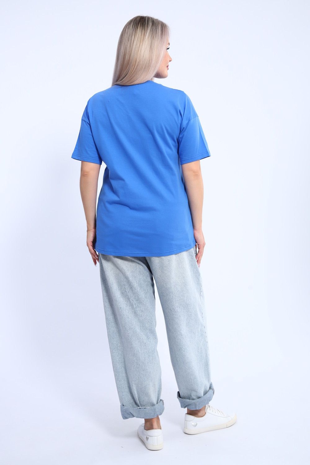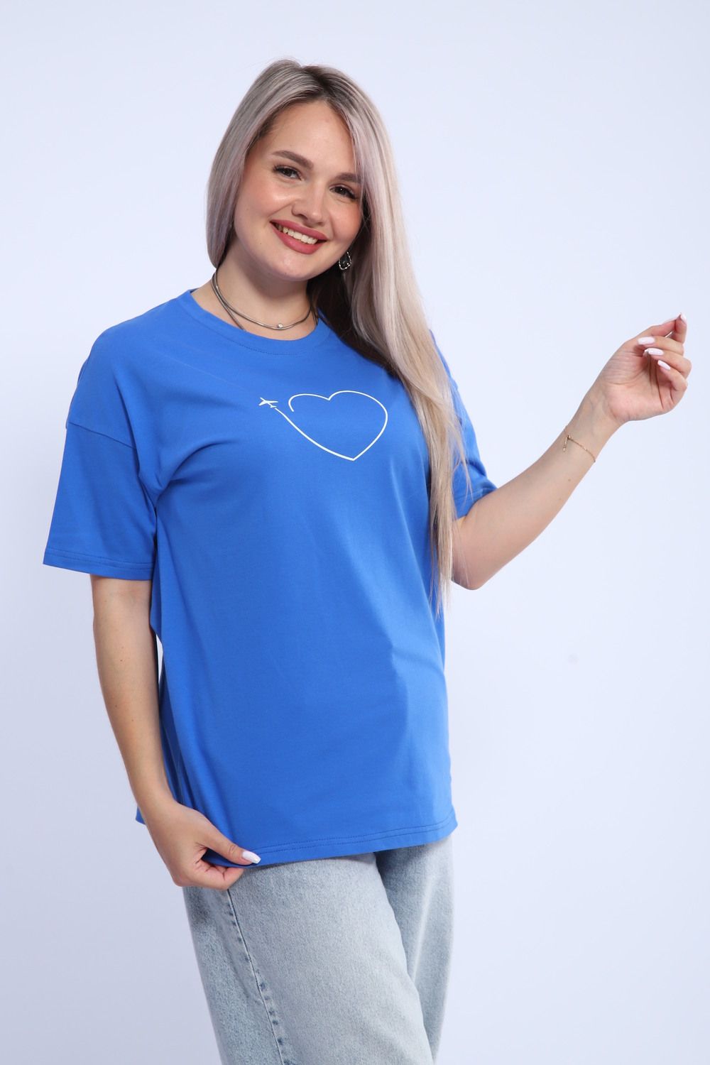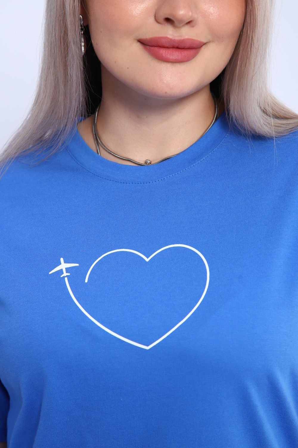 Футболка для женщин прямого силуэта, длиной до середины бедер. Рукав втачной, короткий. Горловина округлой формы. Полочка футболки украшена принтом.