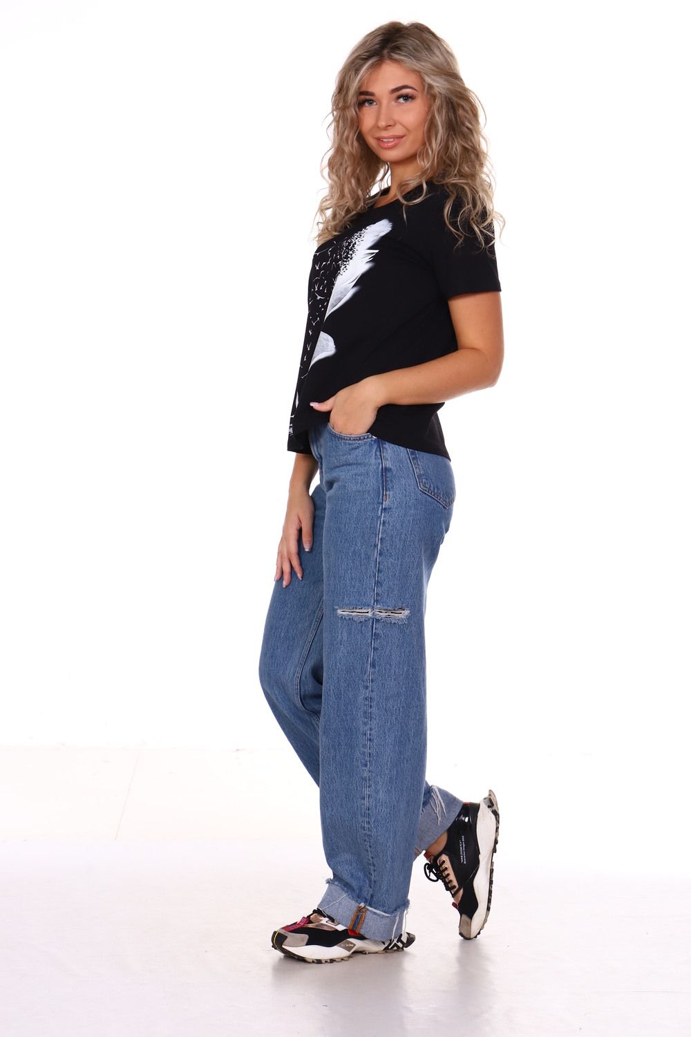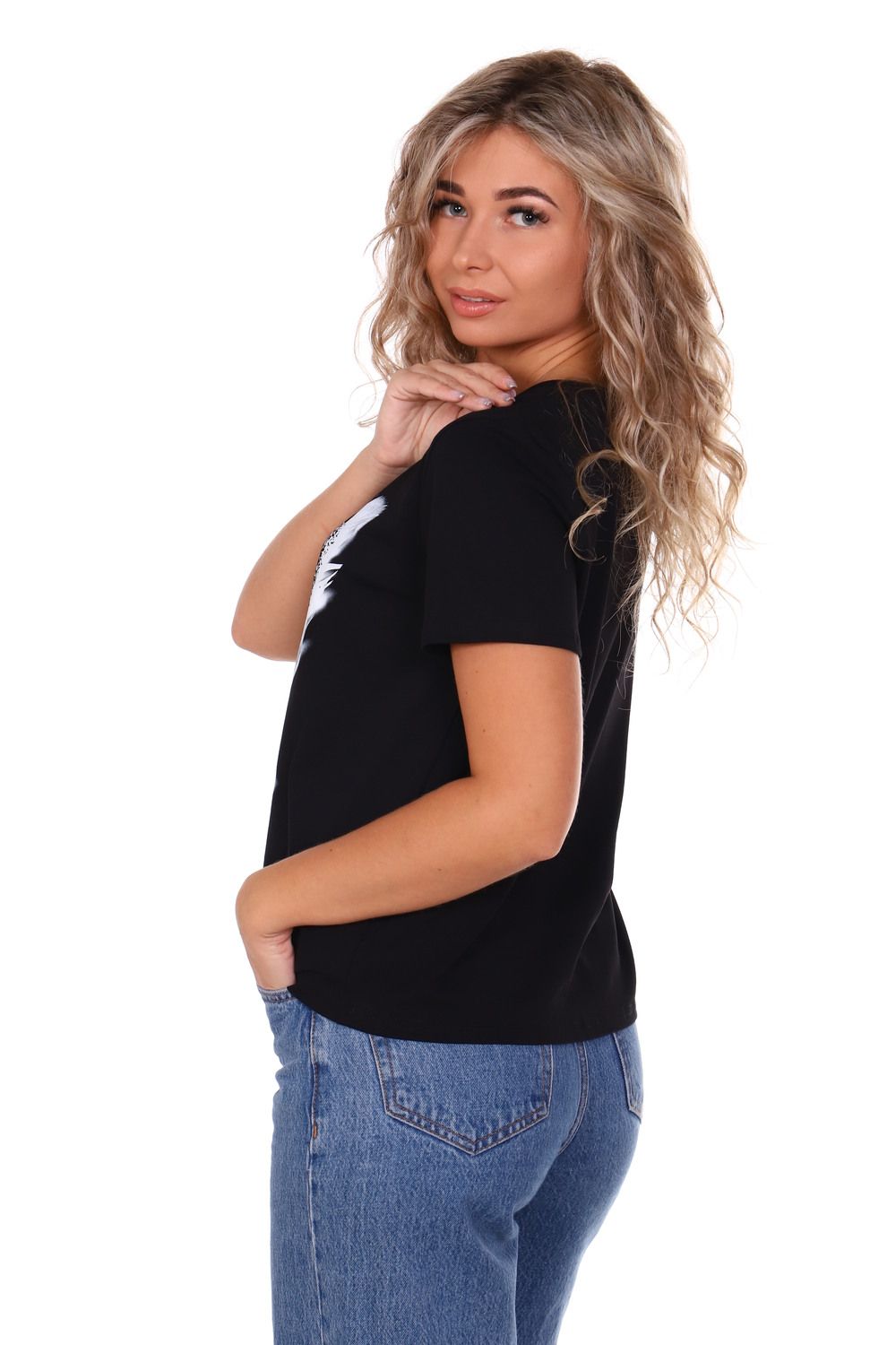 Футболка женская с оригинальным принтом, из хлопковой ткани с лайкрой. Ткань держит форму, не вытягивается, приятная на ощупь. Стильная футболка оригинального фасона. Посадка свободная.
