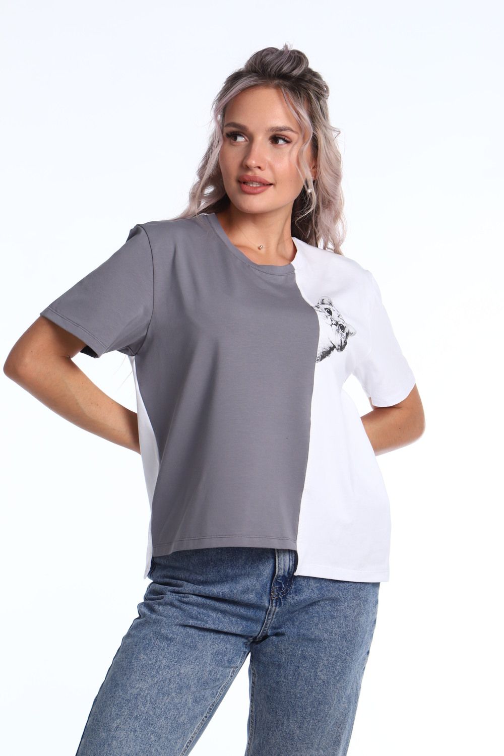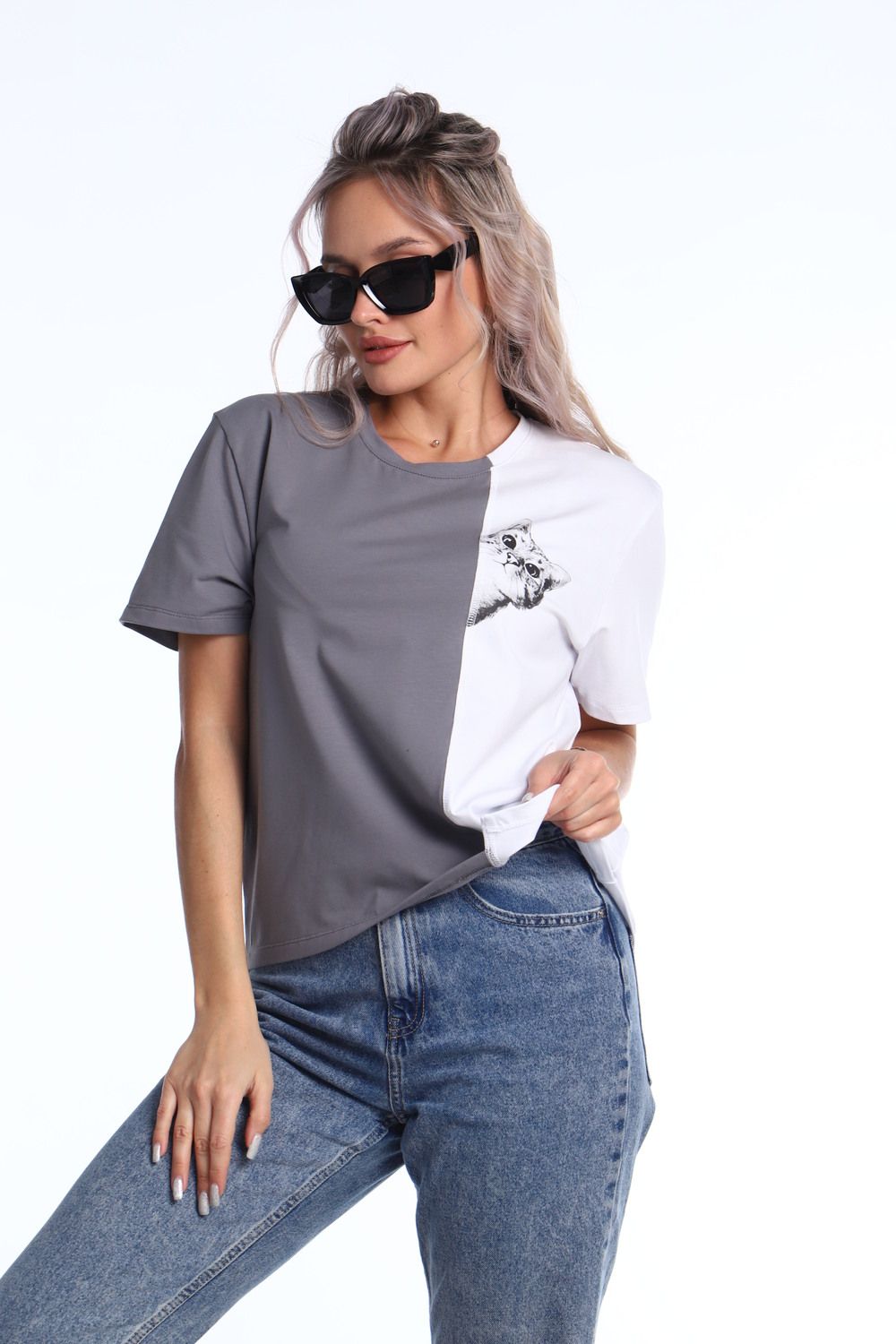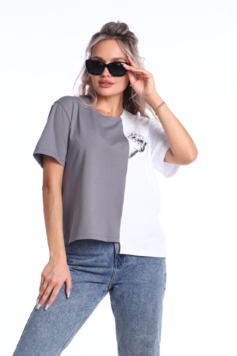 Футболка женская с оригинальным принтом, из хлопковой ткани с лайкрой. Ткань держит форму, не вытягивается, приятная на ощупь. Стильная футболка классического фасона со спущенным рукавом. Посадка свободная. Такая модель подойдет абсолютно всем и станет необходимой вещью в вашем гардеробе.