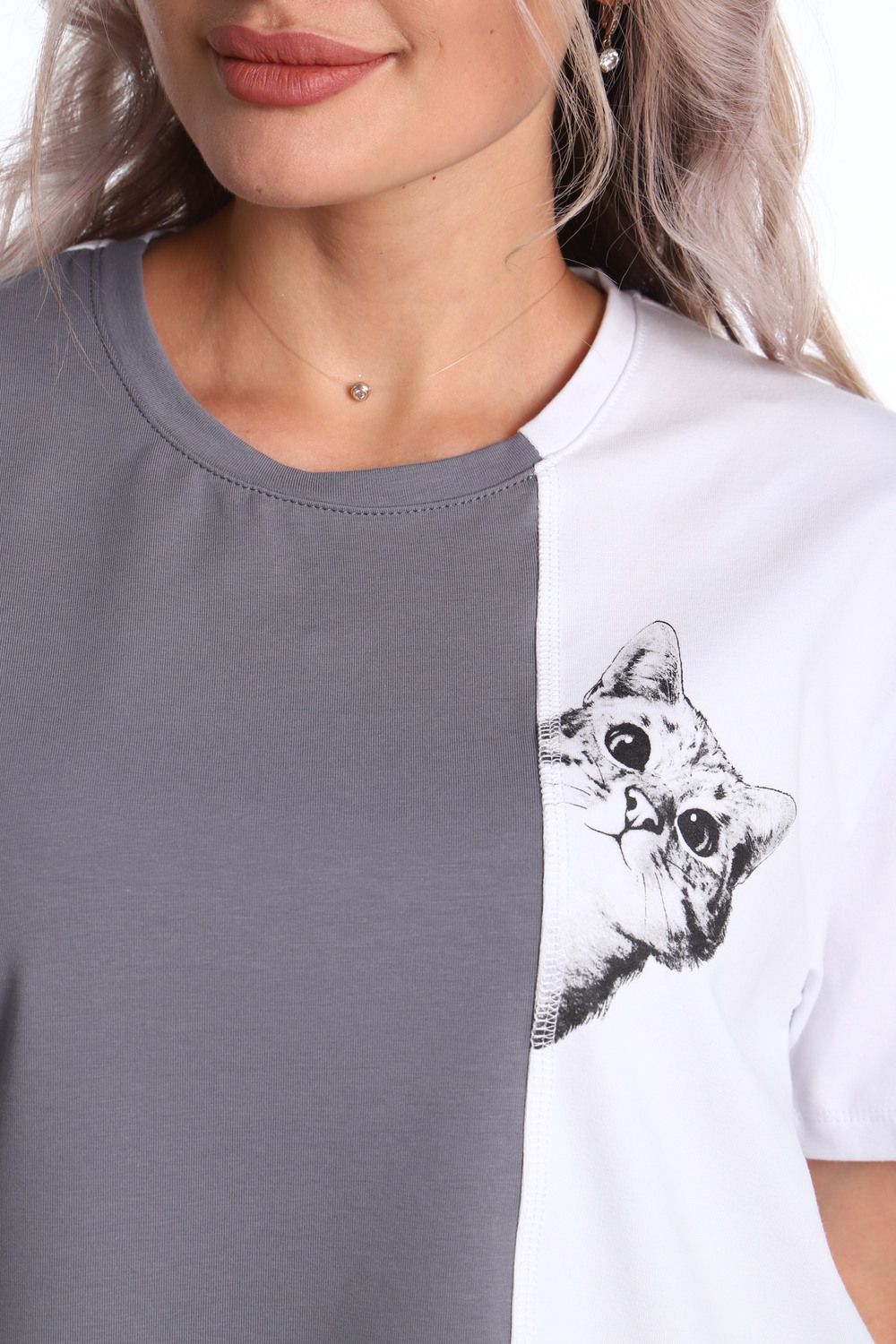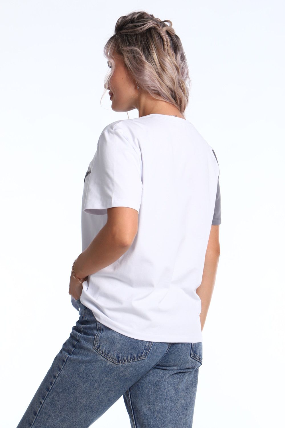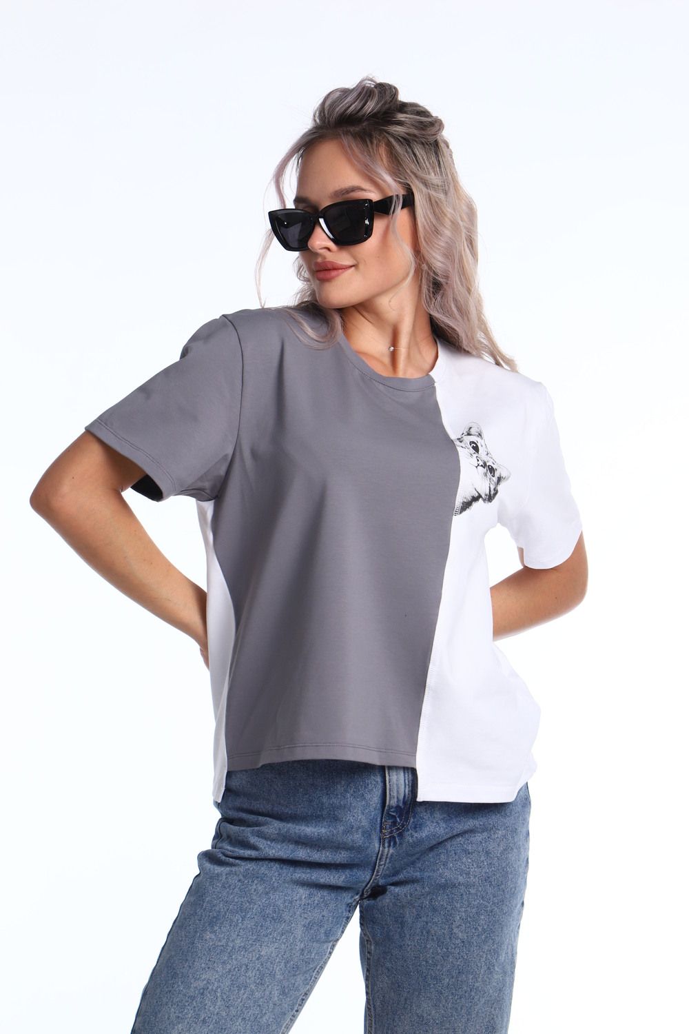 Футболка женская с оригинальным принтом, из хлопковой ткани с лайкрой. Ткань держит форму, не вытягивается, приятная на ощупь. Стильная футболка классического фасона со спущенным рукавом. Посадка свободная. Такая модель подойдет абсолютно всем и станет необходимой вещью в вашем гардеробе.