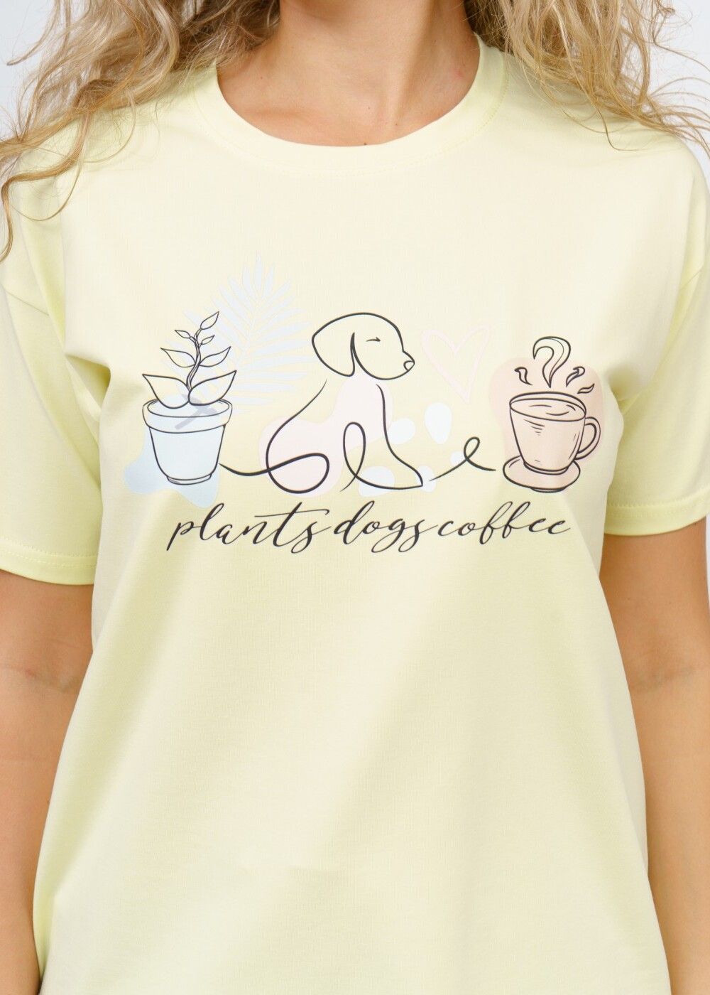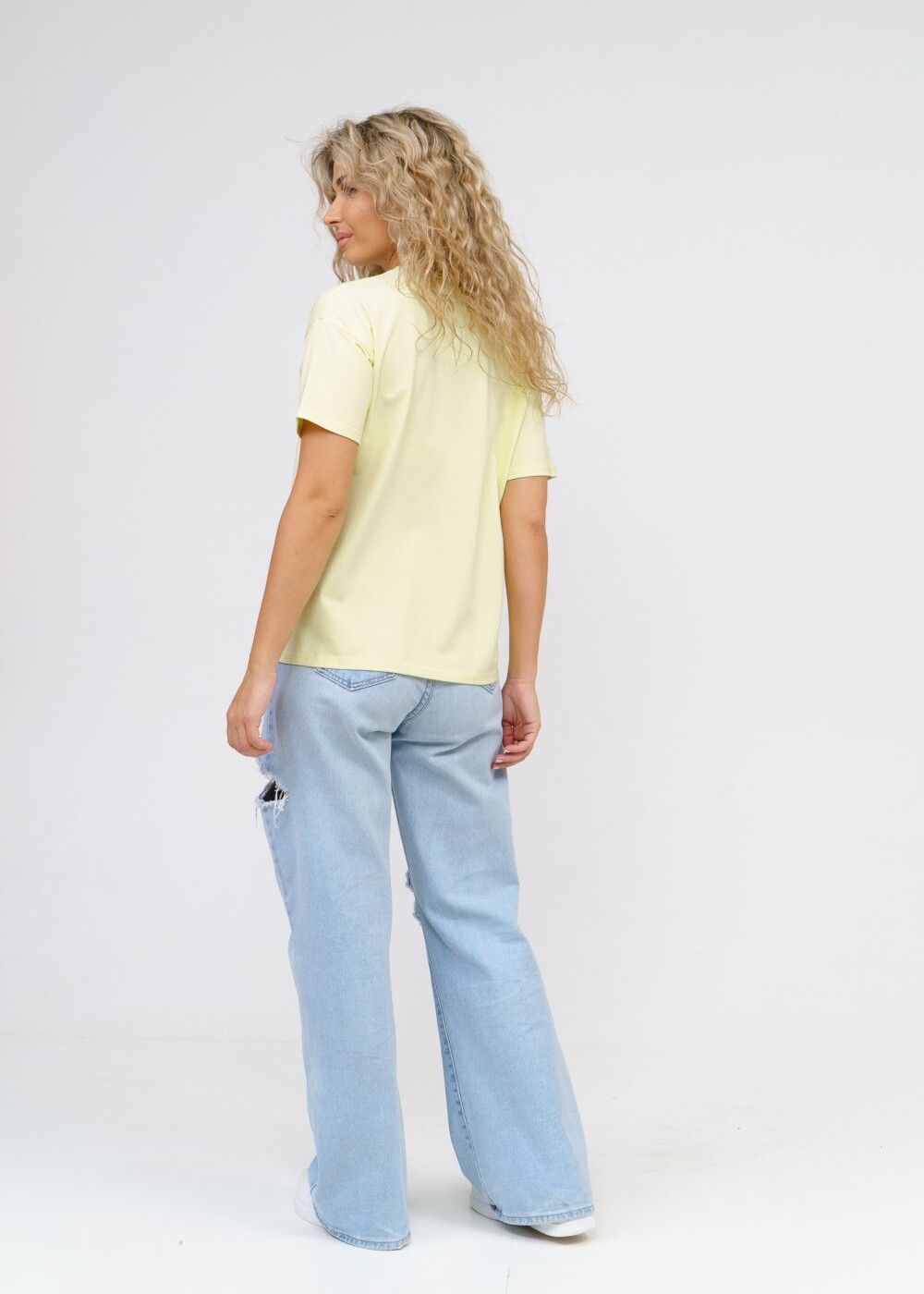 Футболка женская прямого силуэта, длиной до середины бедра. Рукав втачной, короткий. Горловина округлой формы. На полочку футболки нанесен принт.