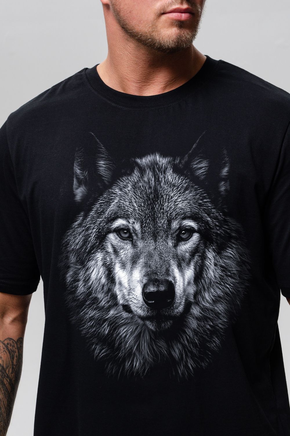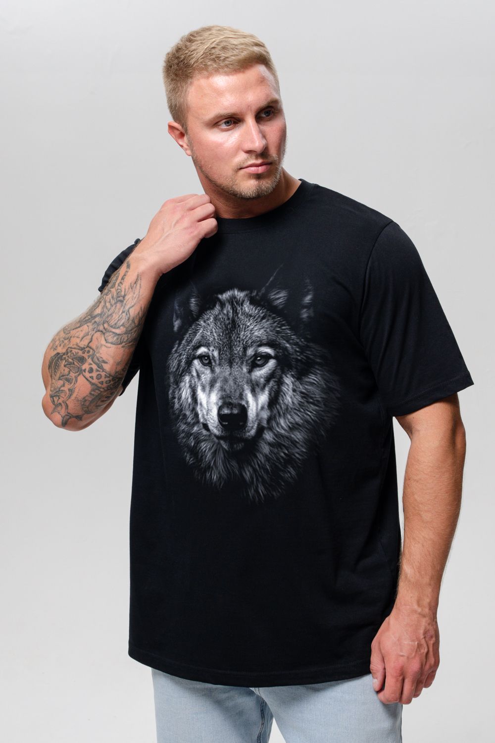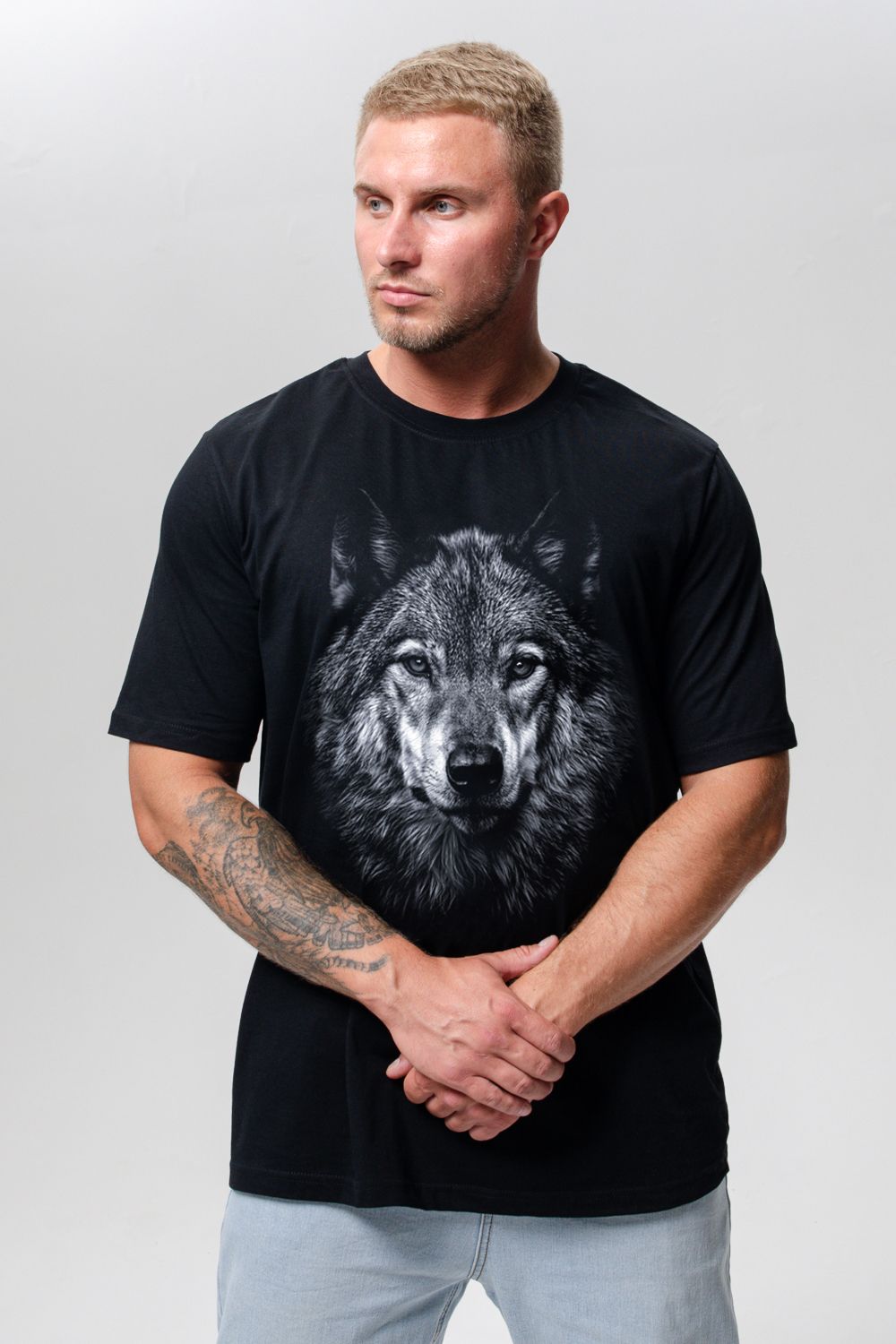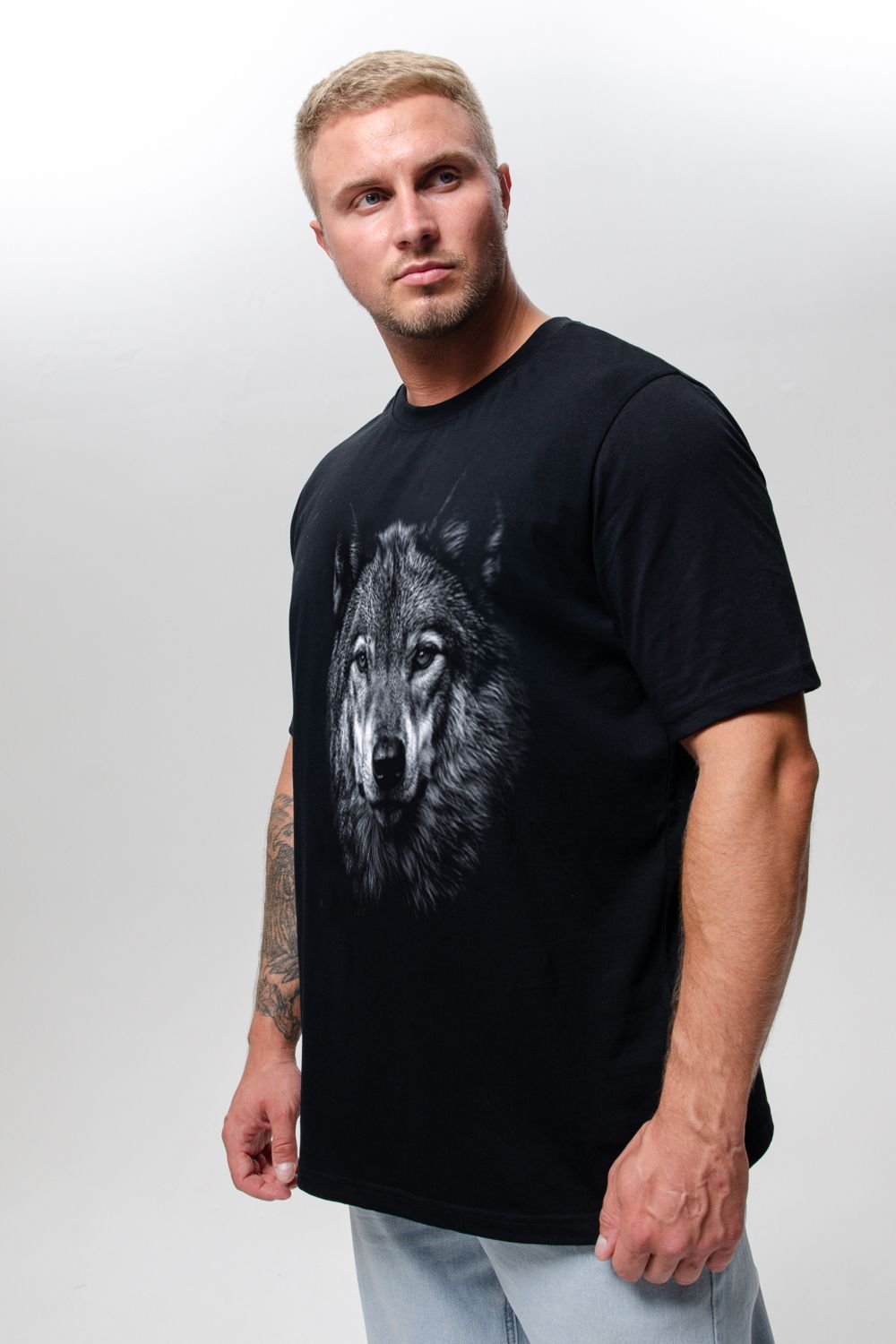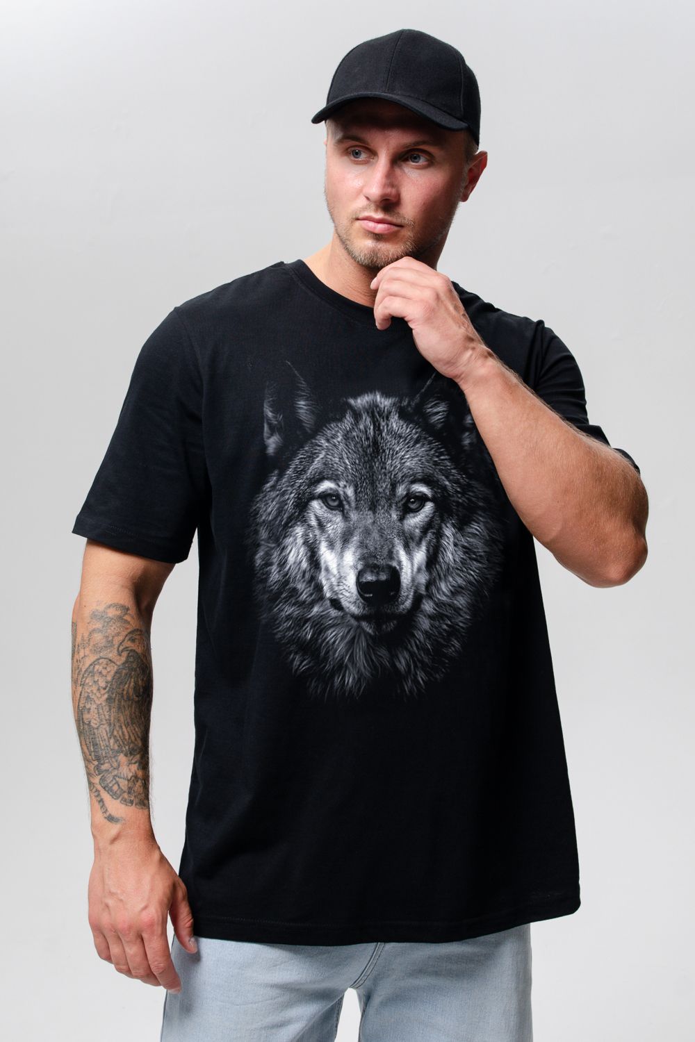 Футболка прямая, свободная, средней длины, с округлой горловиной. Рукав короткий. Горловина обработана эластичной обтачкой. Изображение волка возможно другое.