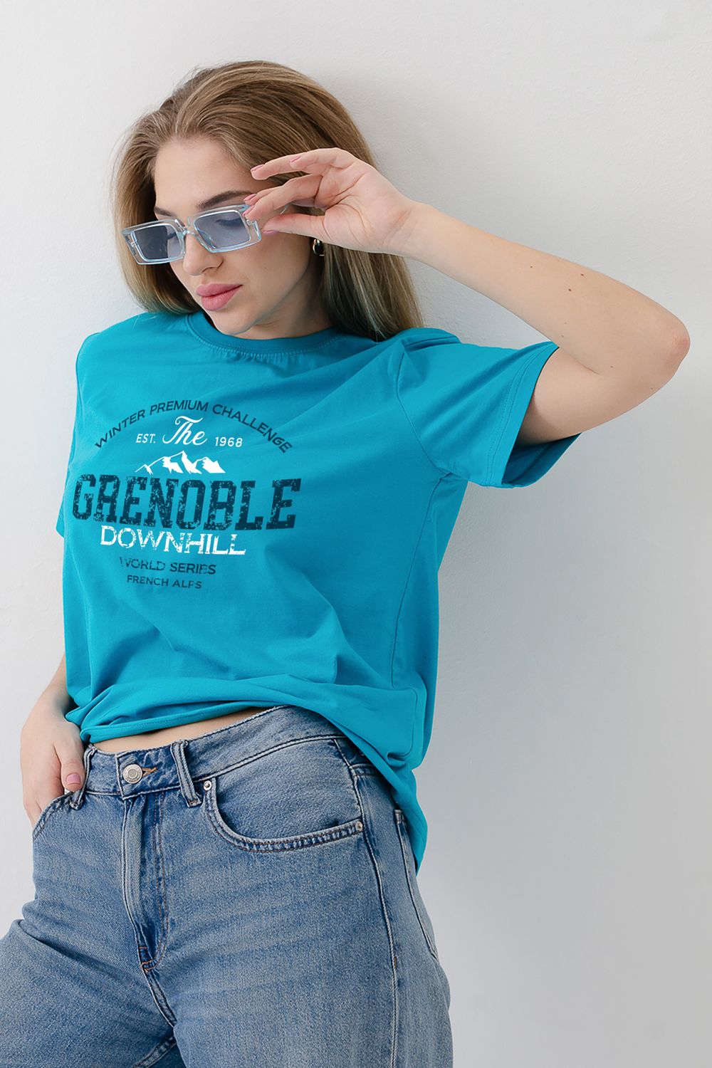 Футболка прямая, свободная, средней длины, с округлой горловиной. Рукав короткий. Горловина обработана эластичной обтачкой. Размер на вшивной этикетке возможен двойной, ориентируйтесь по меньшему размеру. В цвете изумруд возможен разнотон.