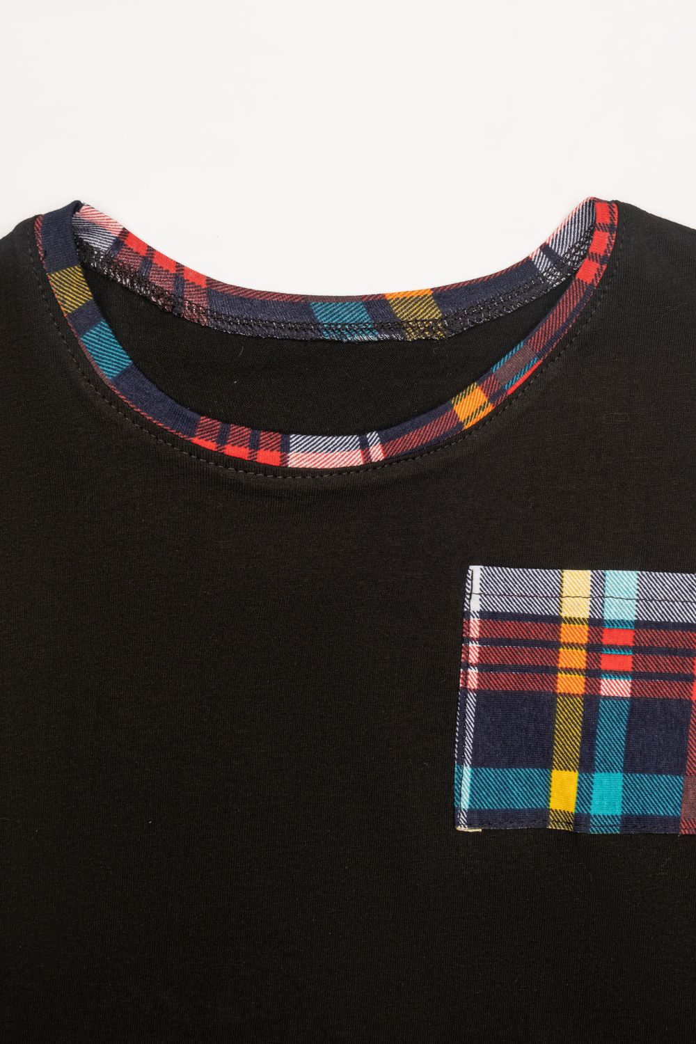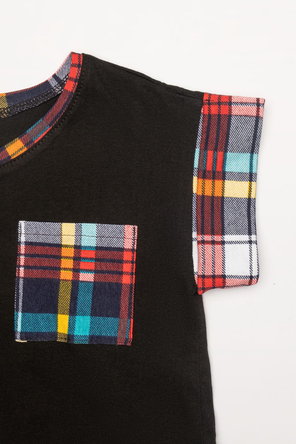 Черная футболка с клетчатыми элементами. Сшита из кулирки, которая отличается своим комфортом и легкостью в уходе. Футболку можно комбинировать со многими вещами гардероба девочки.