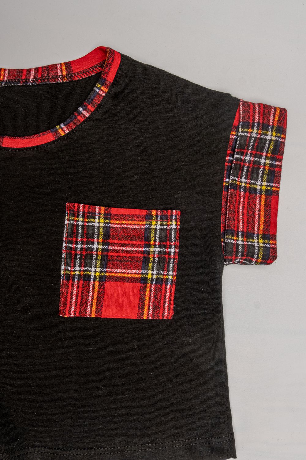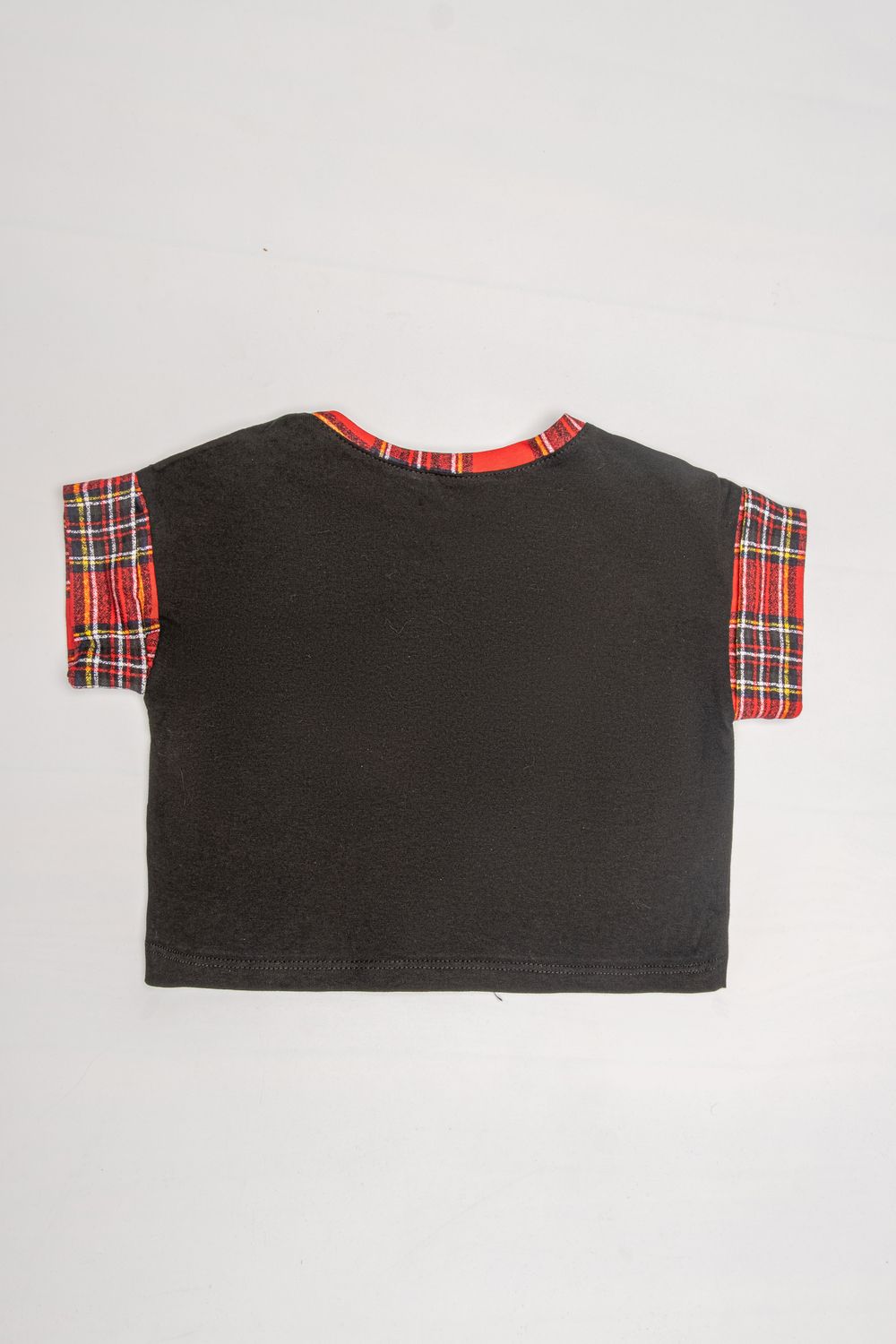 Черная футболка с клетчатыми элементами. Сшита из кулирки, которая отличается своим комфортом и легкостью в уходе. Футболку можно комбинировать со многими вещами гардероба девочки.