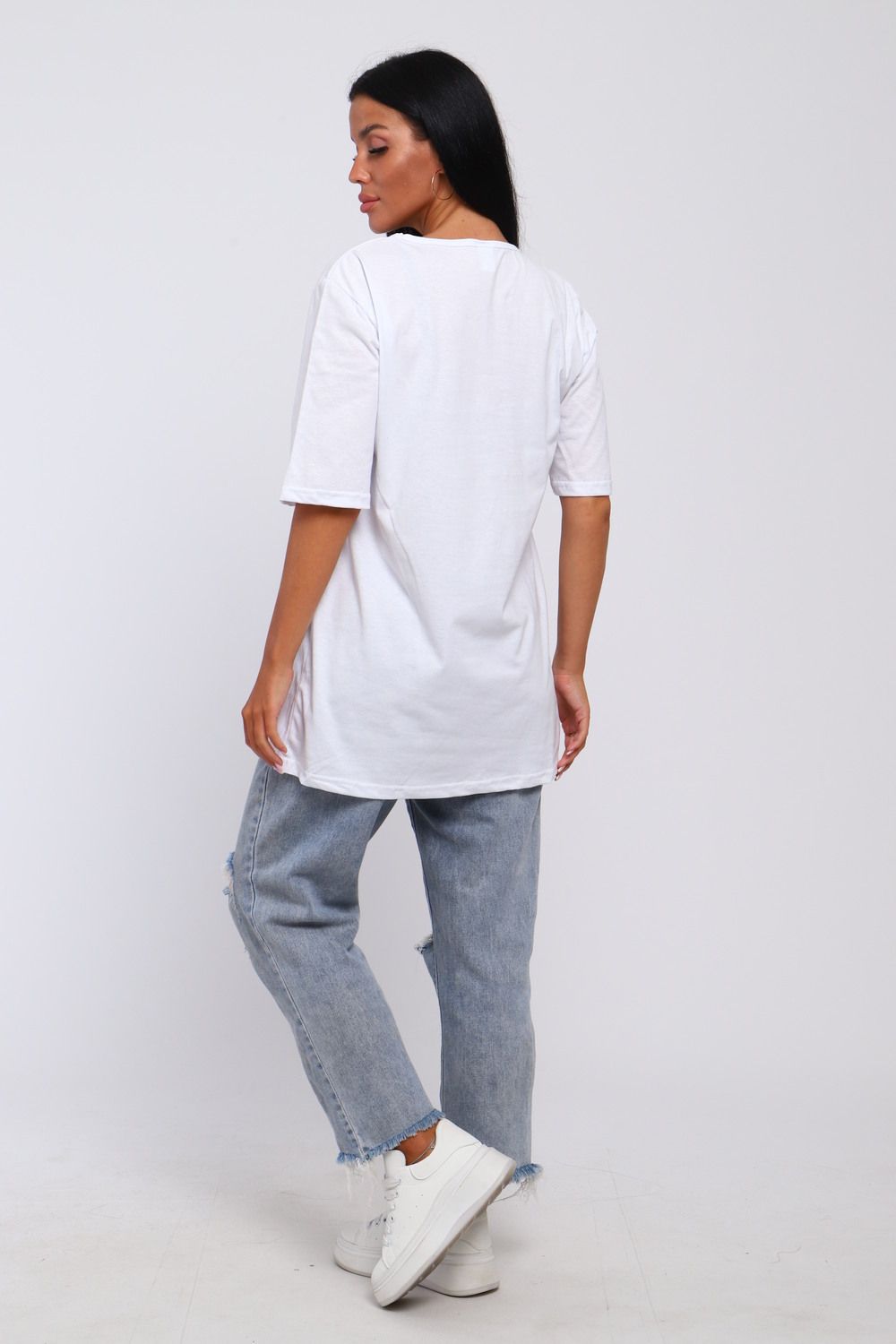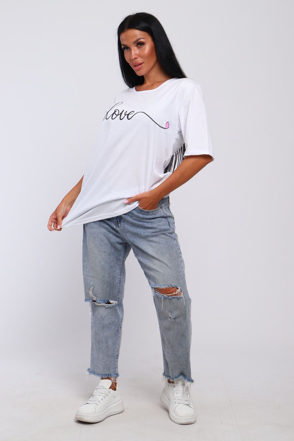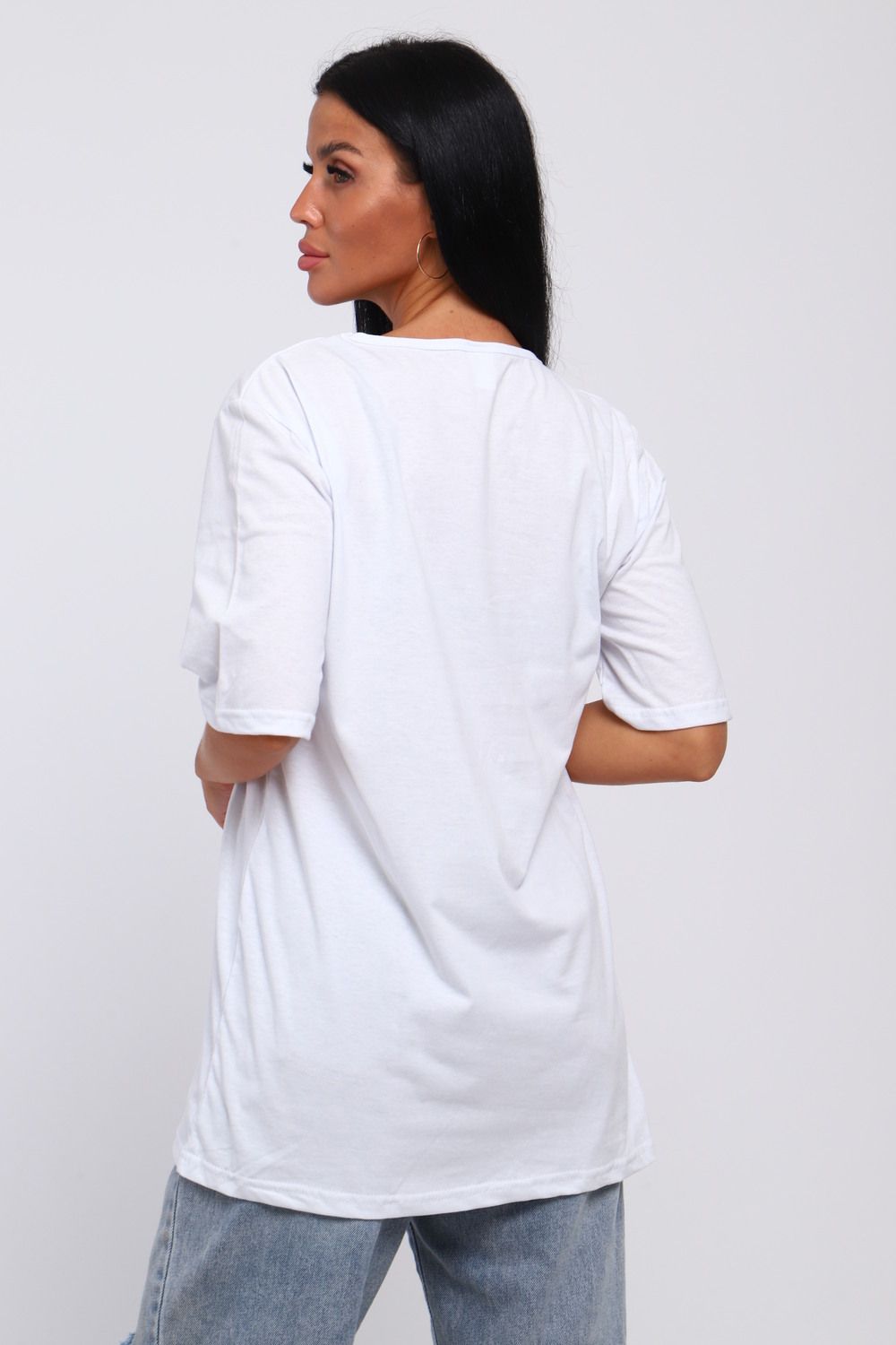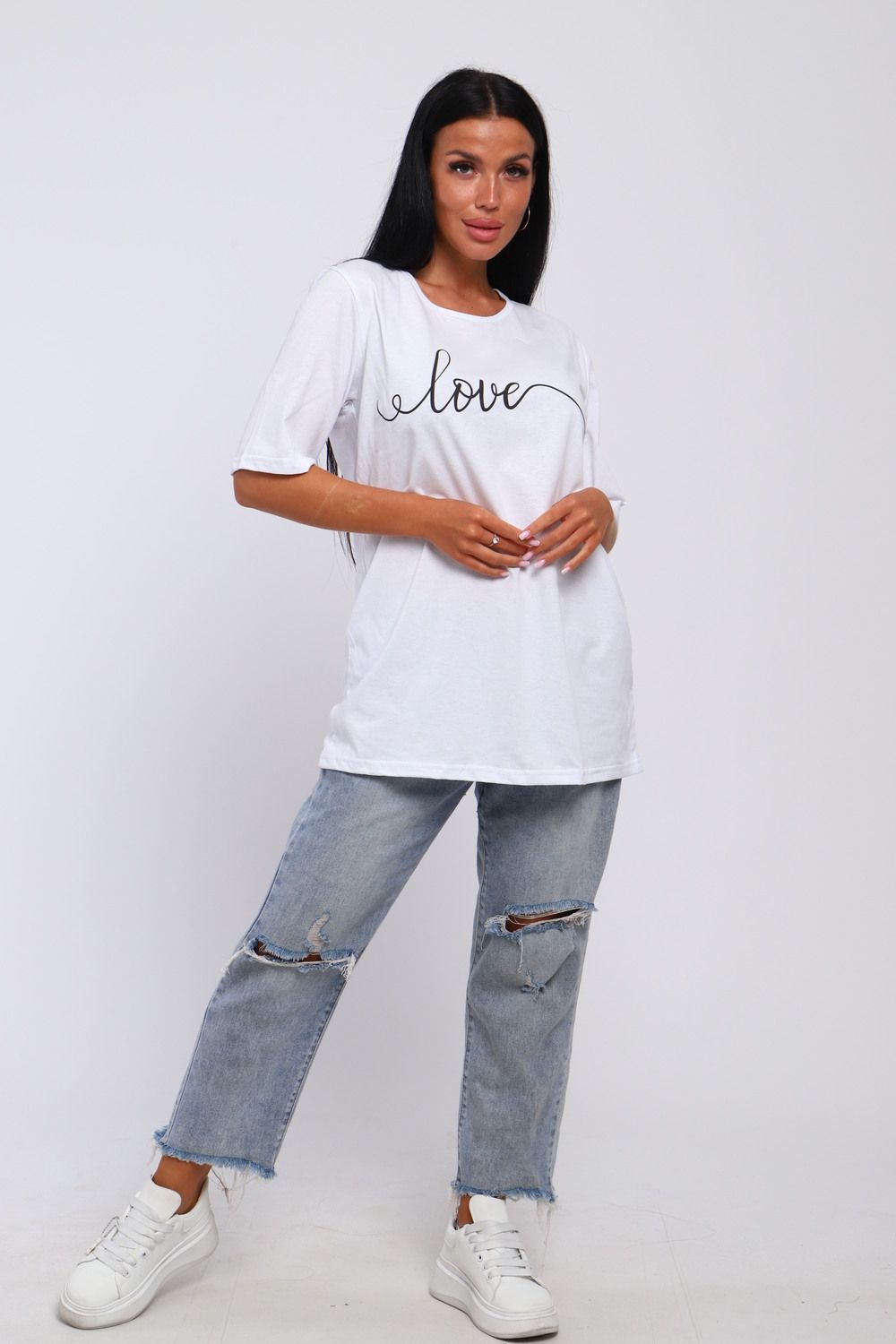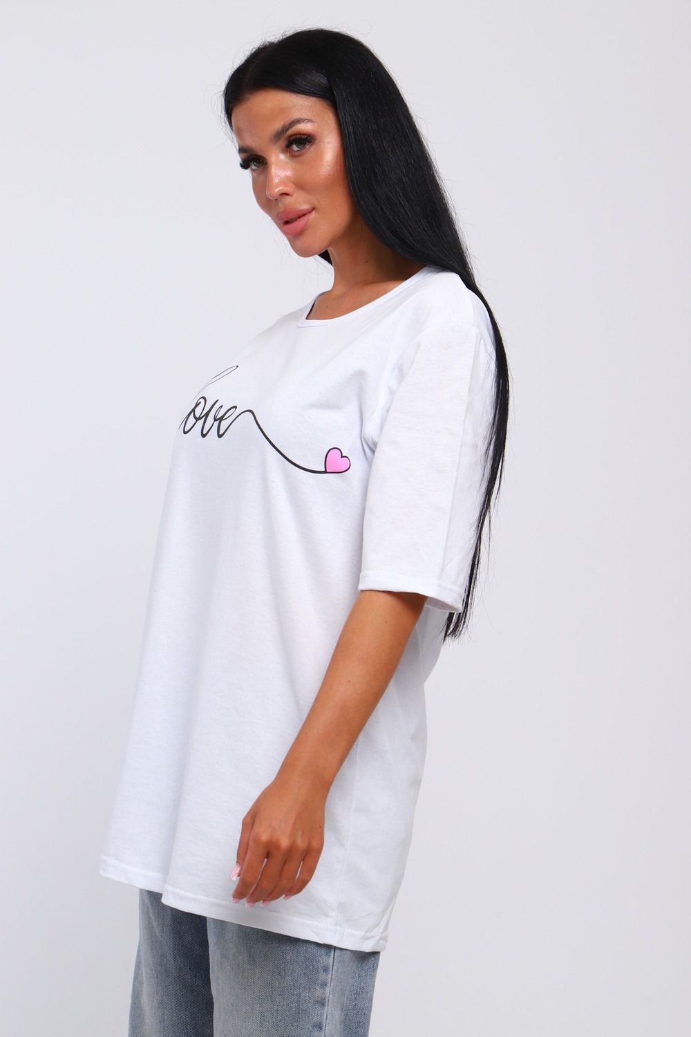 Футболка базовая из 100% хлопка. Свободный фасон прямого силуэта и рукав до локтя со спущенным плечом обеспечивают свободу движений. Крой oversize будет хорошо продаваться в любое время года. Широкий размерный ряд от 48 до 66 включает большие размеры. Качественный трикотаж и модный принт сердца подойдет любой аудитории от подростков для взрослых дам.