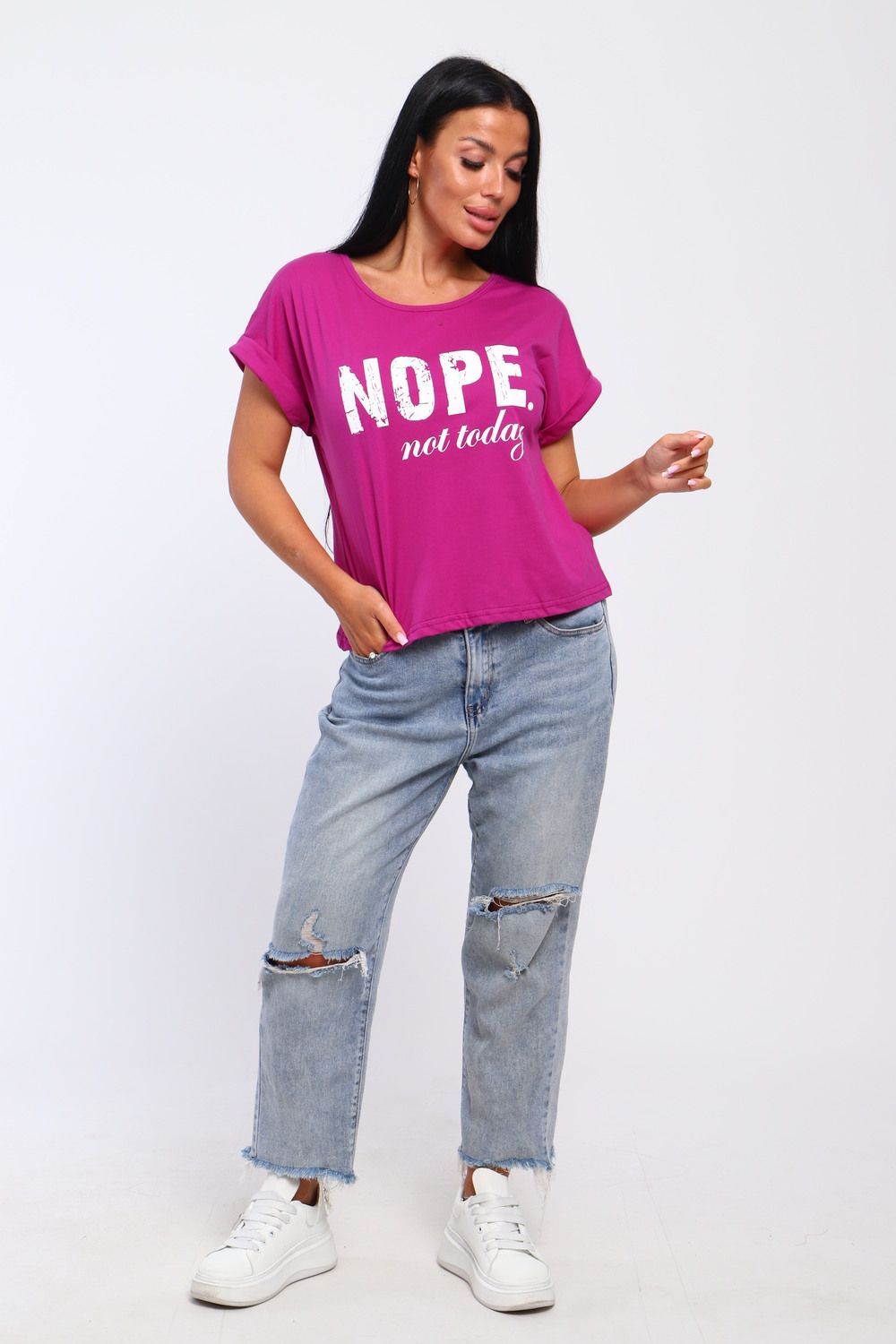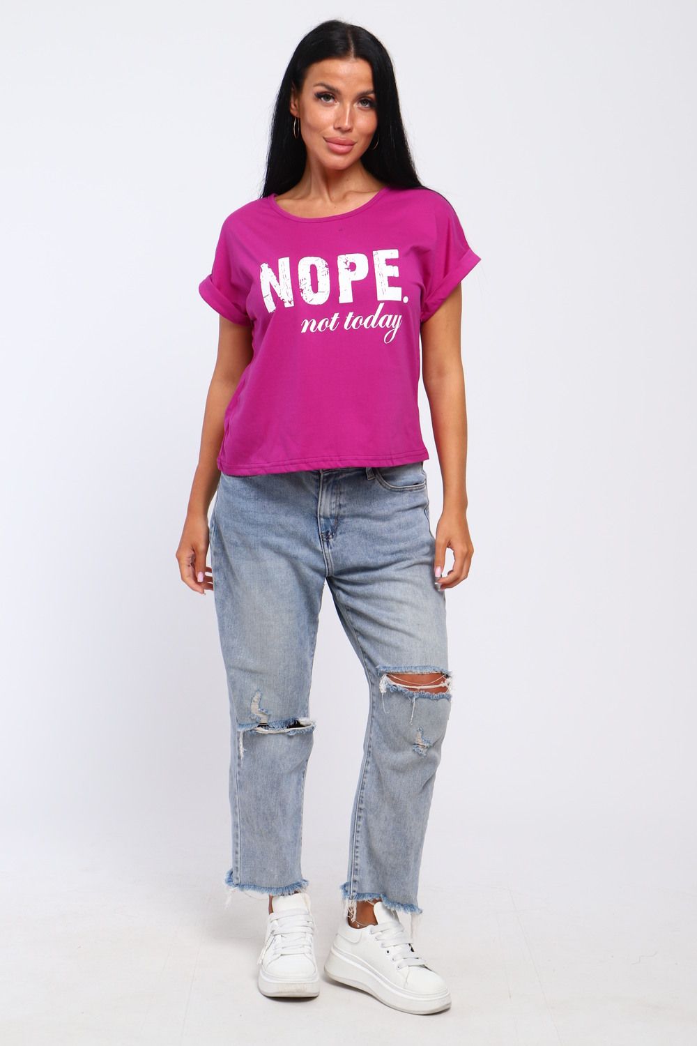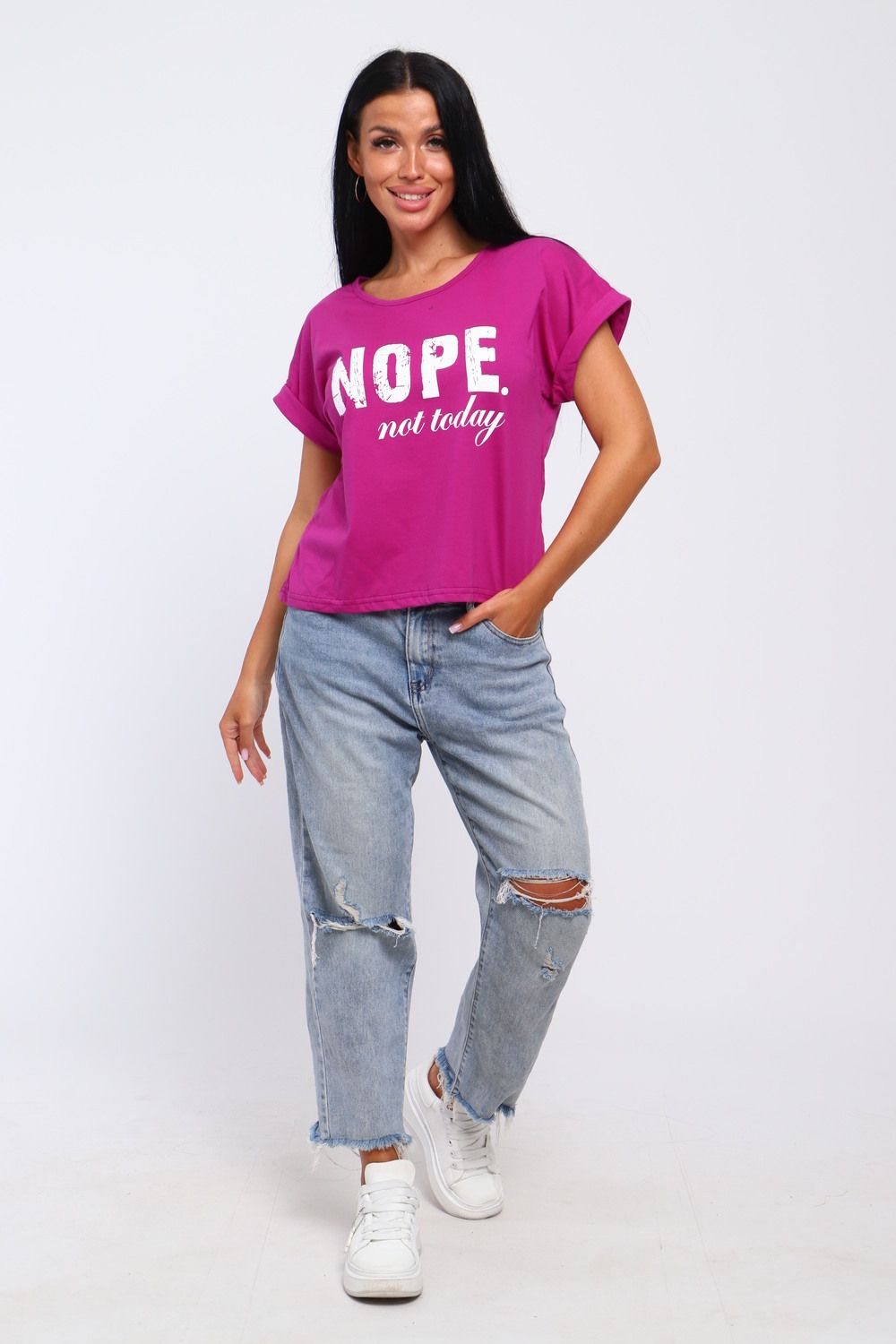 Футболка женская укороченная со спущенным плечом, округлым вырезом горловины и широкими рукавами с подворотами. Свободный крой и оригинальная надпись «Nope» делает ее актуальной в любом сезоне лето, осень. Современный дизайн и оригинальный крой подойдет для девушек подростков и более взрослой аудитории. Состоит из 100% хлопка (кулирка).