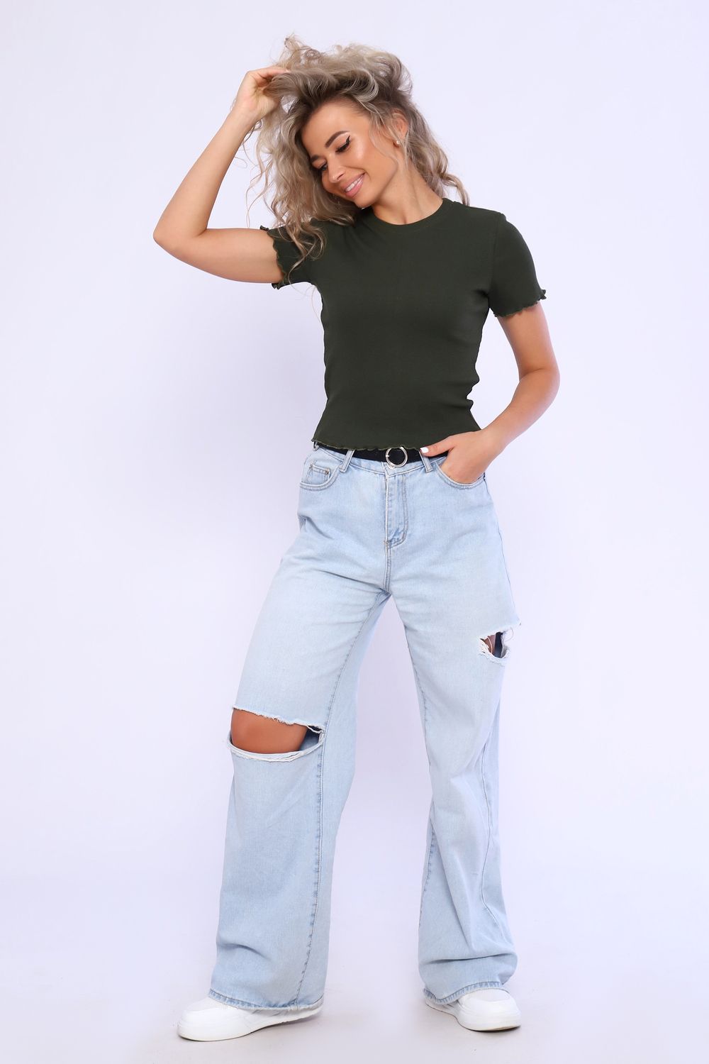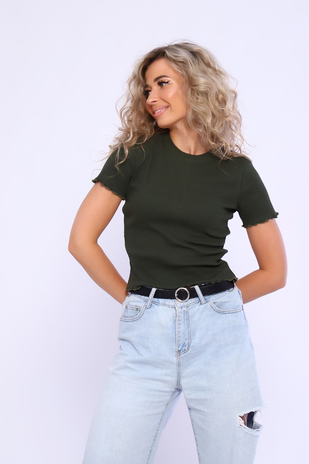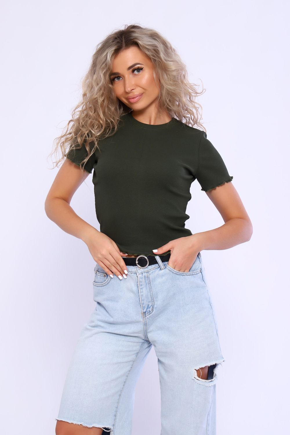 Футболка - топ укороченная молодежная, выполнена из мягкого приятного к телу кашкорсе. Рукав короткий обработан под краевку и так же низ изделия. На модели 46 размер.