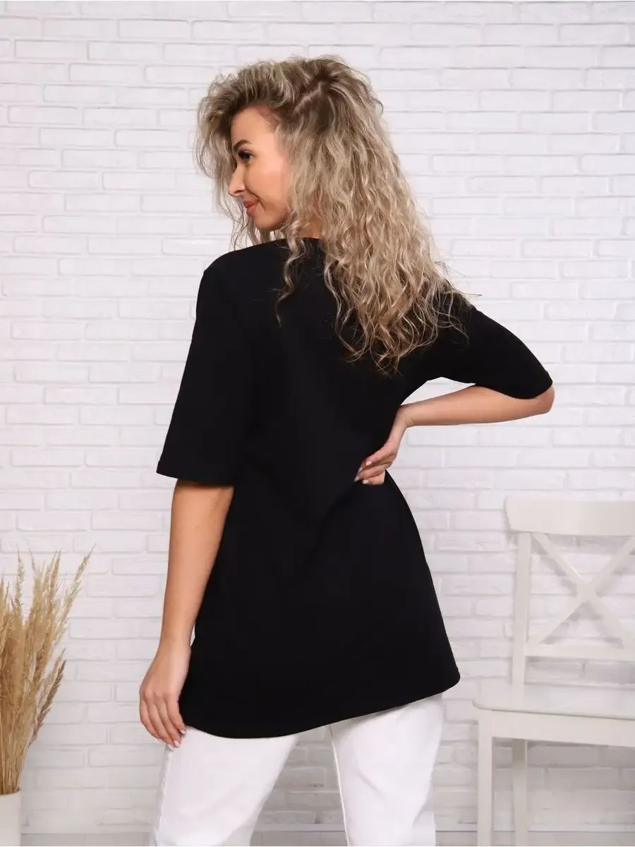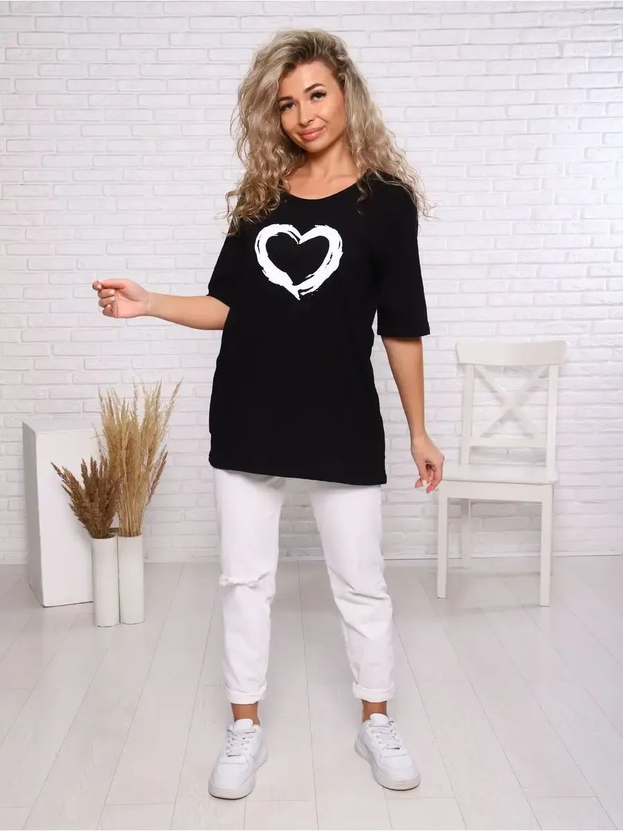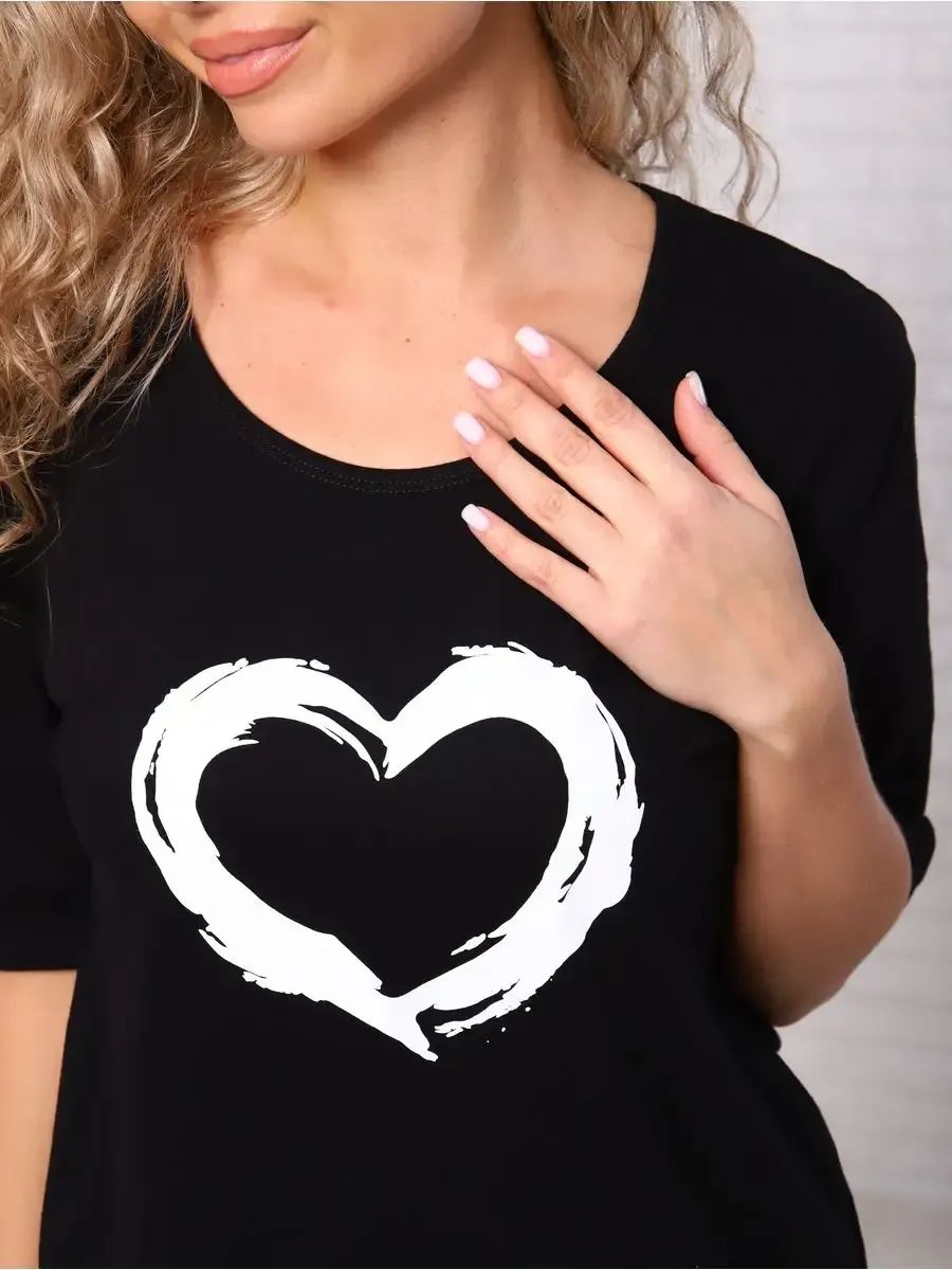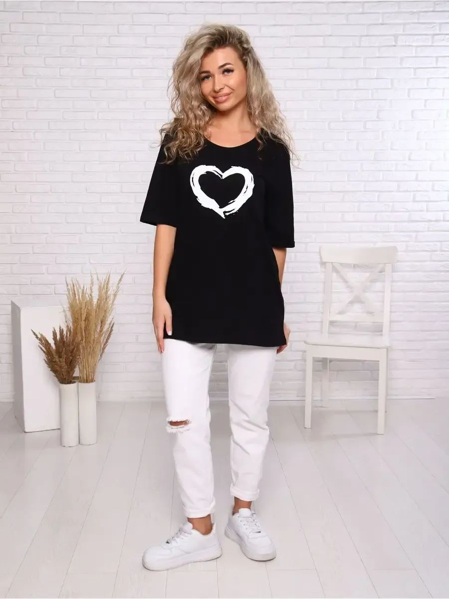 Футболка женская удлиненная с рисунком в виде сердца. Футболка с широким втачным рукавом, что делает его свободным и футболка не сковывает движений. Футболка свободного кроя из натурального дышащего хлопка - прекрасный базовый вариант одежды на любой сезон. Подходит в качестве домашней одежды, одежды на работу и для прогулок.