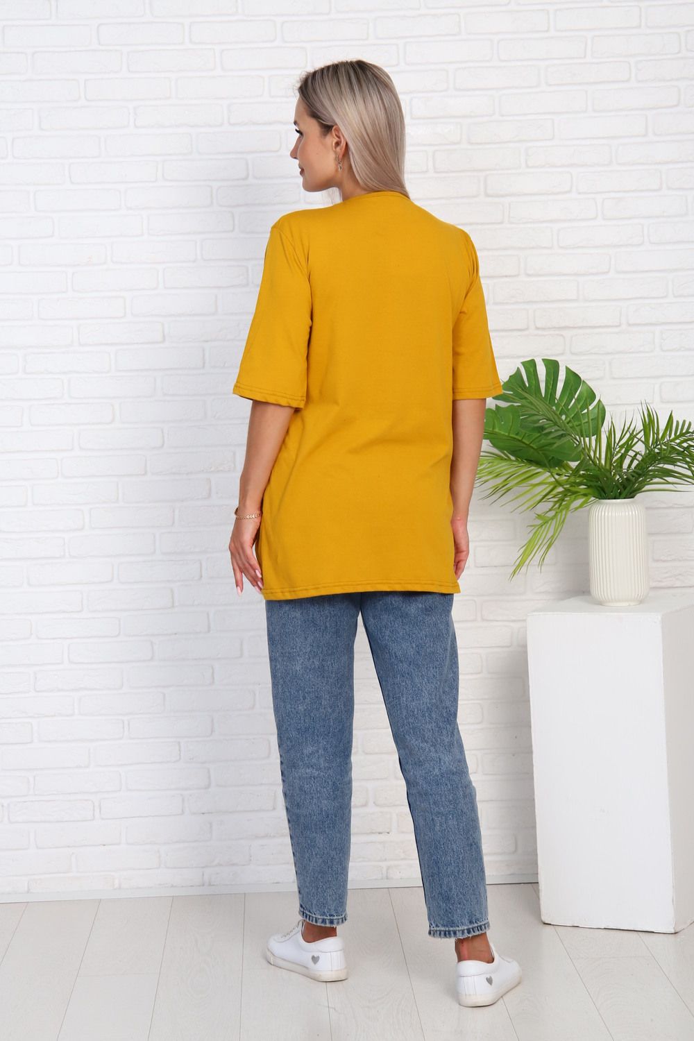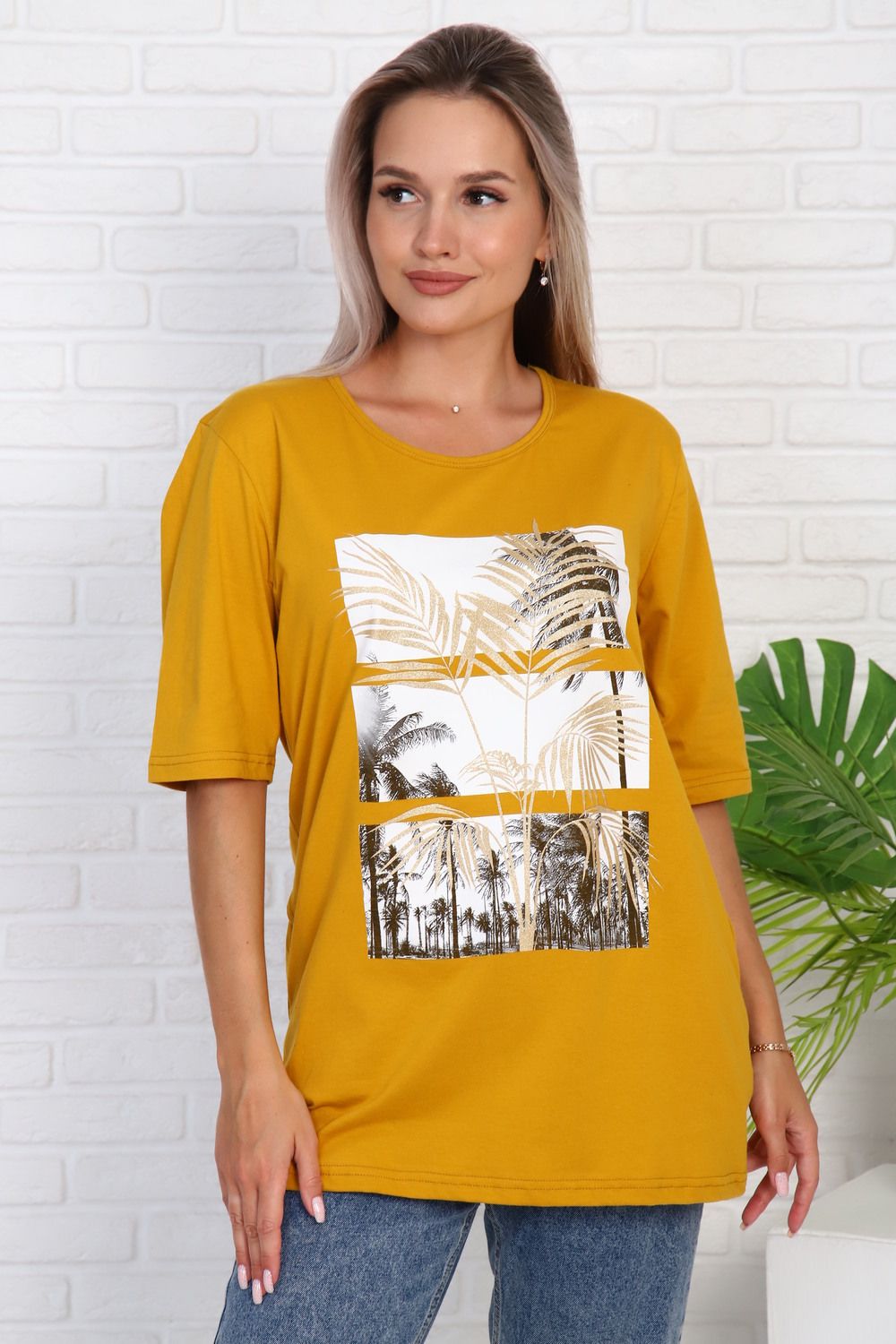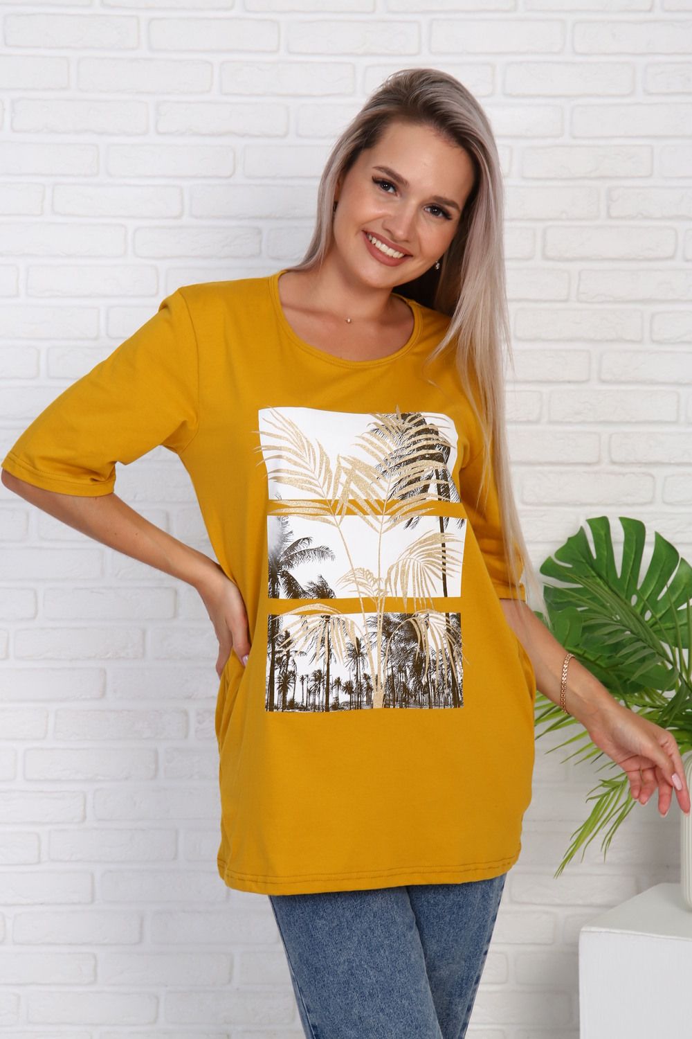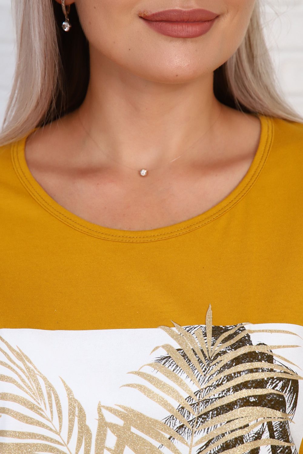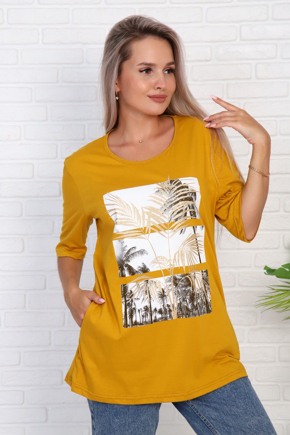 Футболка удлиненная с рисунком листья пальмы, Арт. 786 - горчичный
