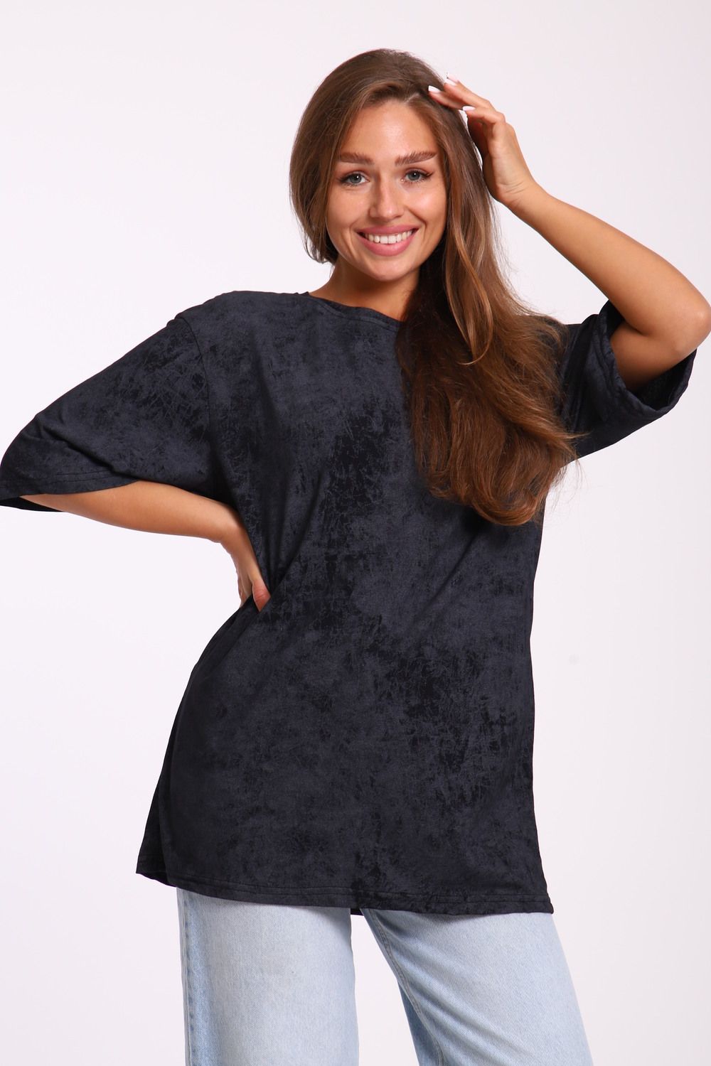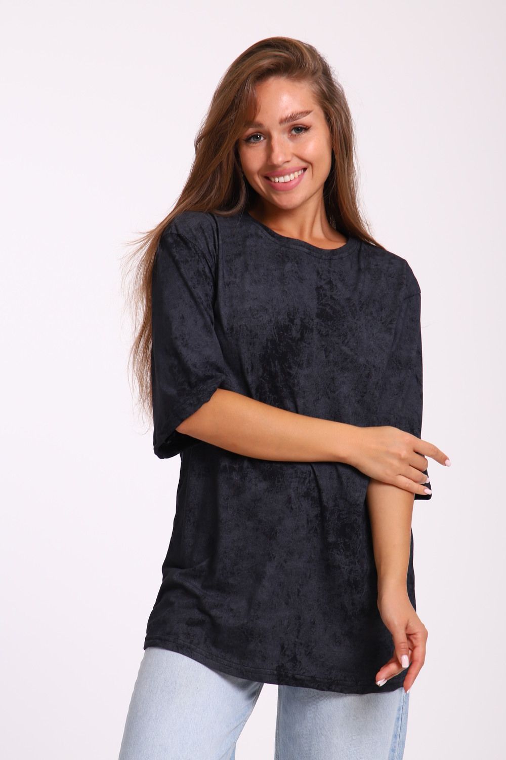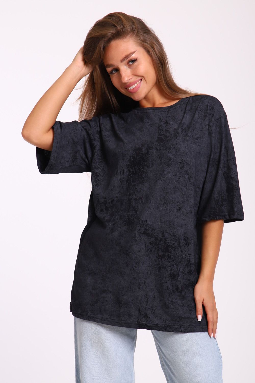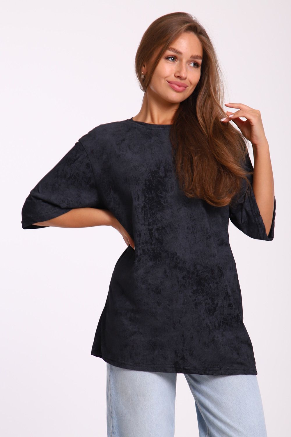 Футболка оверсайз свободного кроя самой актуальной в этом сезоне расцветки - варенка. Варенка - это состаренный и потертый окрас ткани. У футболки спущенная линия плеча. Отлично подойдет в офис, университет, школу, на повседневную носку и немного разбавит деловой стиль, если надеть под пиджак.