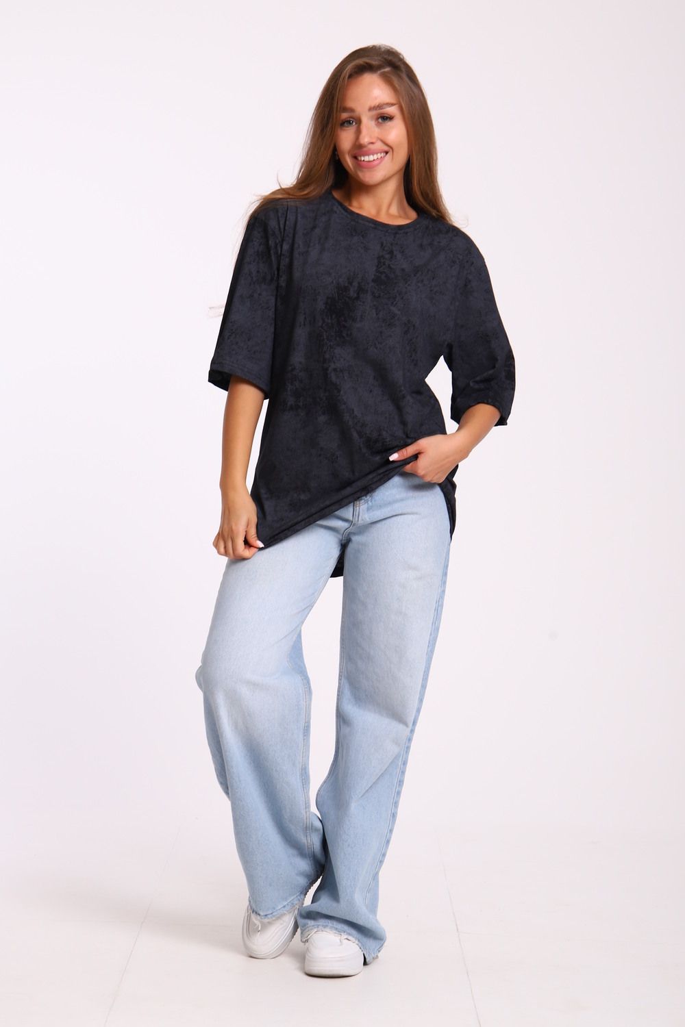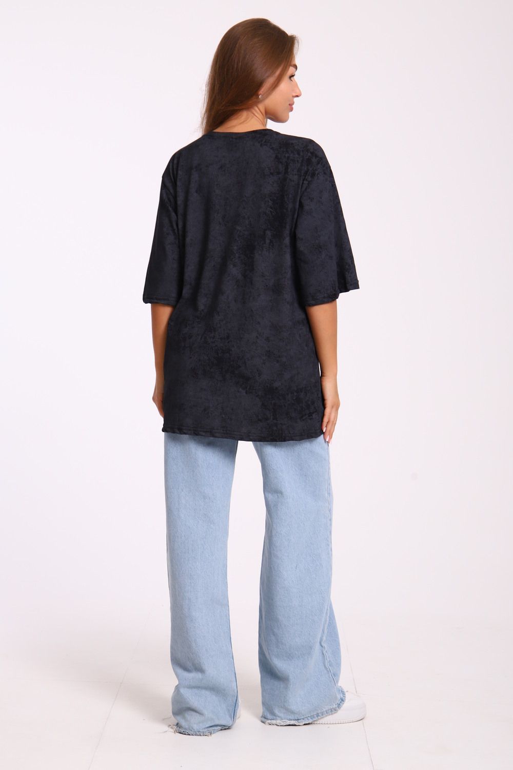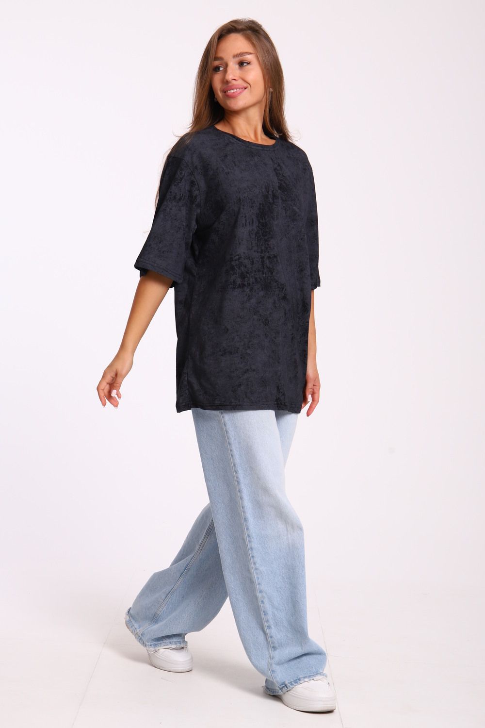 Футболка оверсайз свободного кроя самой актуальной в этом сезоне расцветки - варенка. Варенка - это состаренный и потертый окрас ткани. У футболки спущенная линия плеча. Отлично подойдет в офис, университет, школу, на повседневную носку и немного разбавит деловой стиль, если надеть под пиджак.