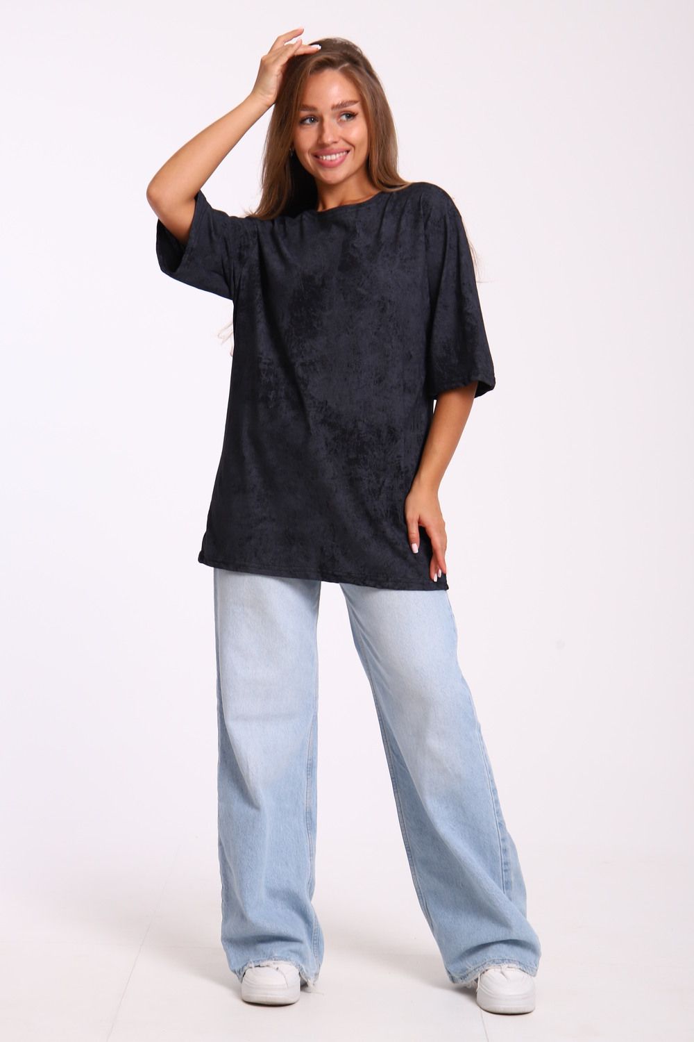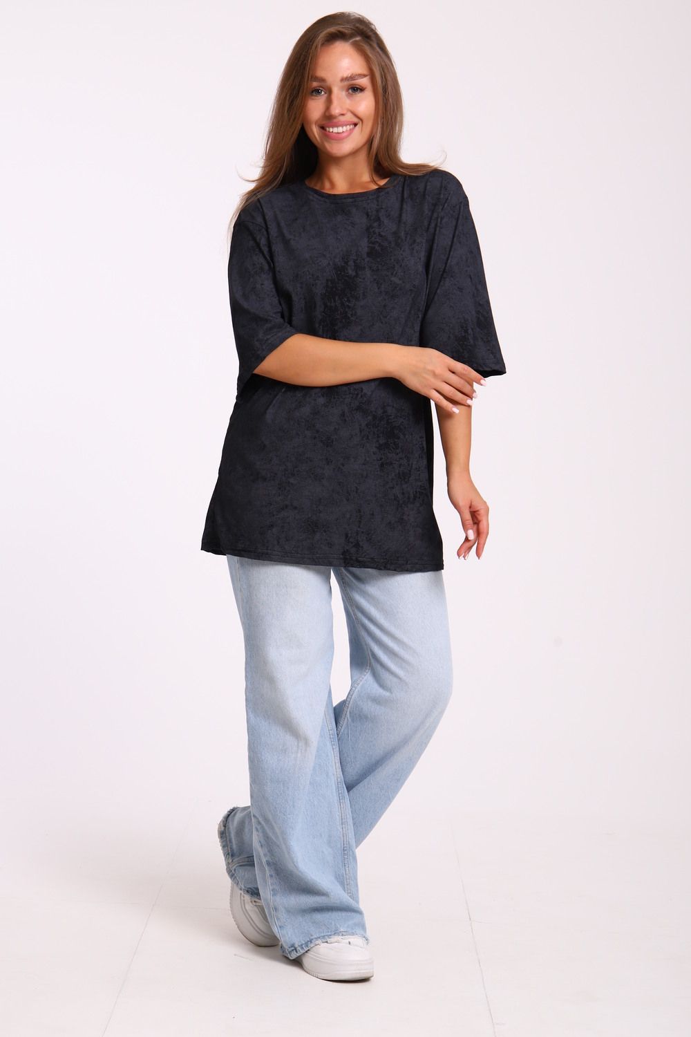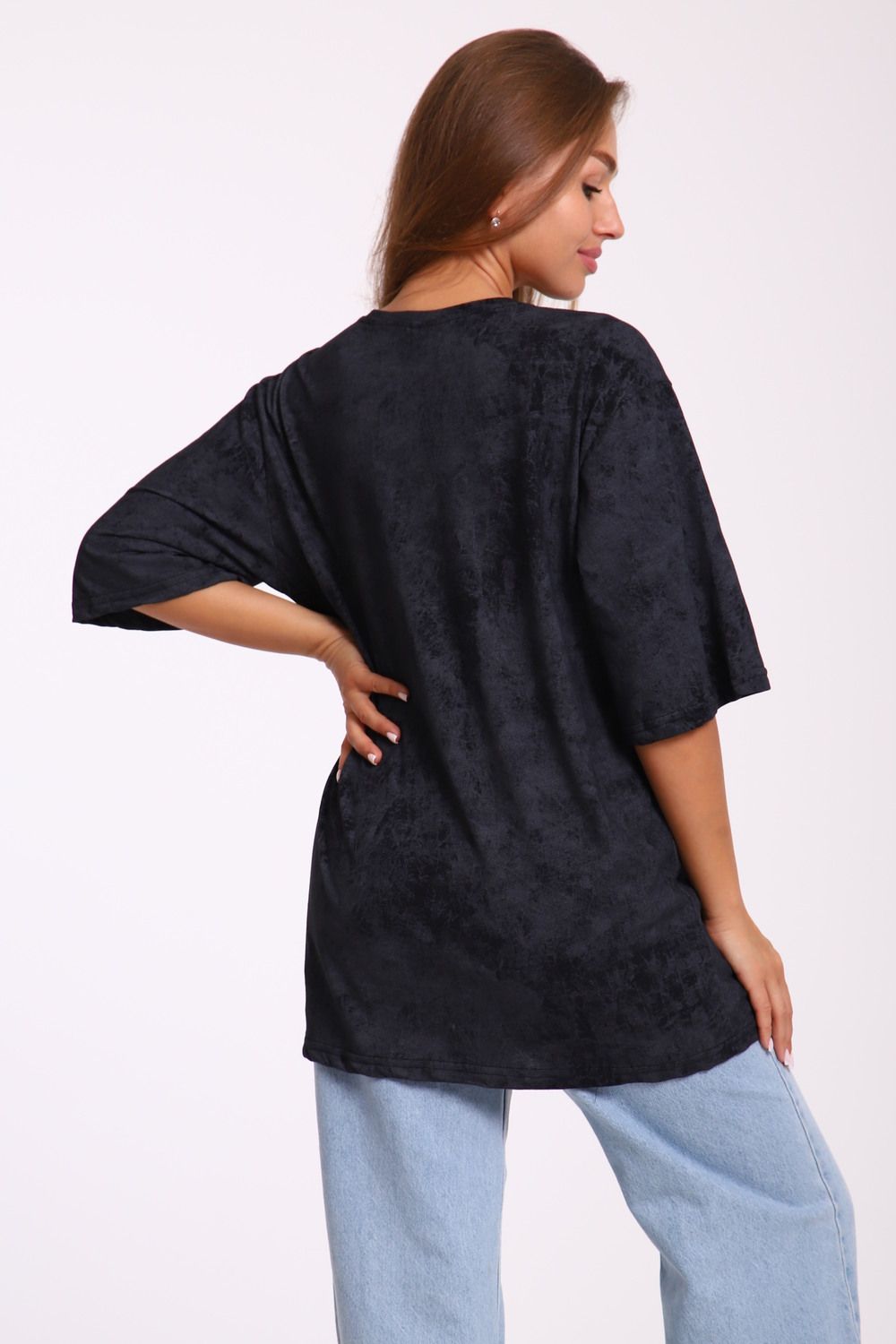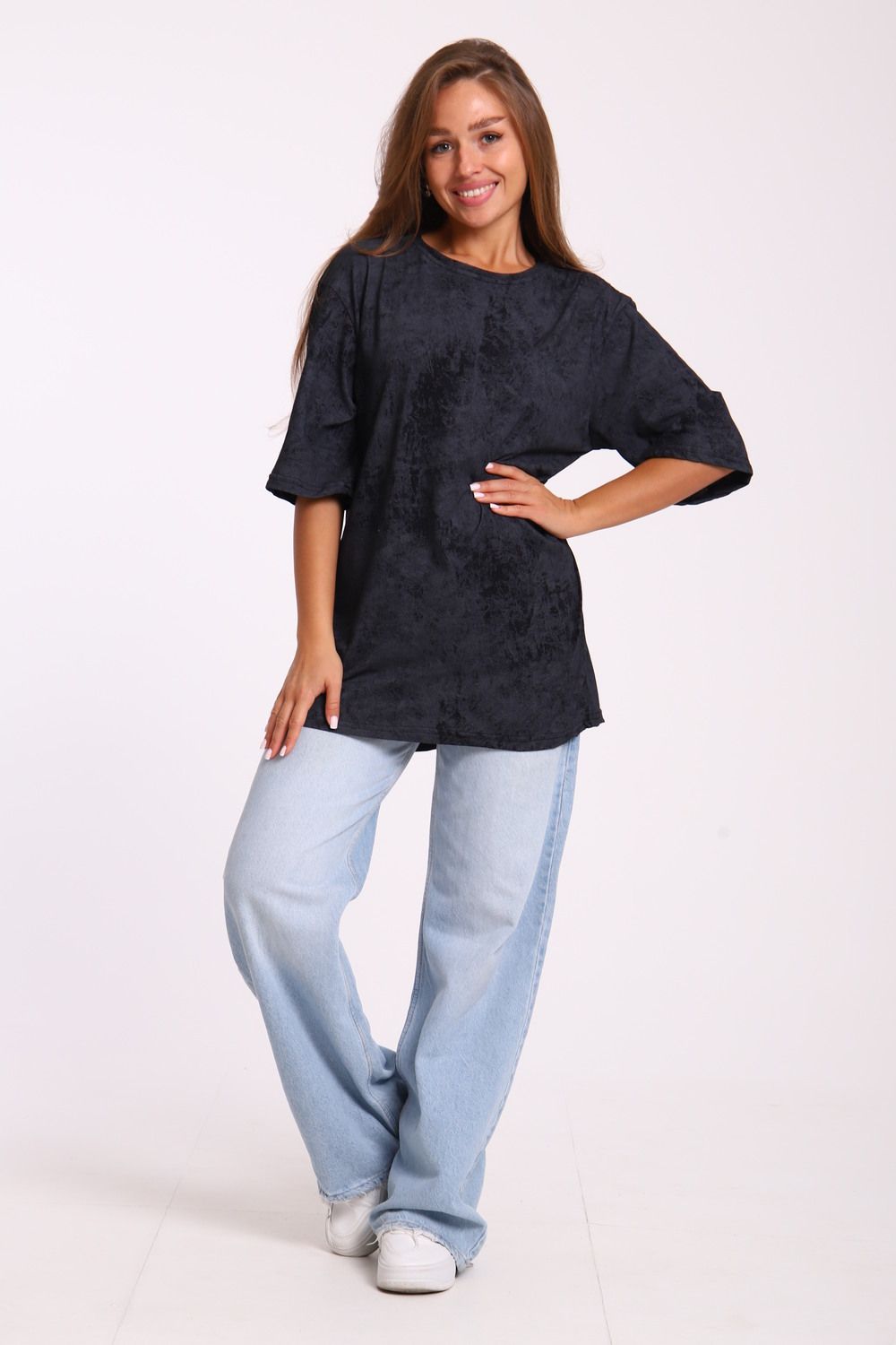 Футболка оверсайз свободного кроя самой актуальной в этом сезоне расцветки - варенка. Варенка - это состаренный и потертый окрас ткани. У футболки спущенная линия плеча. Отлично подойдет в офис, университет, школу, на повседневную носку и немного разбавит деловой стиль, если надеть под пиджак.
