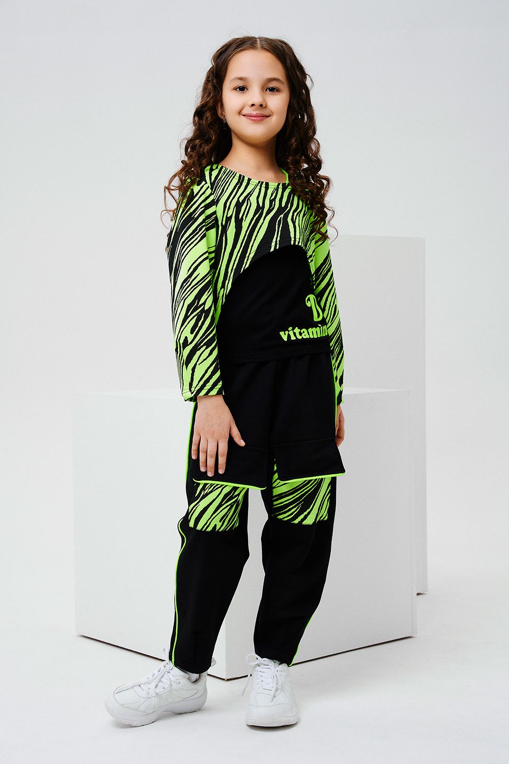 Стильный детский спортивный костюм для девочек(весна-лето), состоит из майки, лонгслива и брюк (джоггеров). Лонгслив укороченный свободного кроя с длинными рукавами, дополняется удлинённой майкой с ярким печатным принтом. Штаны - джоггеры свободного кроя на широком эластичном поясе. На передних половинках брюк накладные карманы с клапанами. Боковые швы и низ клапанов оформлены ярким кантом. Комфортный костюм, удобен в носке и подойдет на каждый день для повседневного использования, активного отдыха и спорта. Рекомендована деликатная стирка не выше 30 градусов. Состав по тканям: футер 2-х нитка с лайкрой хлопок 72%, ПЭ 20%, эластан 8%, кашкорсе: вискоза 92% лайкра 8%; кулирка с лайкрой: хлопок 95% лайкра 5%