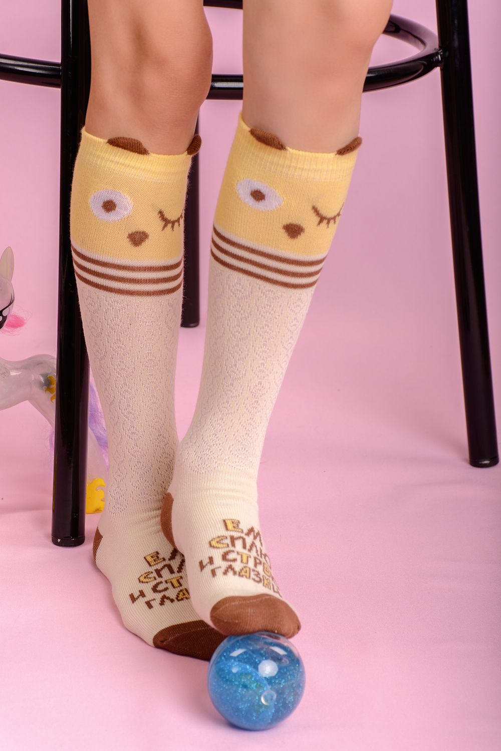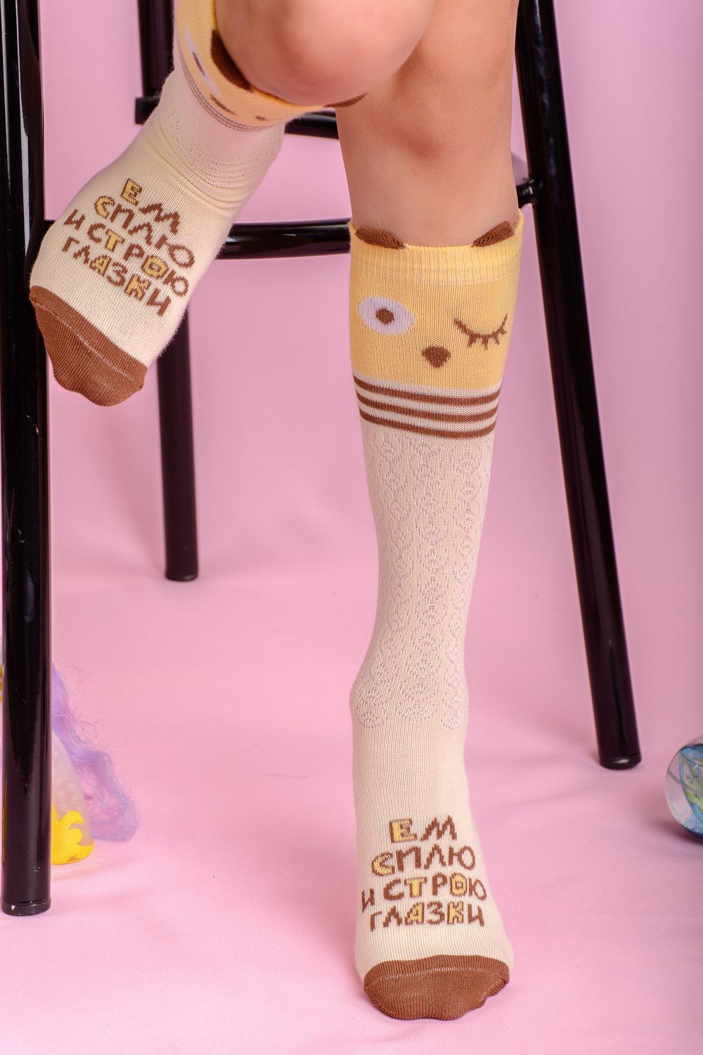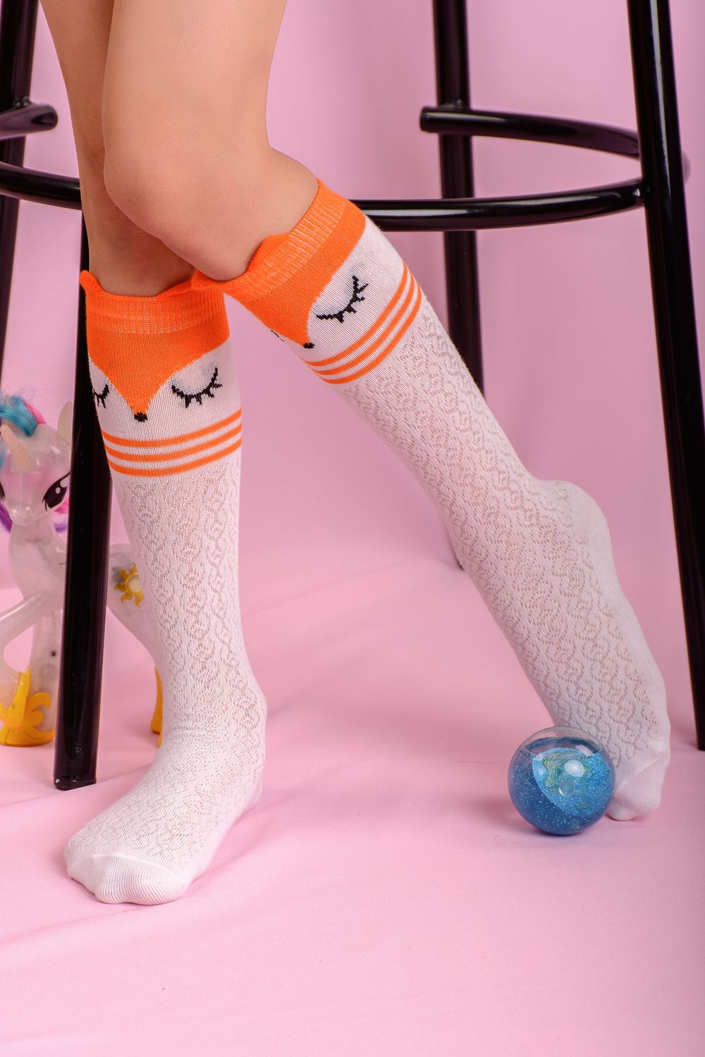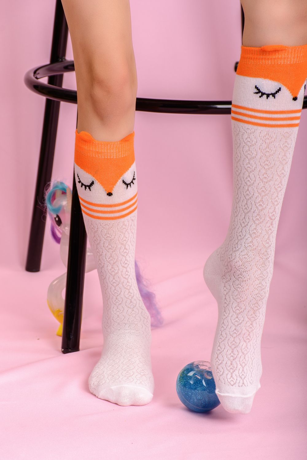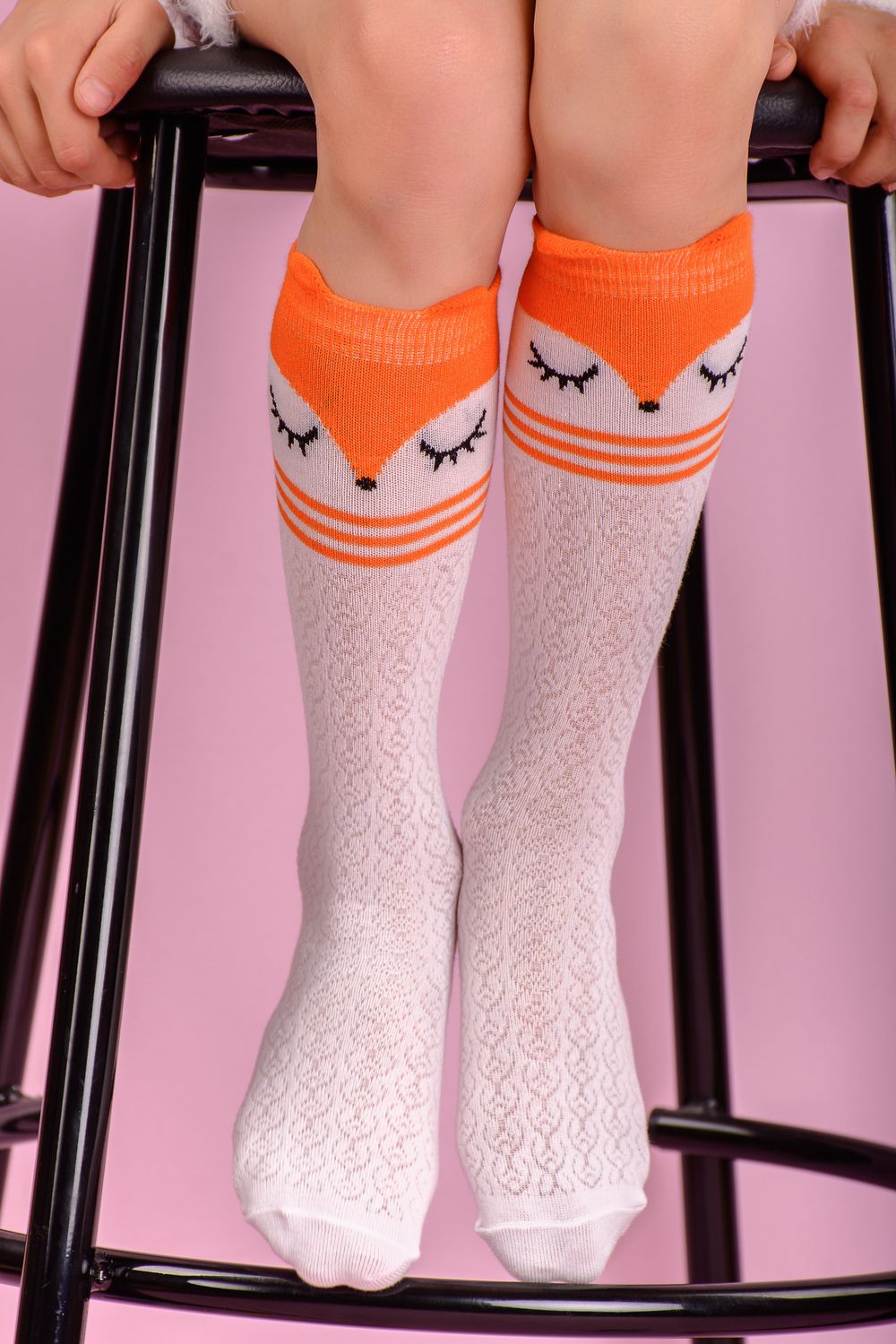 Яркие гольфы для девочек. По всей поверхности вывязан узор, сверху - мордочки животных с ушками. В упаковке 3 пары - по 1 паре каждого вида