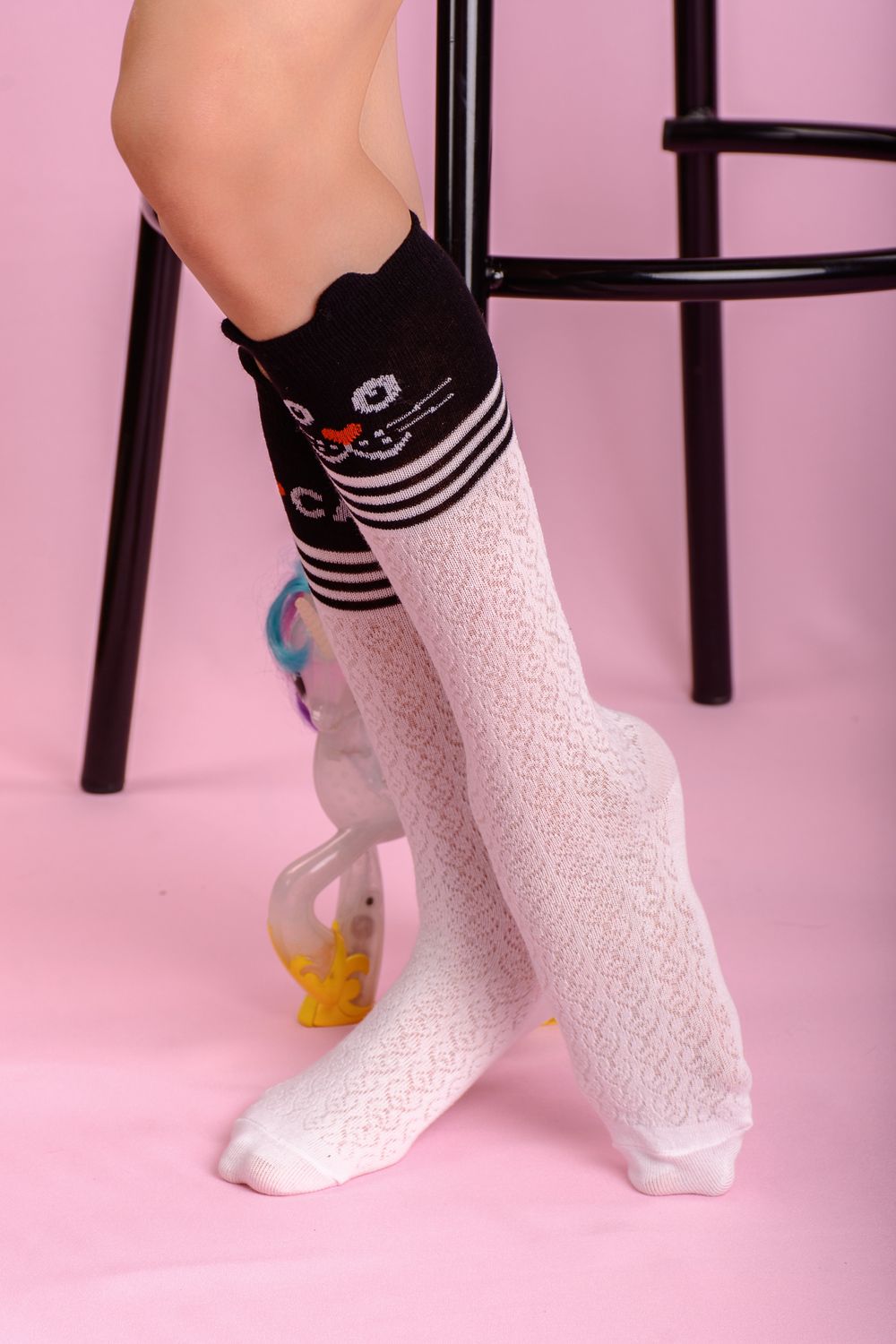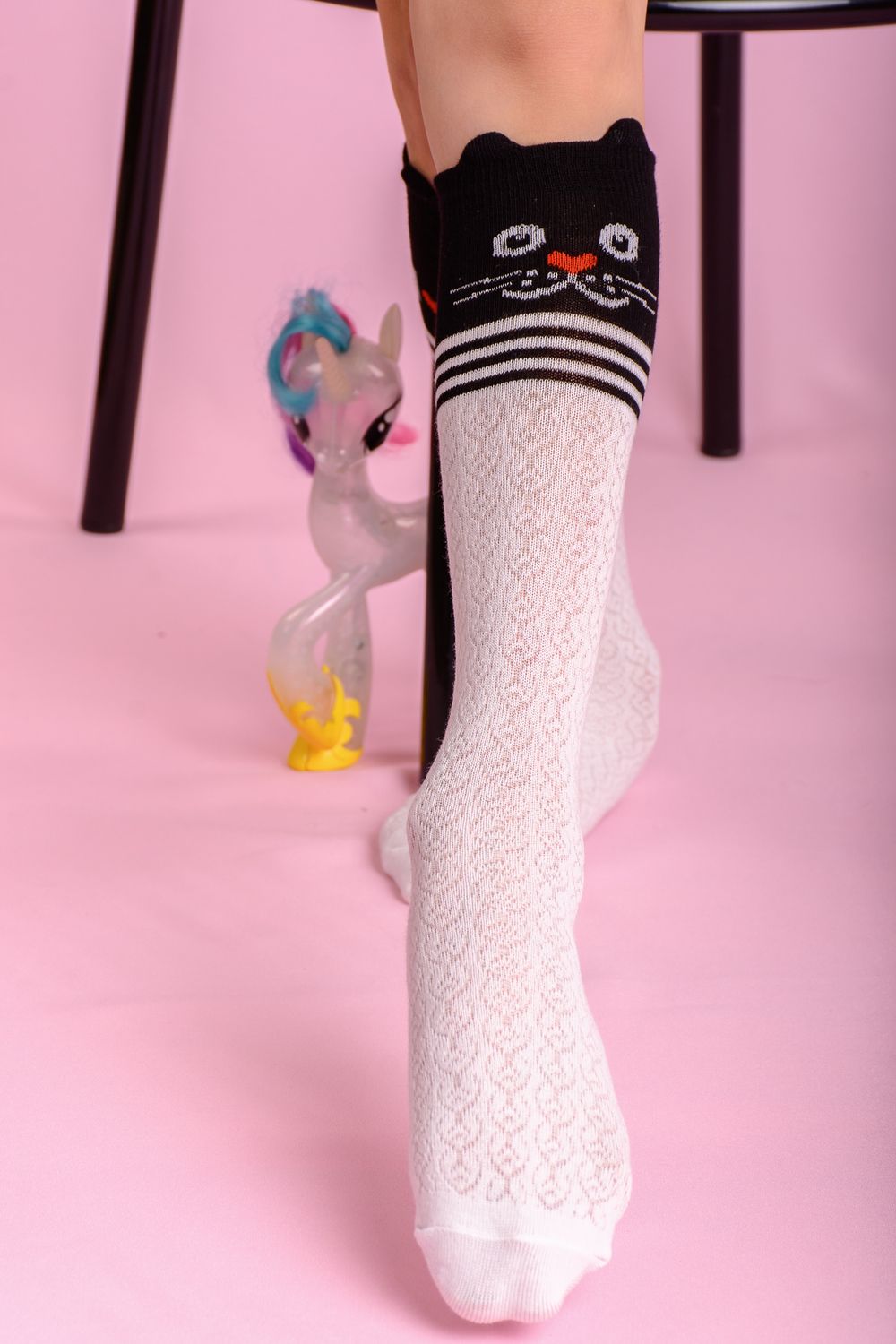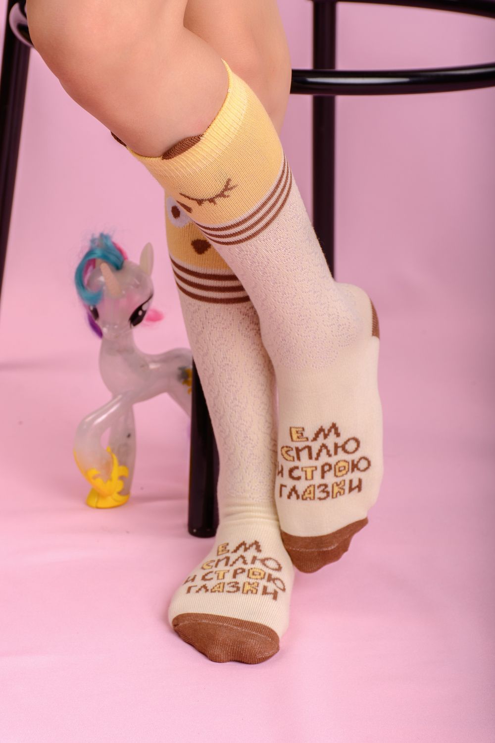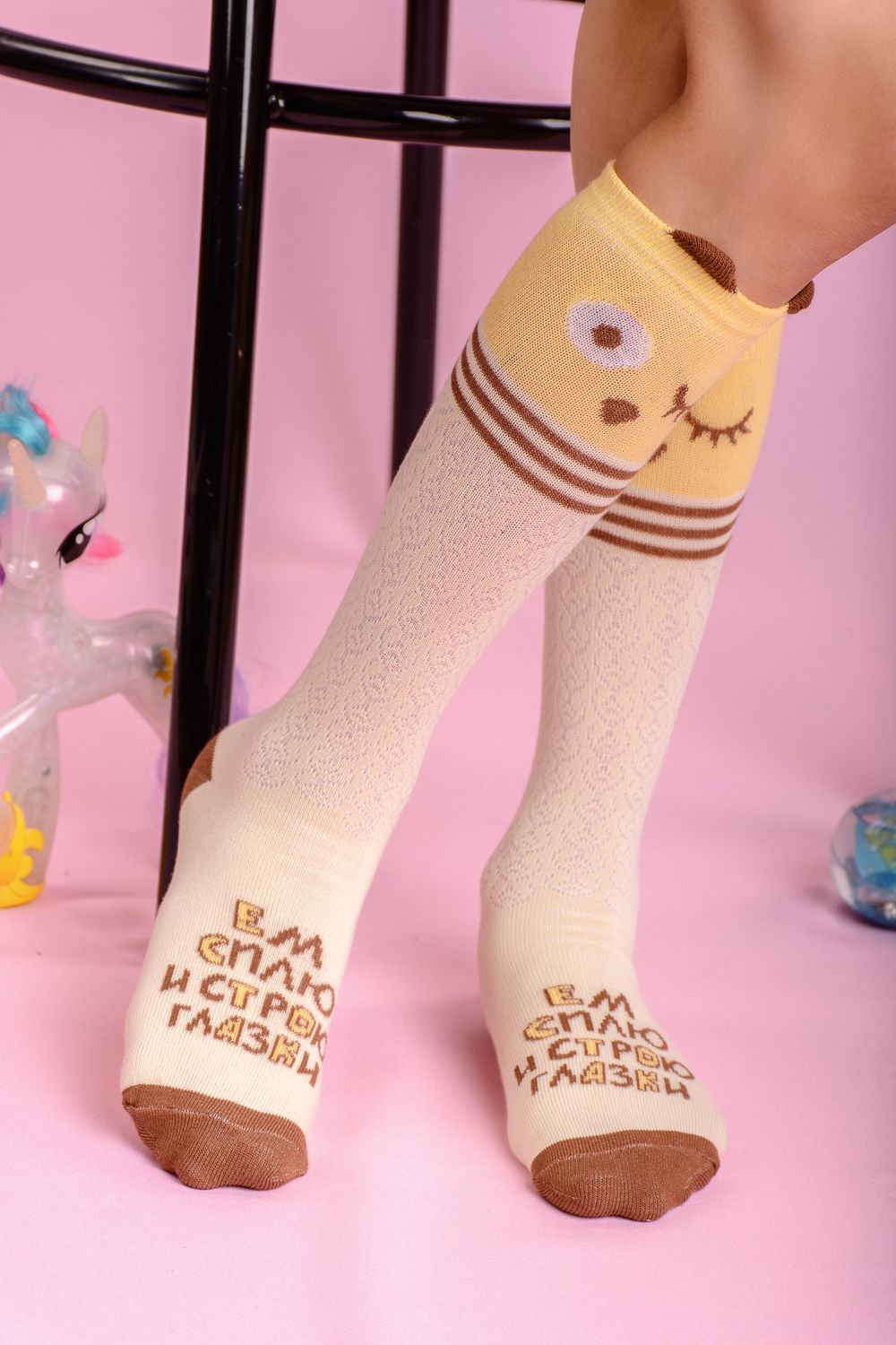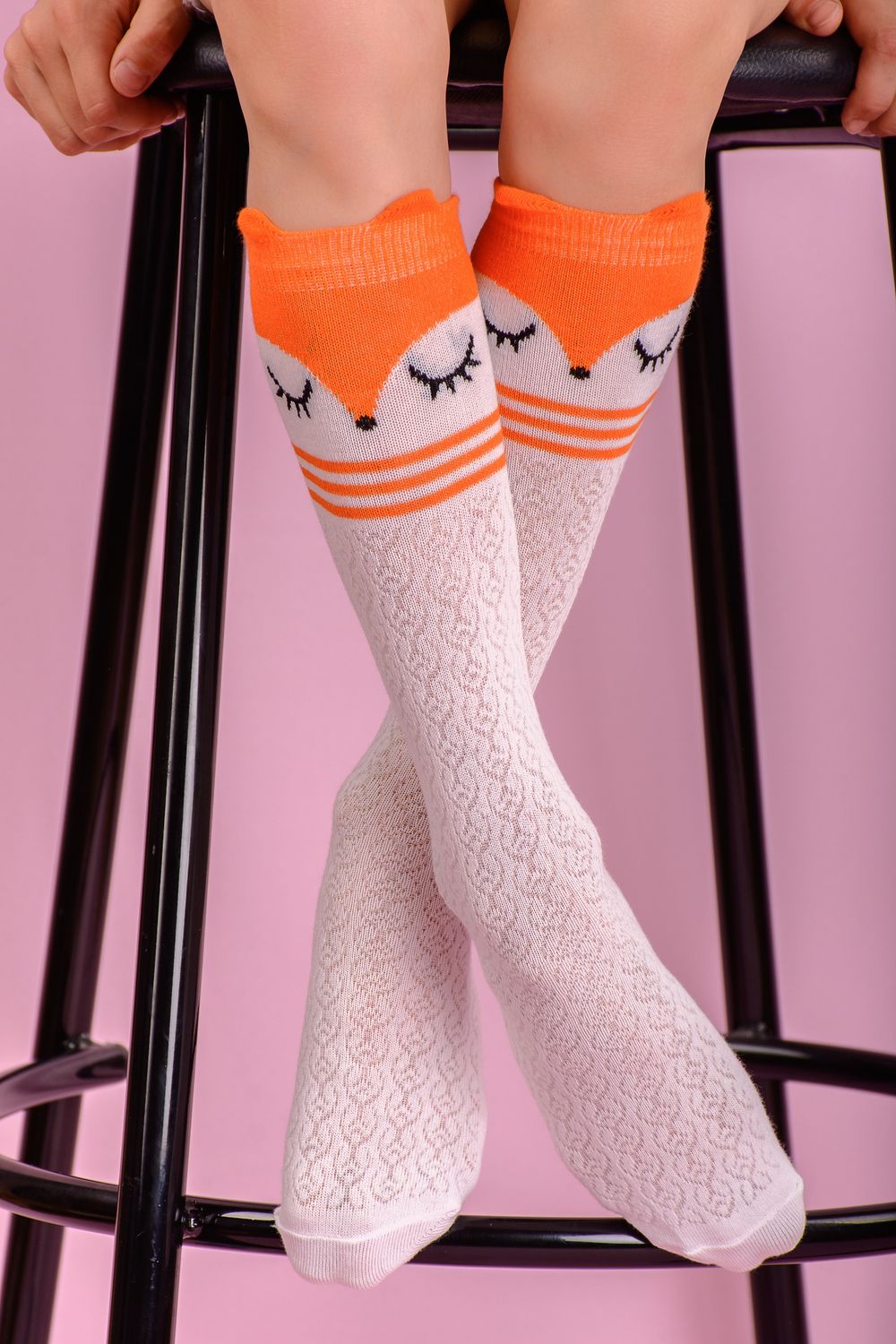 Яркие гольфы для девочек. По всей поверхности вывязан узор, сверху - мордочки животных с ушками. В упаковке 3 пары - по 1 паре каждого вида