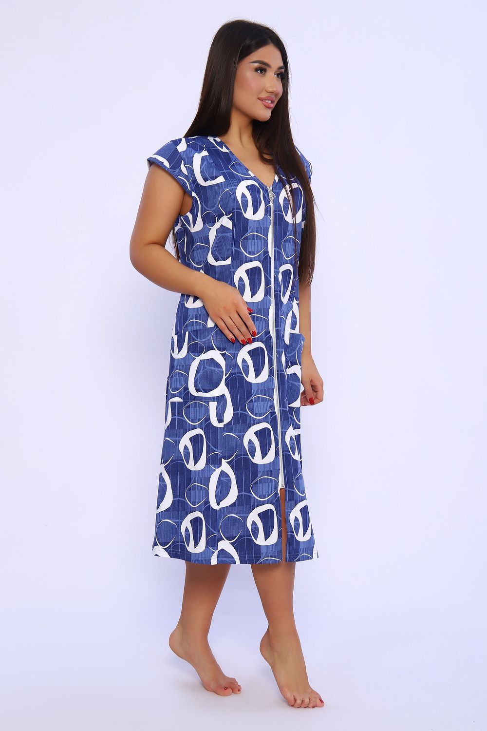 Халат женский на молнии оригинальной расцветки, выполнен из кулирки 100% хлопок. Горловина обработана узким кантом, рукав-крылышко, длина средняя. Халат идеально подойдет как для дома, так и для прогулок и отдыха.