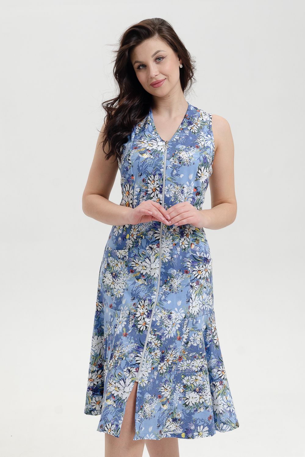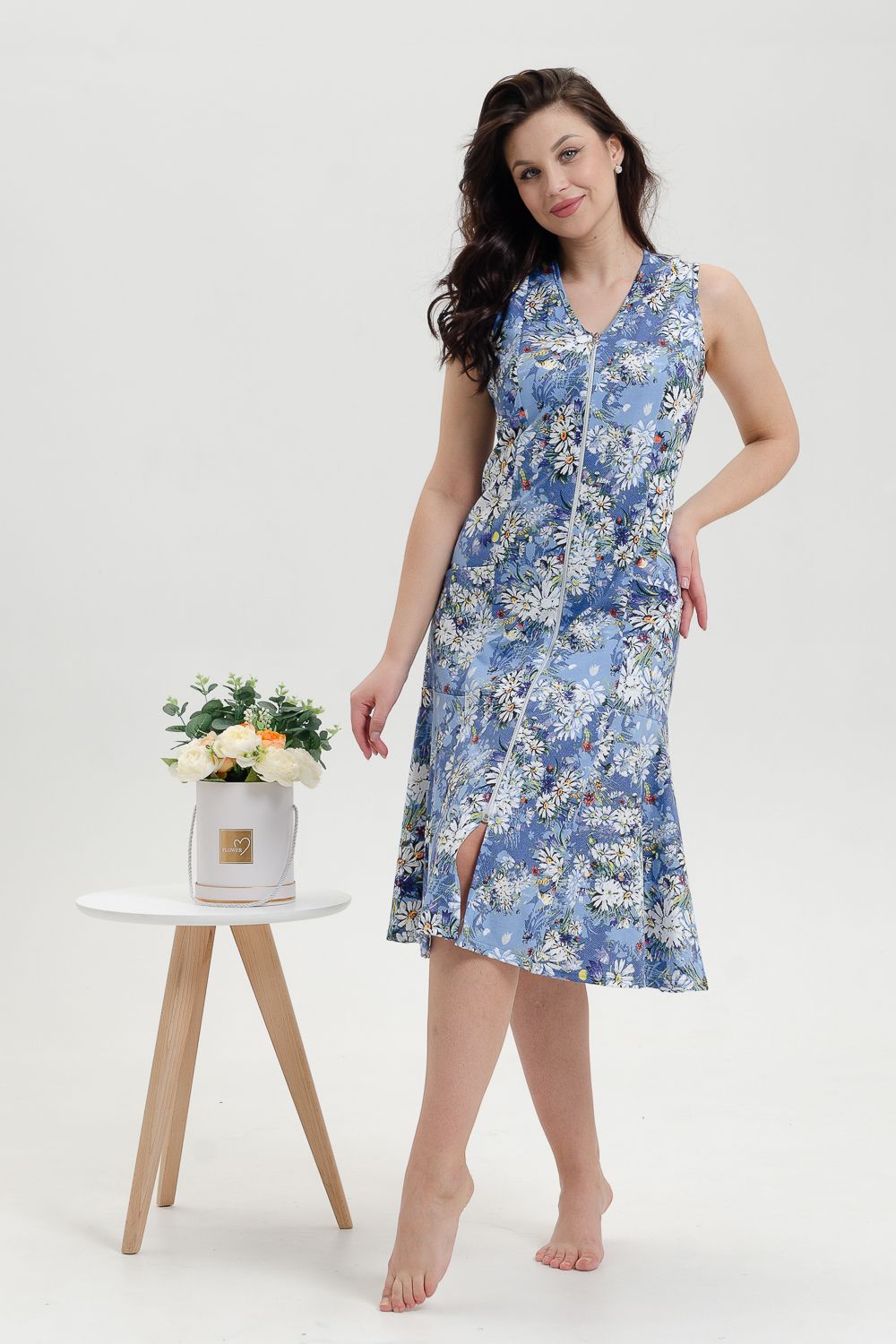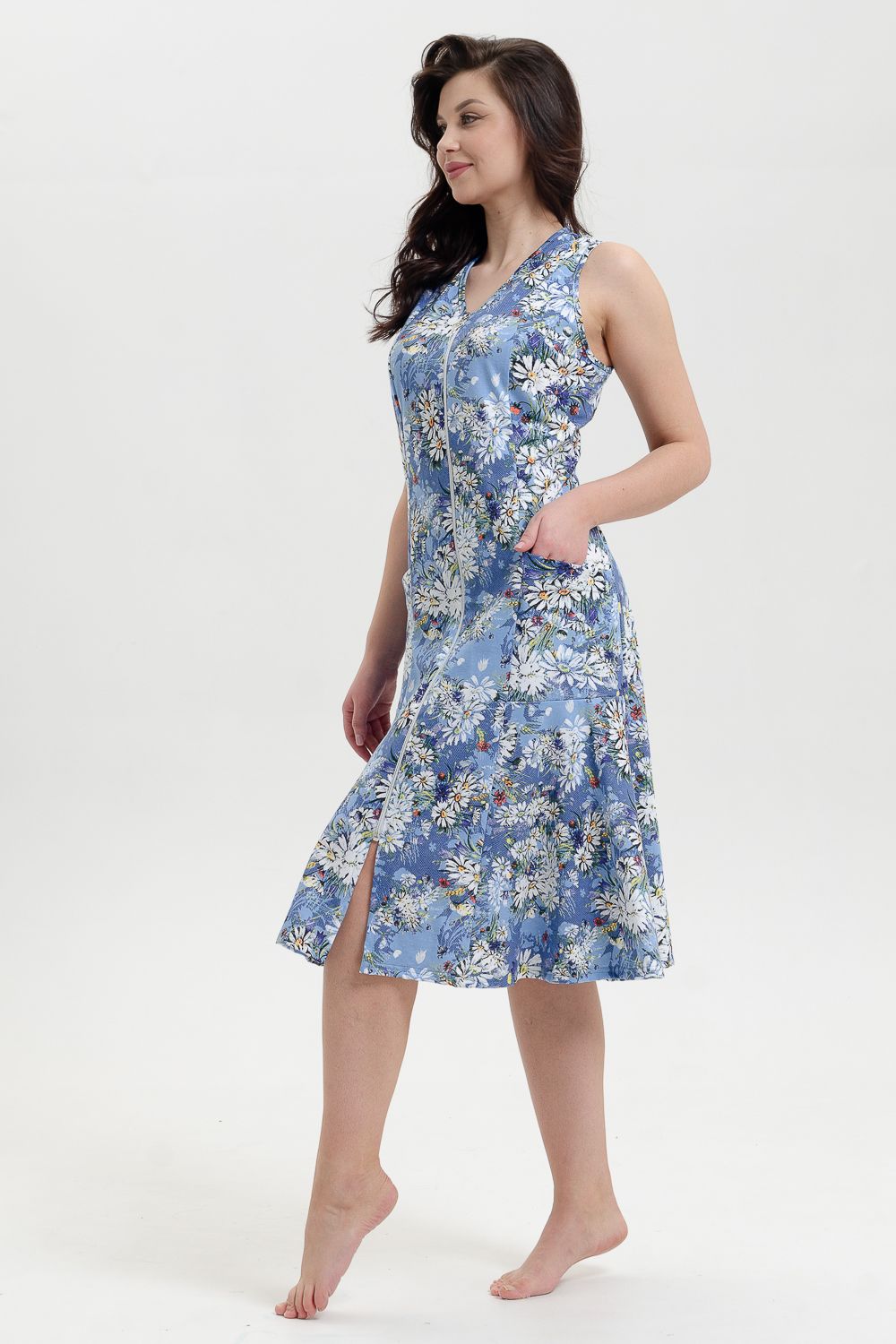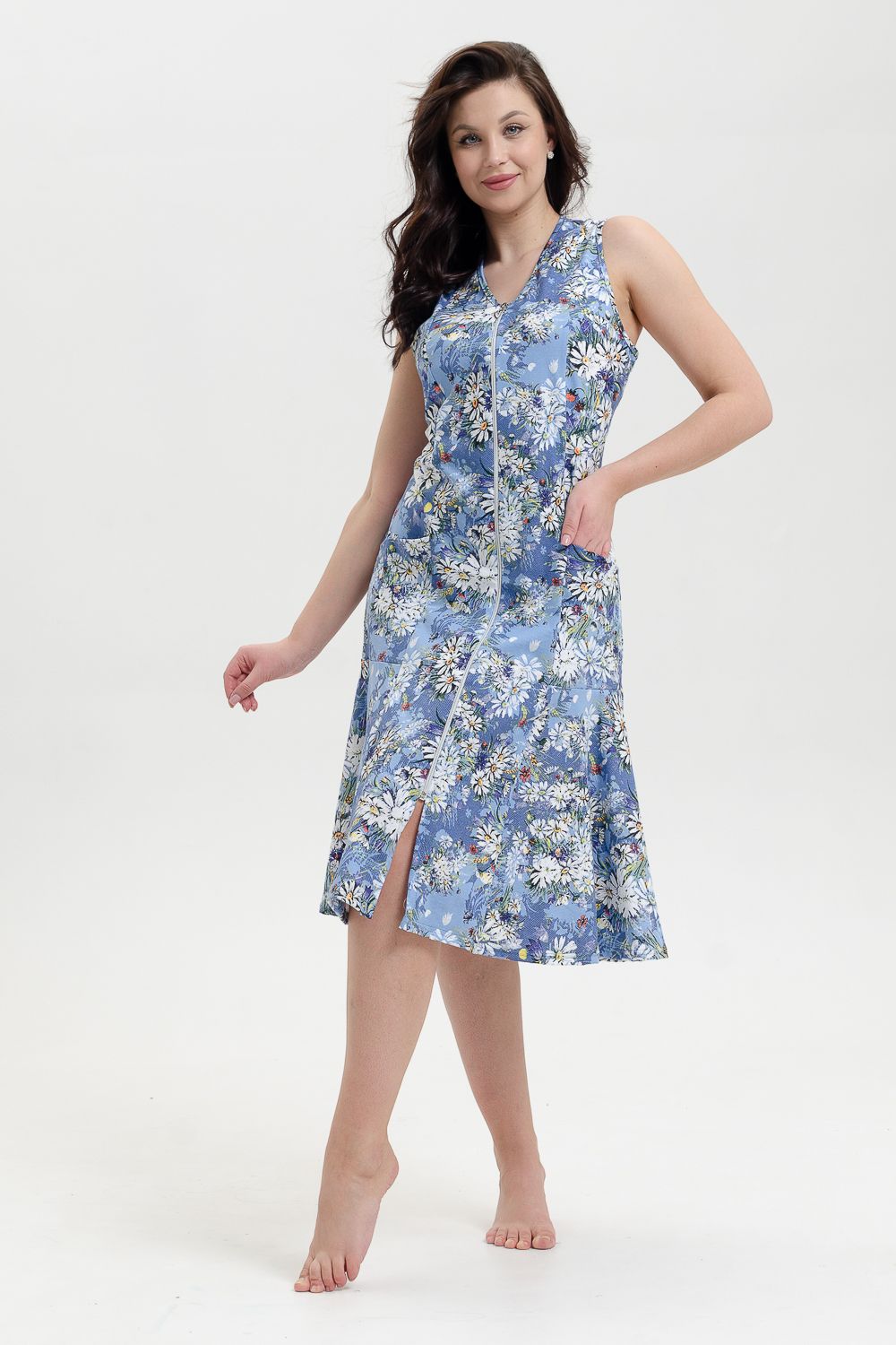 Халат женский нежной расцветки с ромашками выполнен из кулирки 100% хлопок. Халат укороченный, без рукава, на молнии, под карманом подрез, который придает изделию расклешение. Халат очень комфортный, отлично подойдет для дома и отдыха.