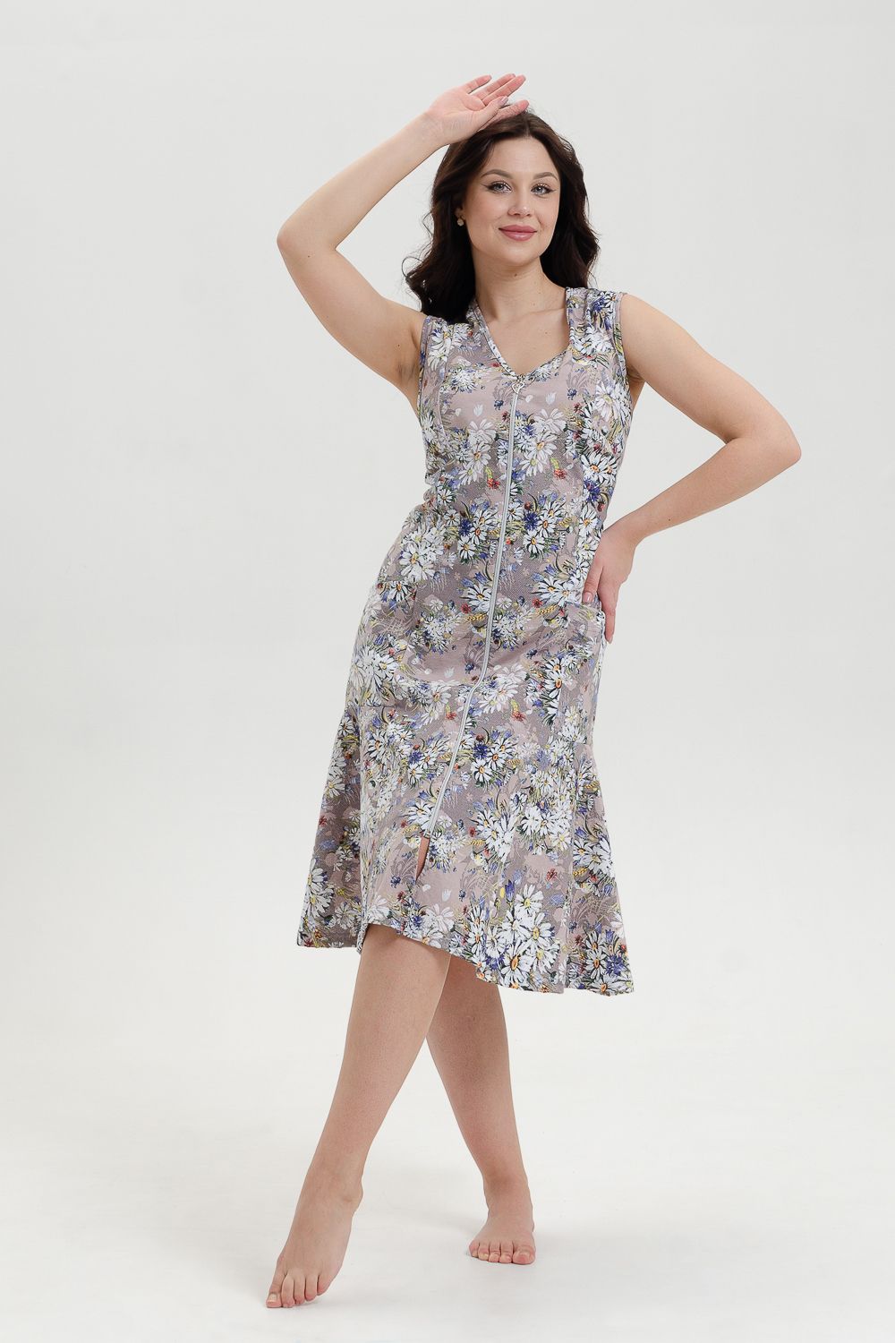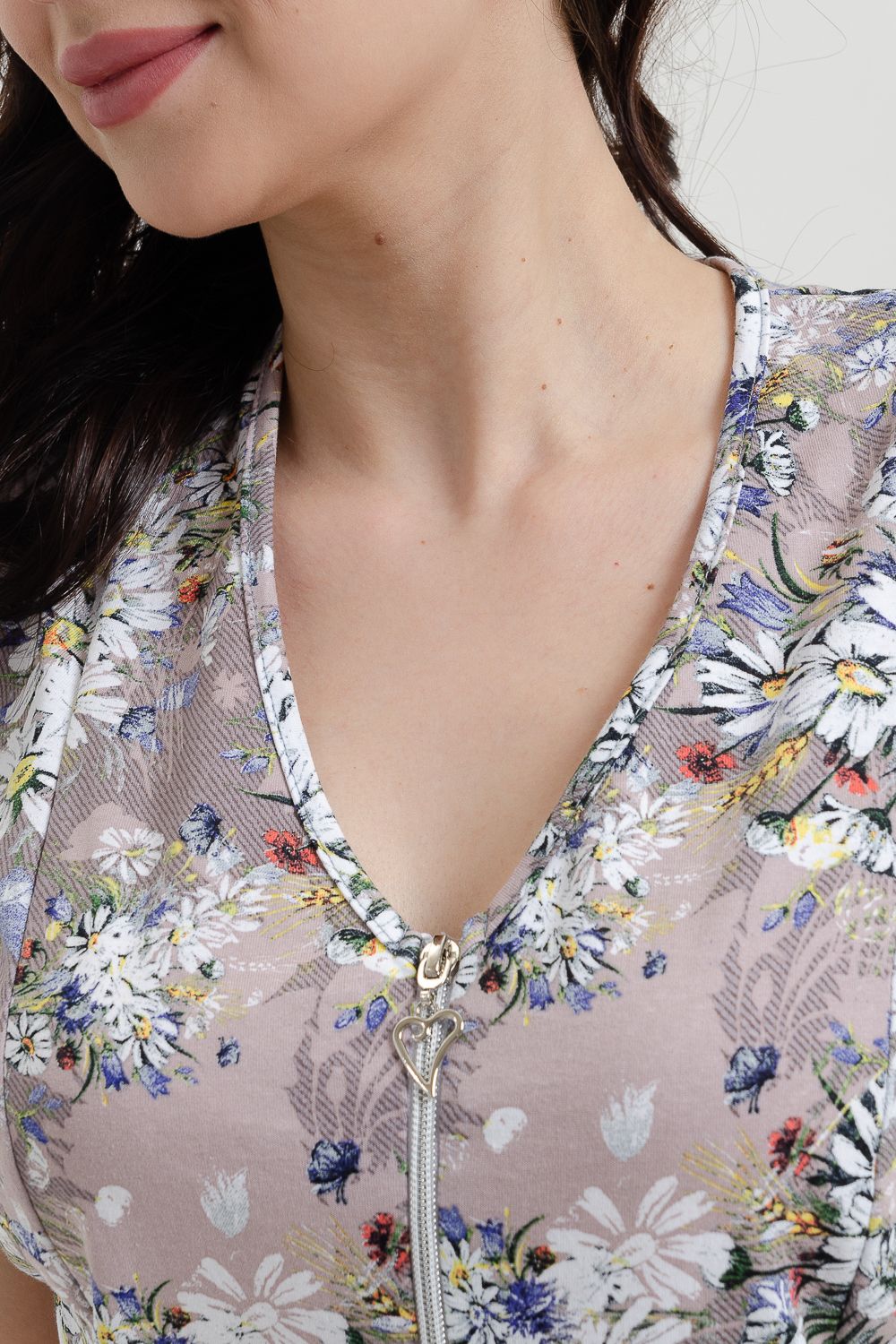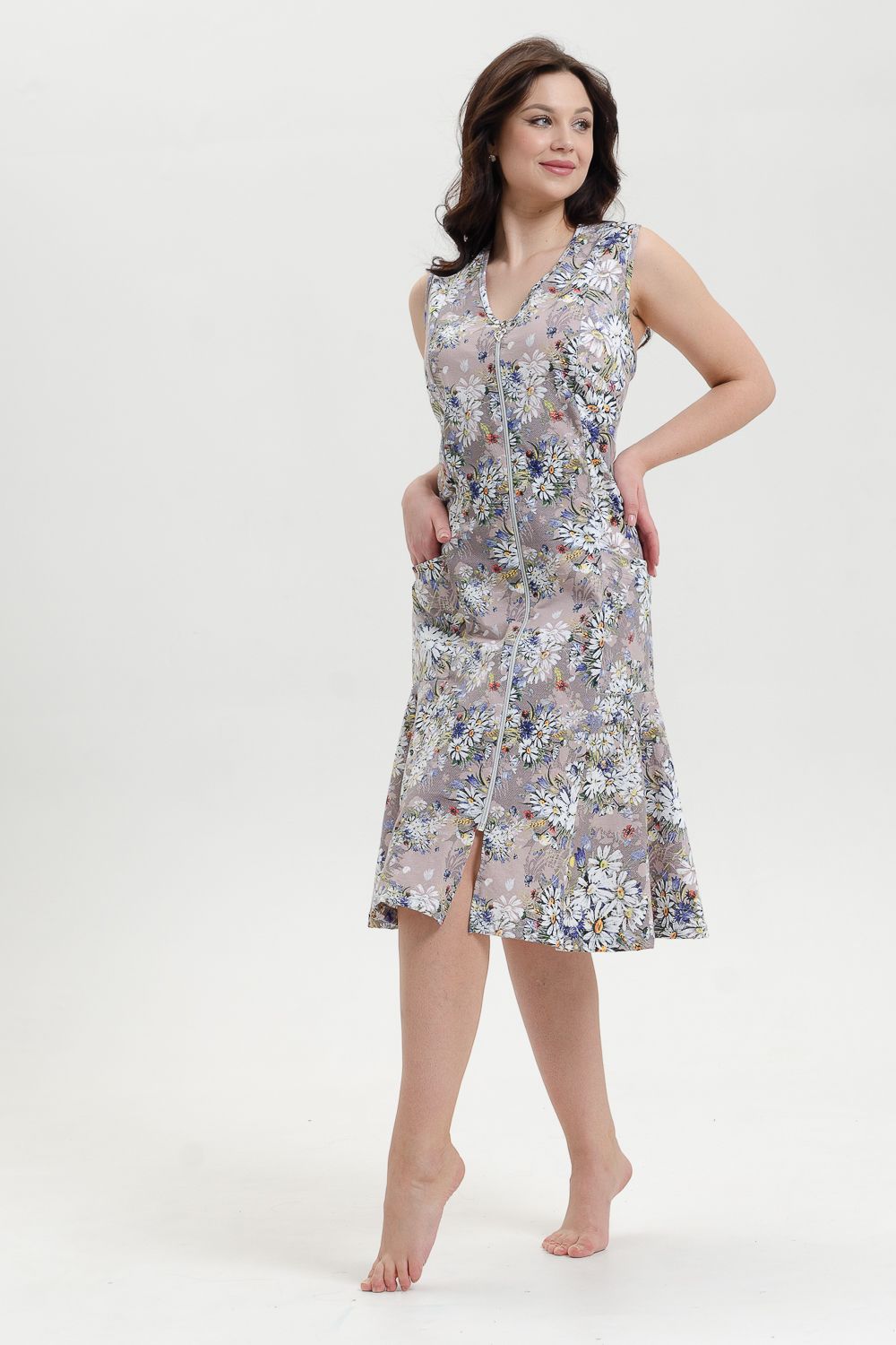 Халат женский нежной расцветки с ромашками выполнен из кулирки 100% хлопок. Халат укороченный, без рукава, на молнии, под карманом подрез, который придает изделию расклешение. Халат очень комфортный, отлично подойдет для дома и отдыха.