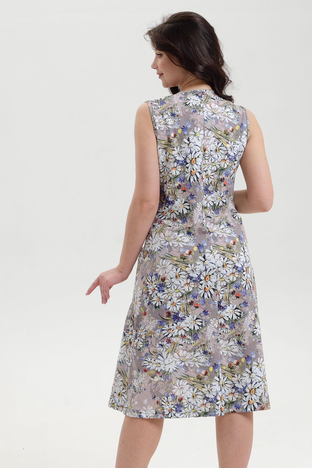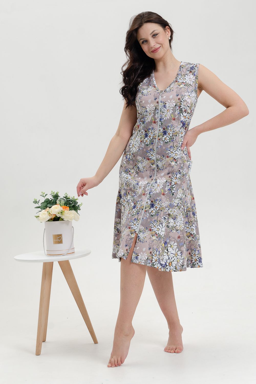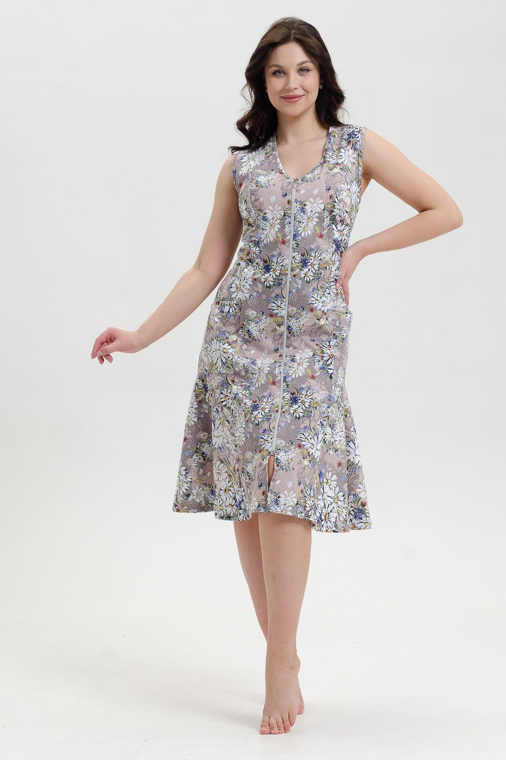 Халат женский нежной расцветки с ромашками выполнен из кулирки 100% хлопок. Халат укороченный, без рукава, на молнии, под карманом подрез, который придает изделию расклешение. Халат очень комфортный, отлично подойдет для дома и отдыха.