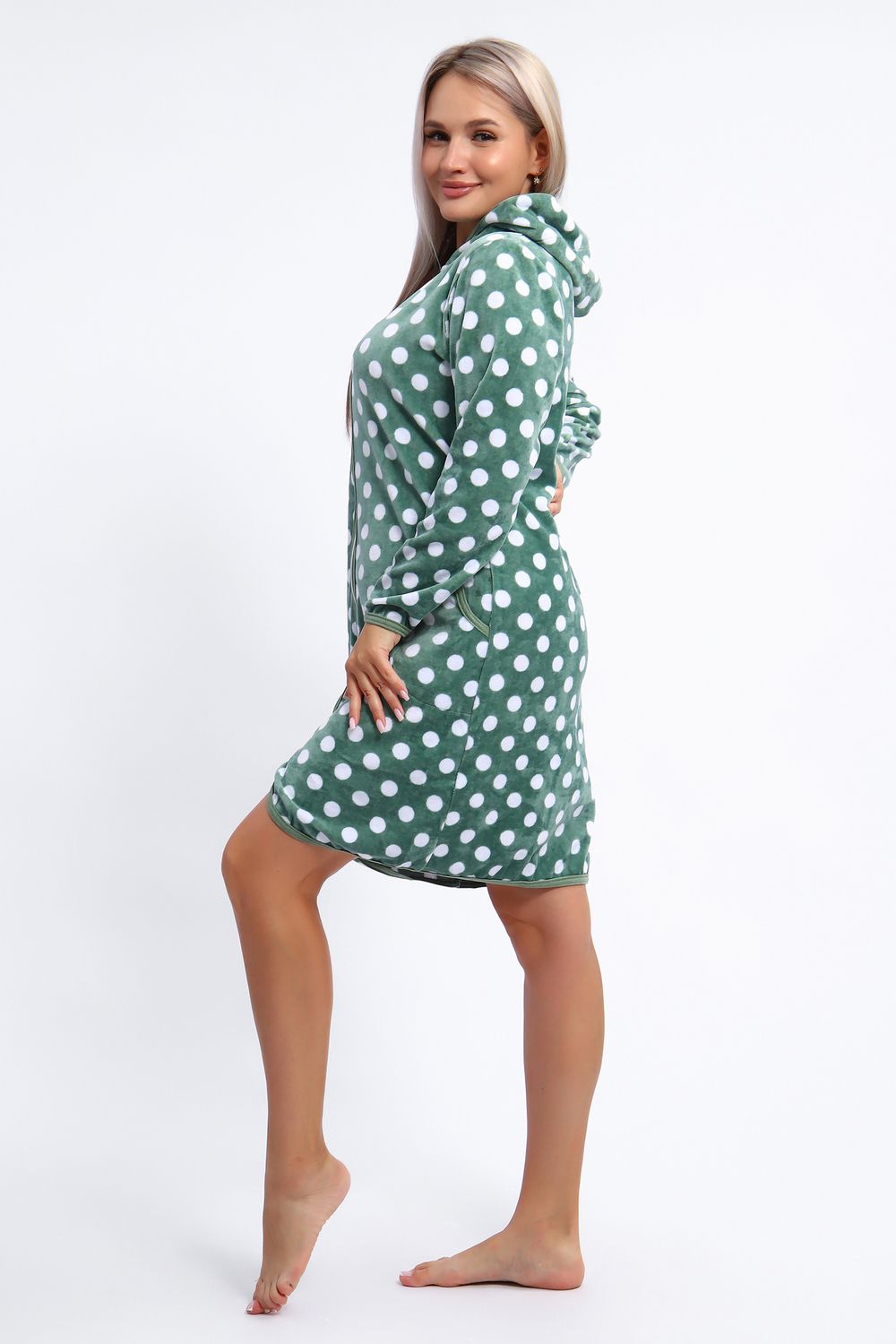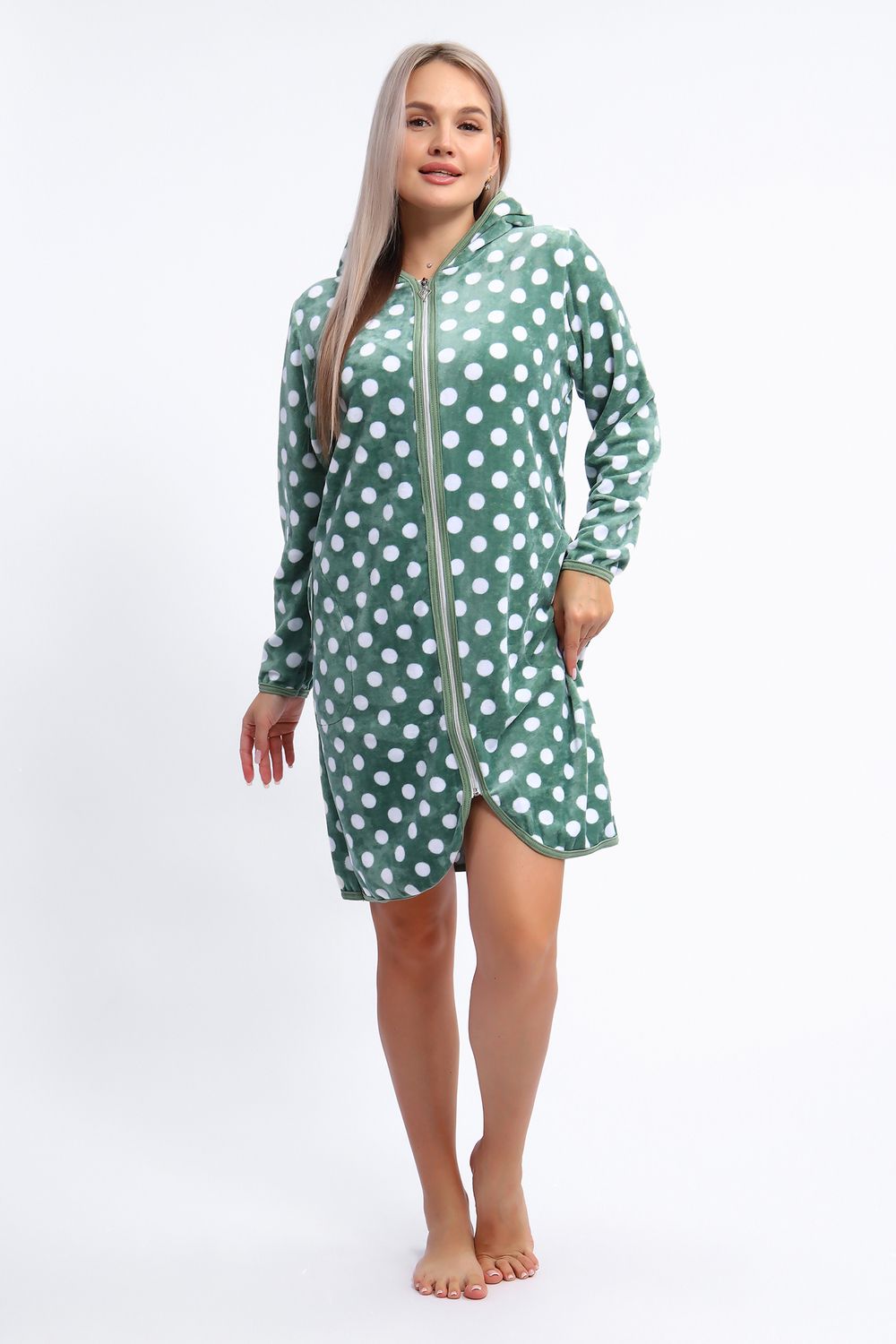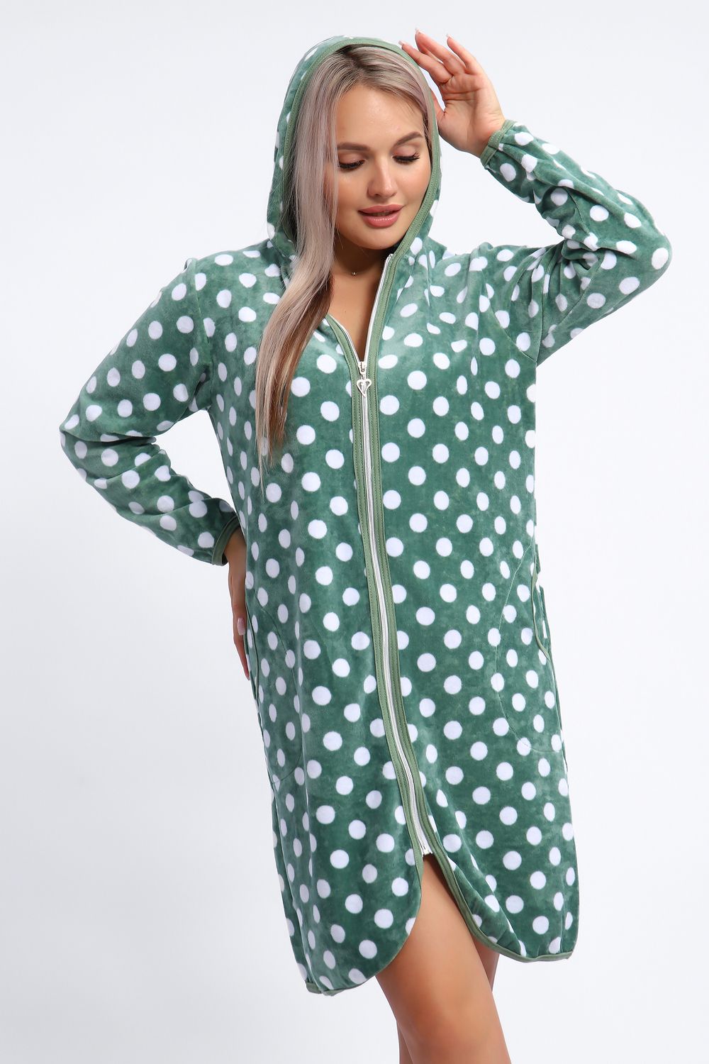 Халат женский выполнен из набивного велюра на серебристой молнии с капюшоном. Халат окантован по кругу отделкой контрастного цвета, рукава длинные, низ изделия и рукавов подшиты. Халат комфортный, мягкий, уютный, идеально подойдет для дома и отдыха.