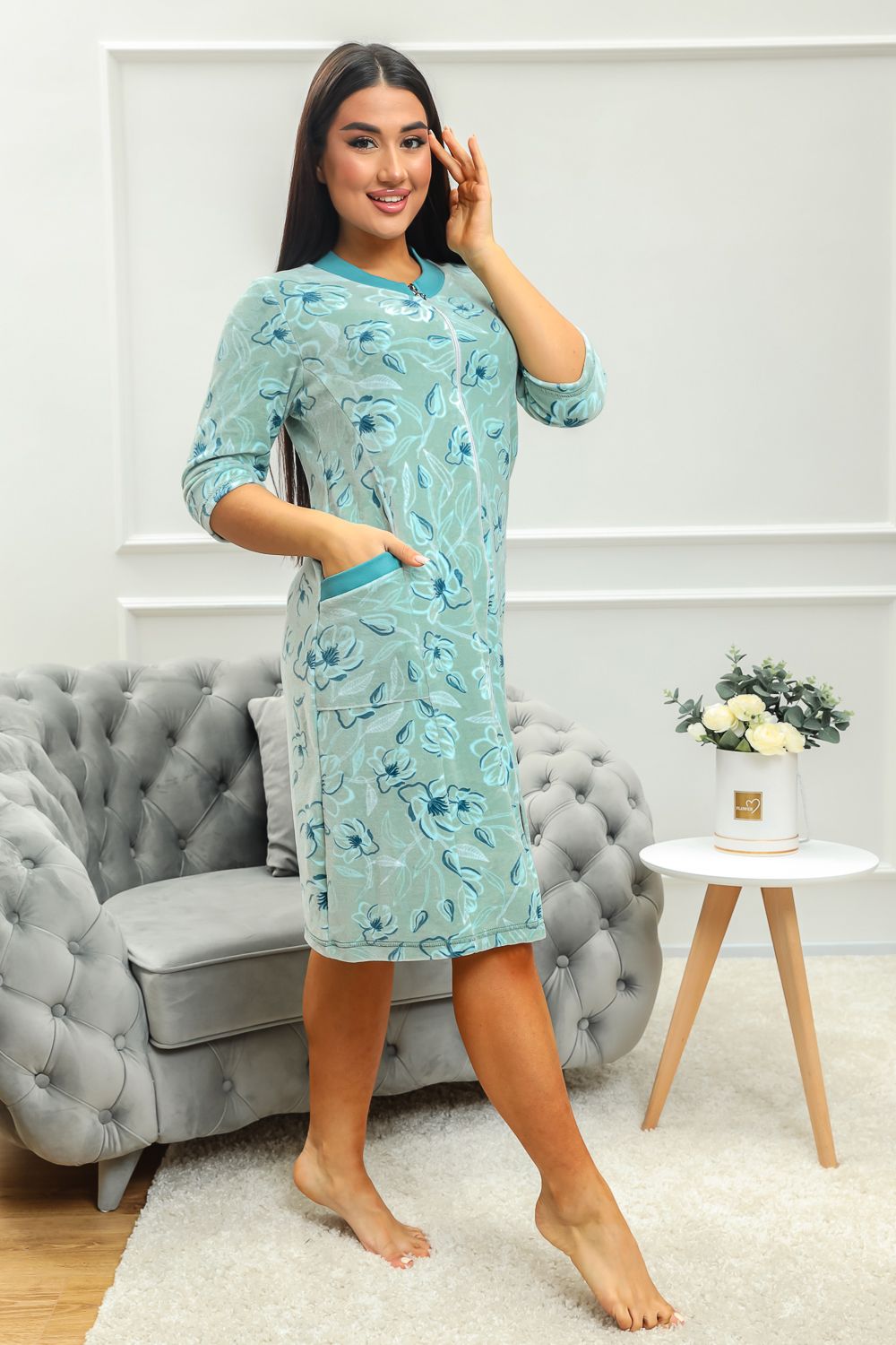 Халат женский на серебристой молнии выполнен из набивного велюра. Халат с рукавом 3/4, головина и карманы отделаны тканью контрастного цвета. Халат идеально подойдет для дома и отдыха.