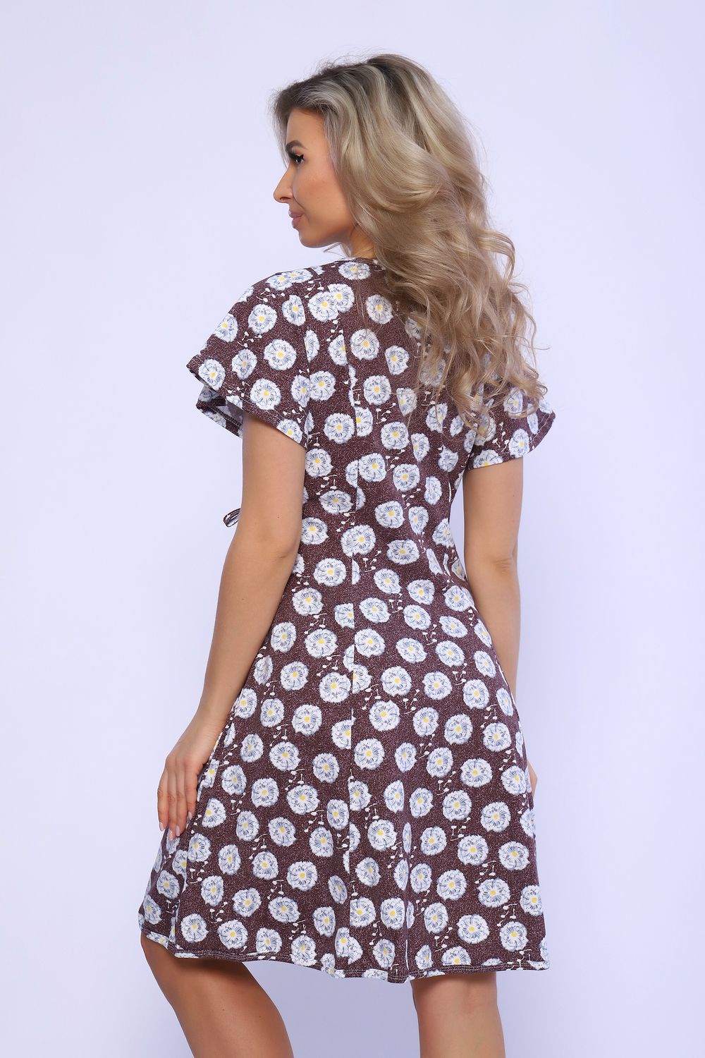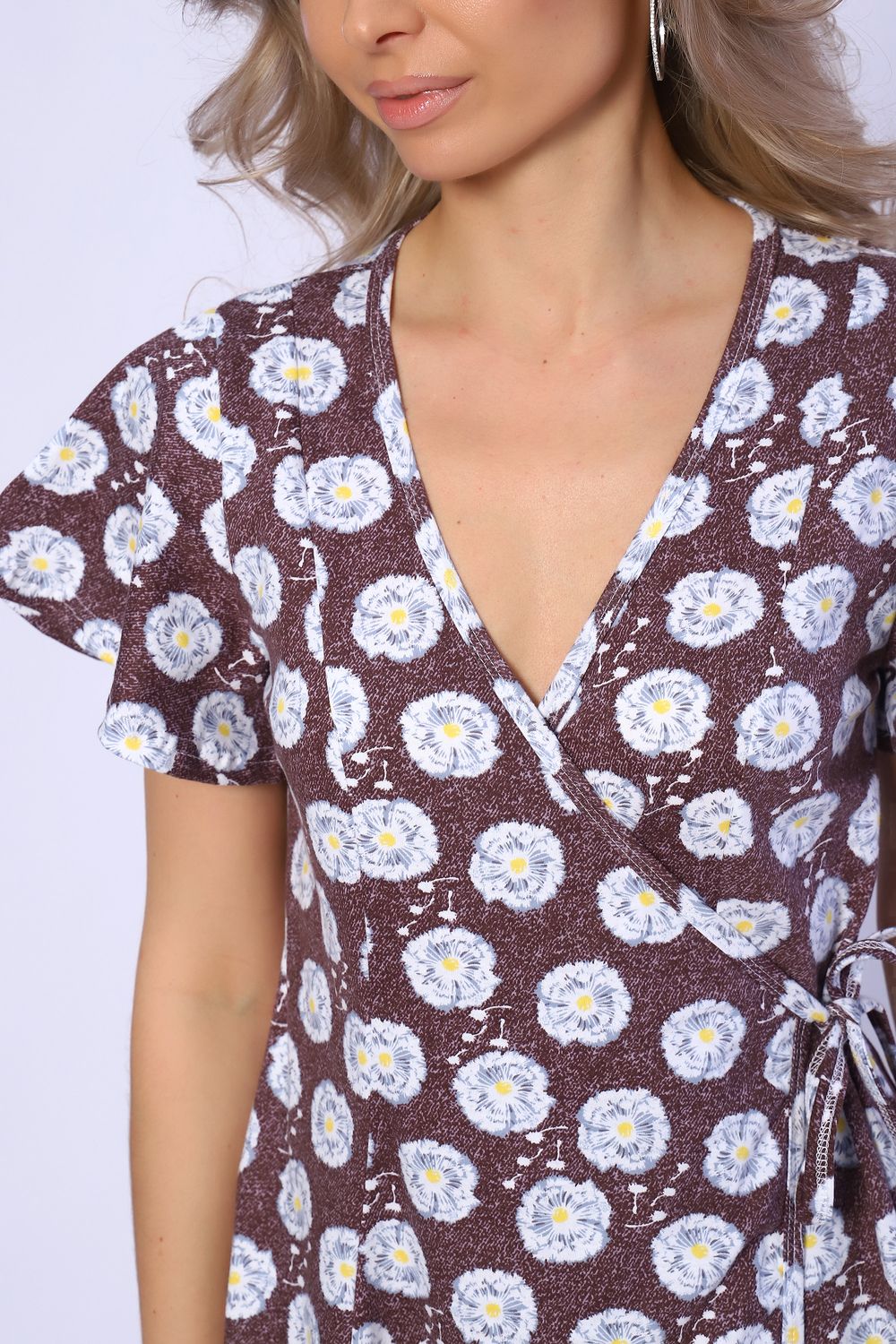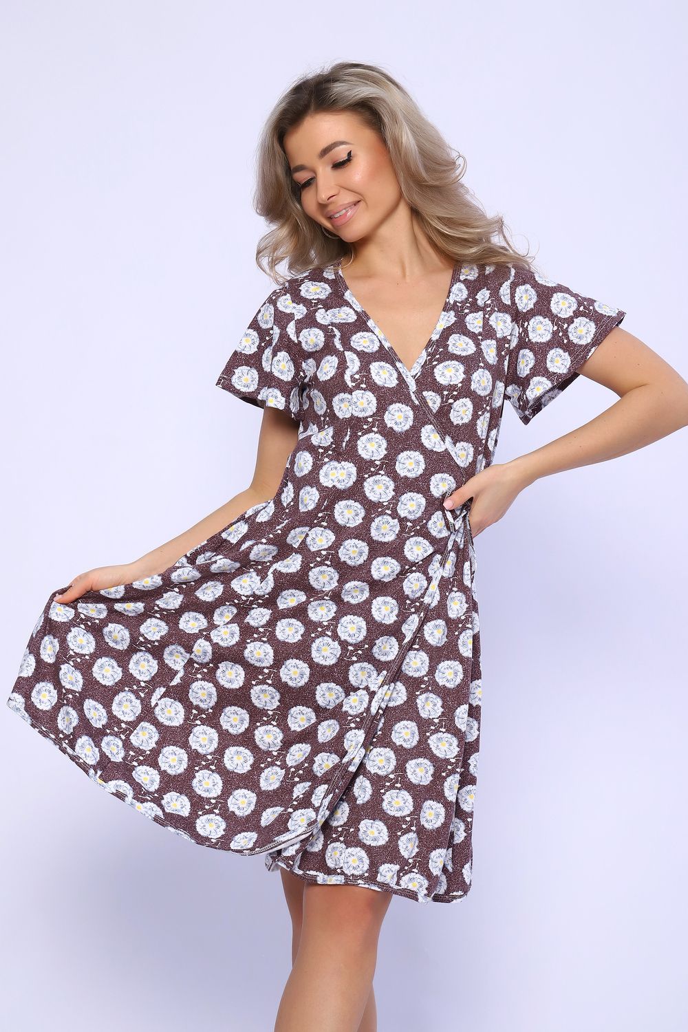 Халат запашной на завязках с рельефами на полочке и спинке. Рукава короткие, свободные. Карманы в боковых швах. Комфортен для повседневной носки.