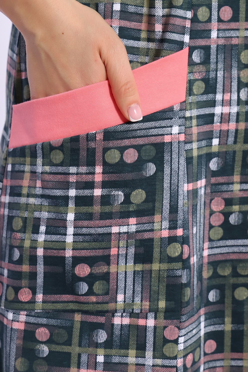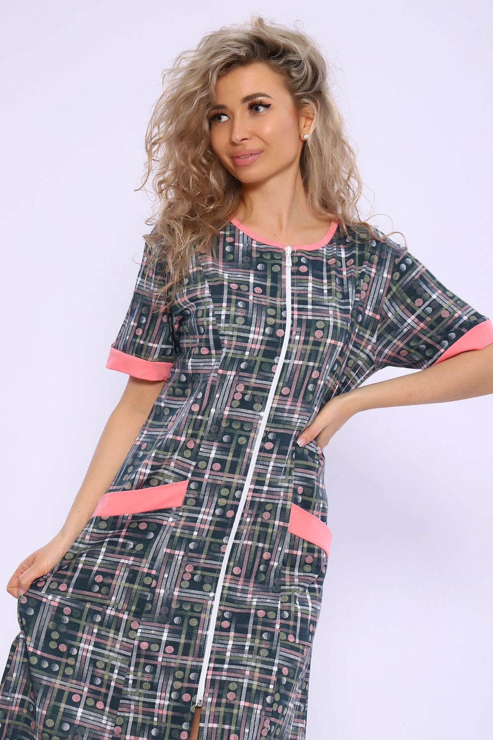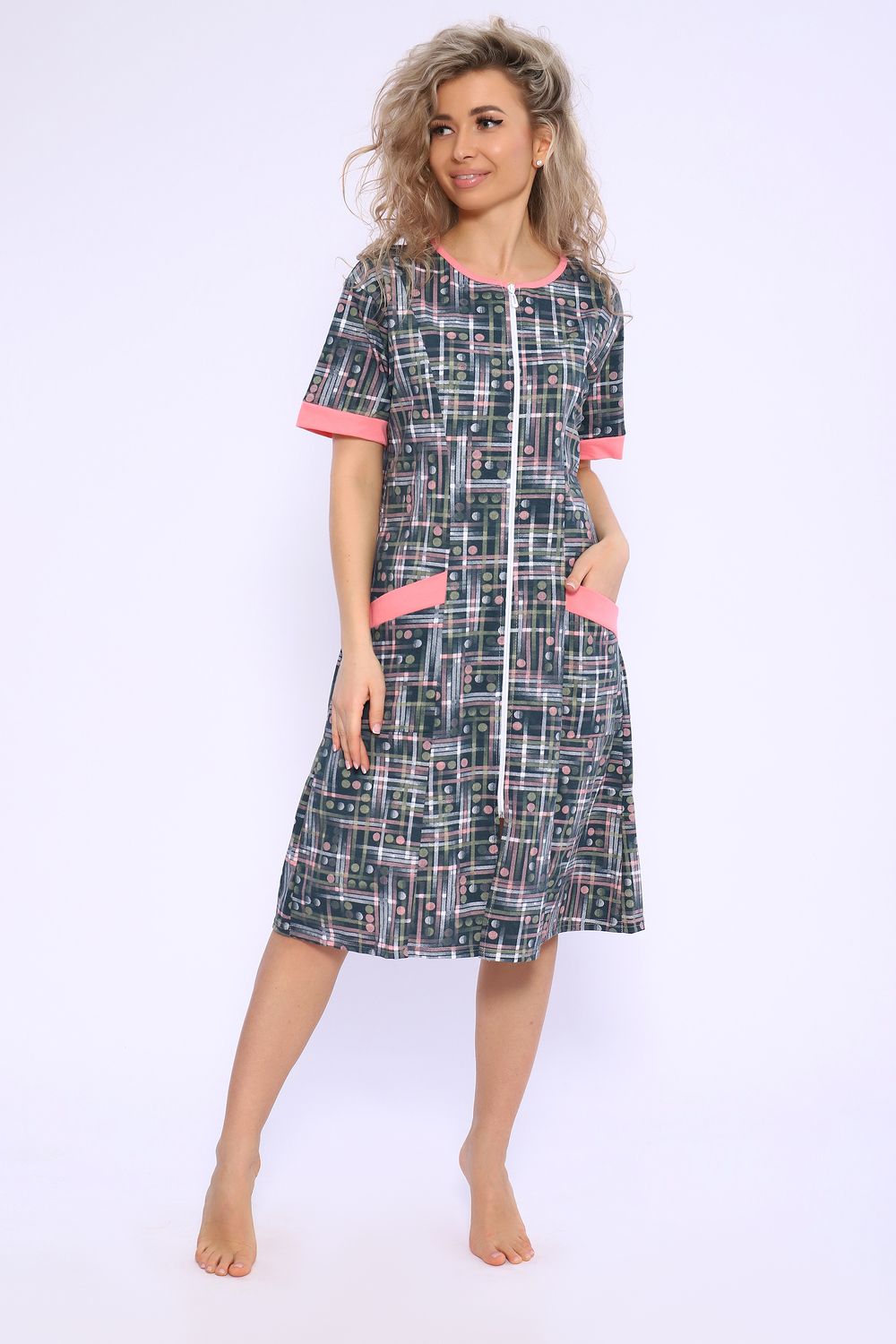Халат женский с центральной застежкой на молнию. Рукава короткие на манжетах. Вырез горловины круглый обработан кантом. На полочках накладные карманы.