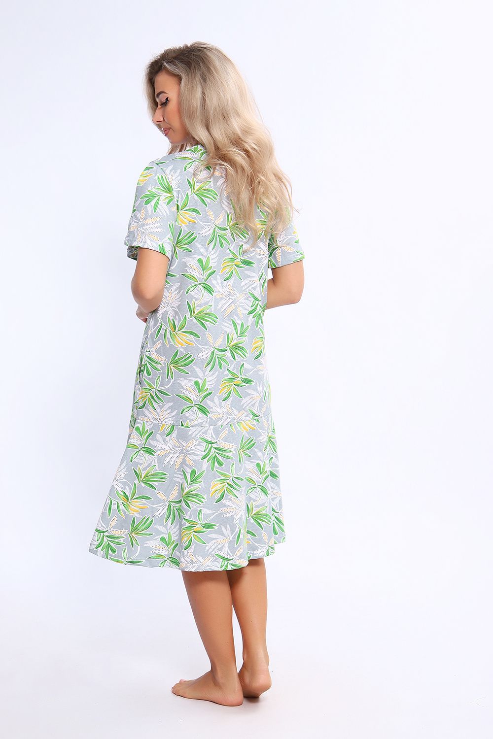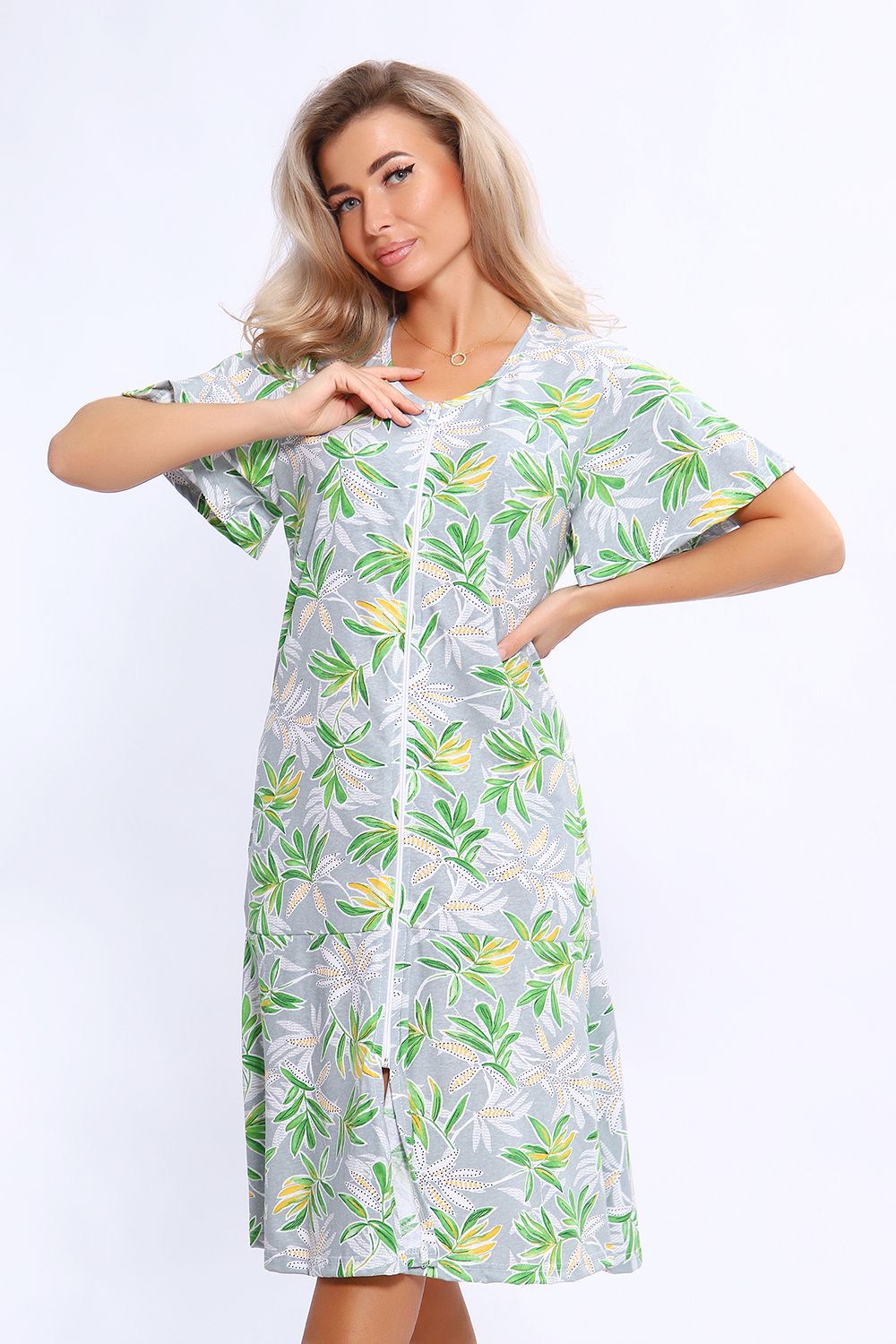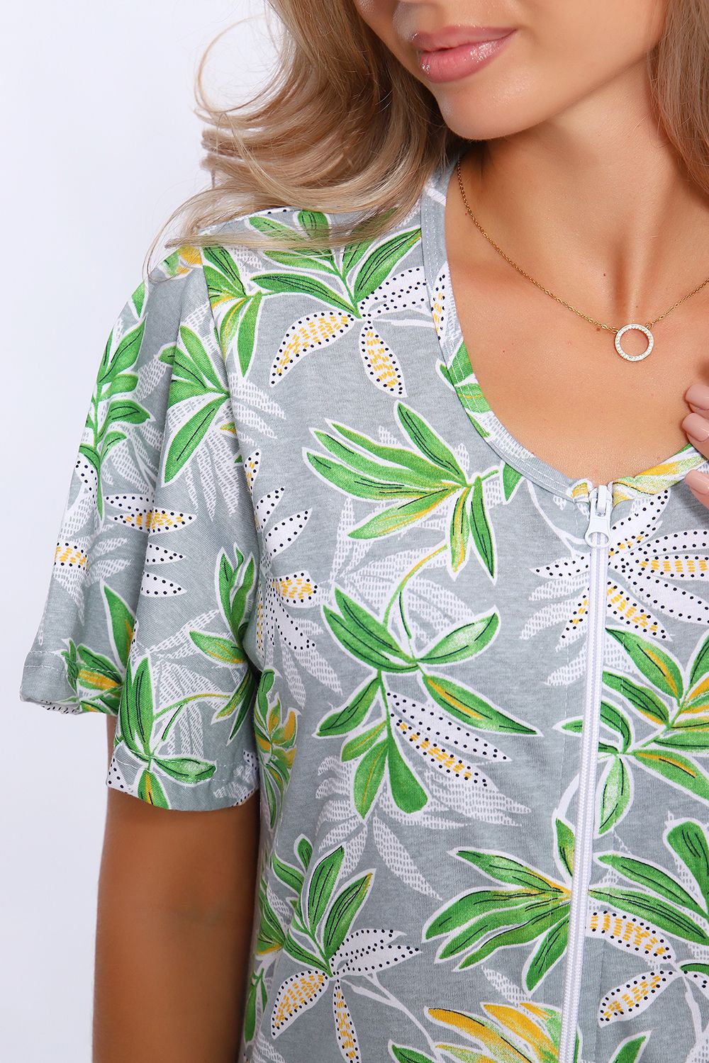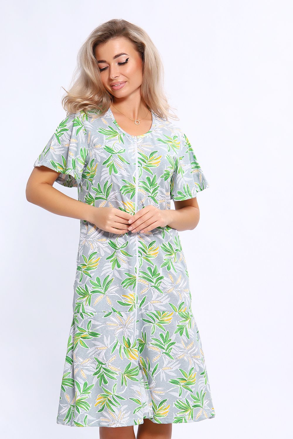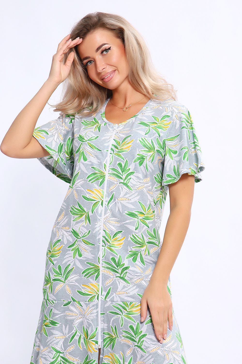 Халат на молнии полуприлегающего силуэта с короткими рукавами - крылышками и воланом по низу изделия. В боковых швах карманы. Комфортен для повседневной носки.