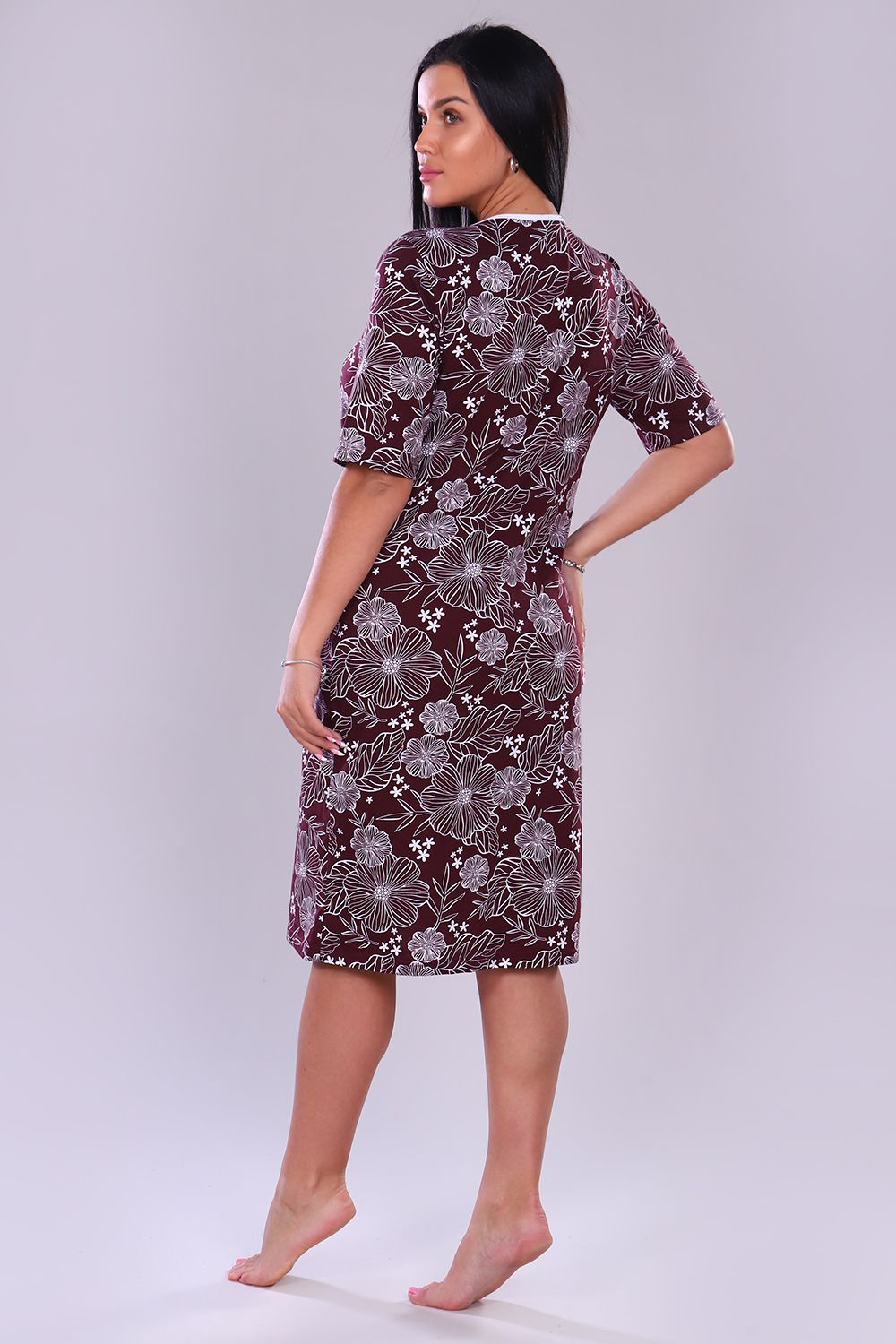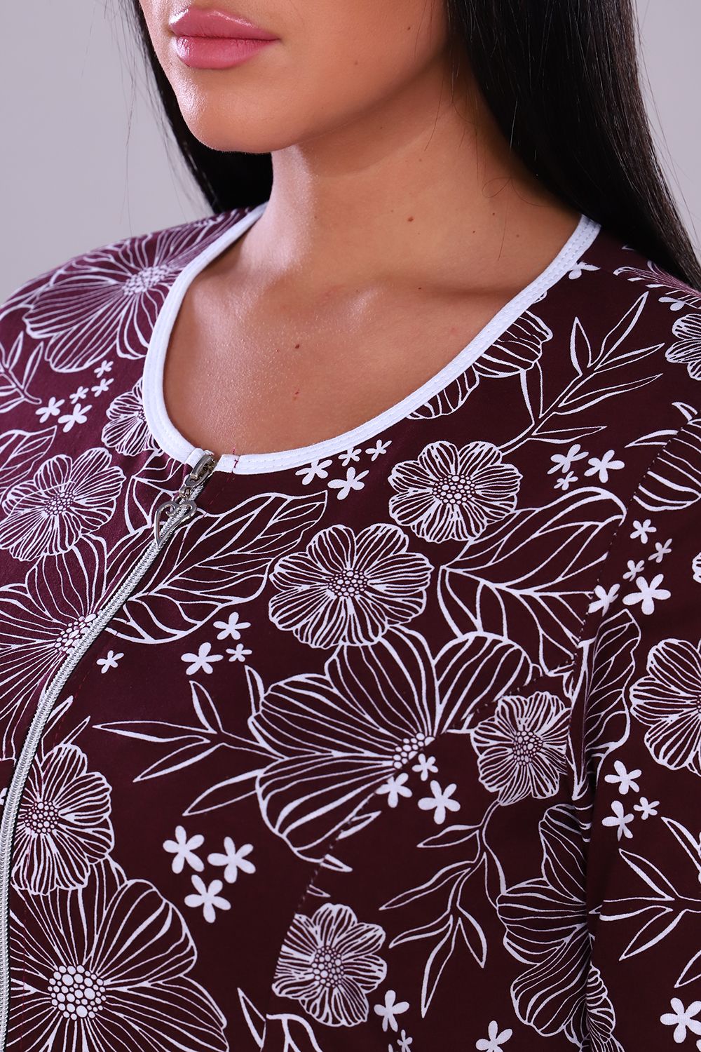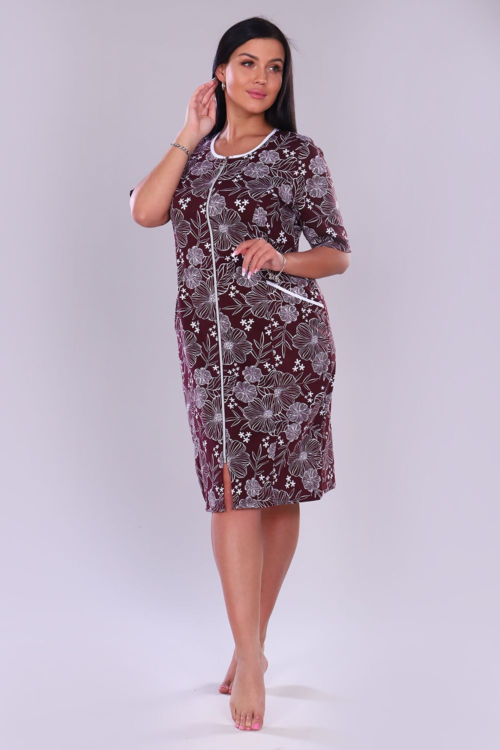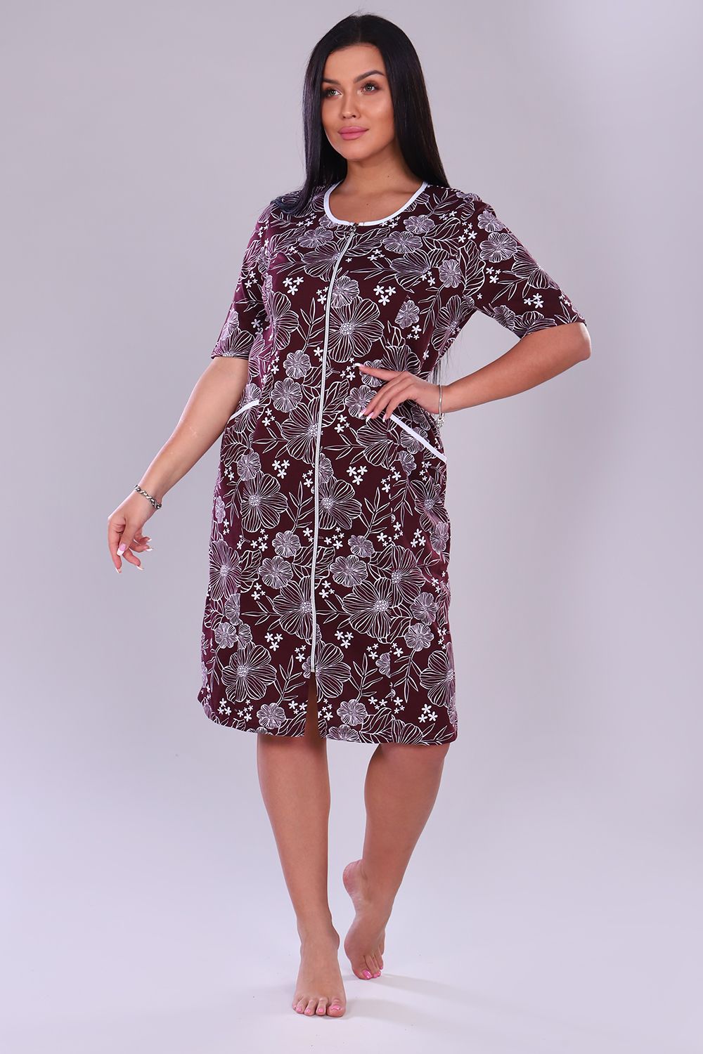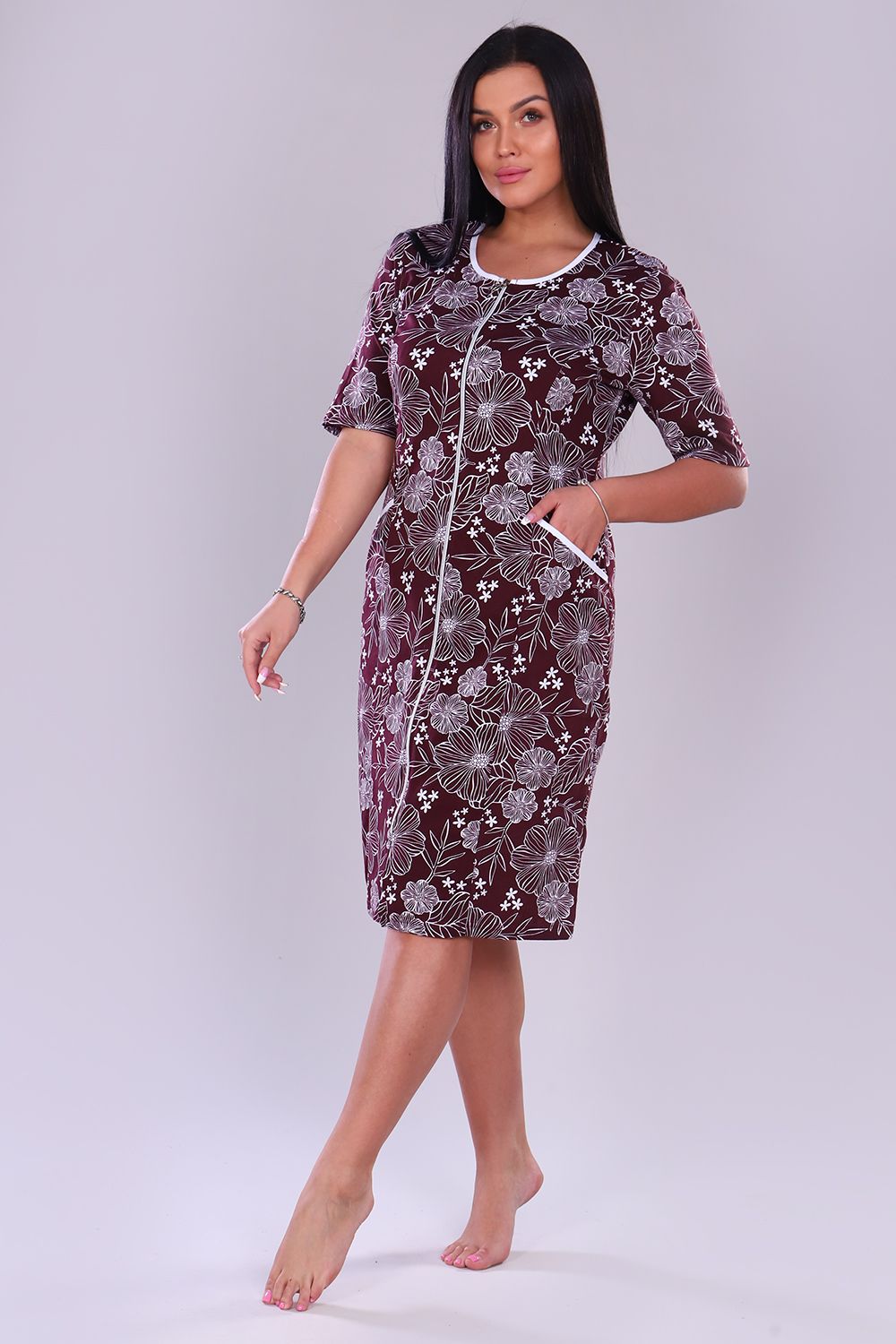 Халат женский домашний из кулирки с цветочным принтом длиной ниже колен. Халат полуприталенного силуэта с рельефами. Халат с центральной застежкой на тесьму-молнию. Перед с круглым вырезом. С двумя симметричными карманами. Вход в карман обработан прямой обтачкой из ткани отделки. Рукава втачные короткие. Внизу в боковых швах разрезы фигурной формы. Горловина и входы в карманы халата окантованы бейкой в тон основного материала.