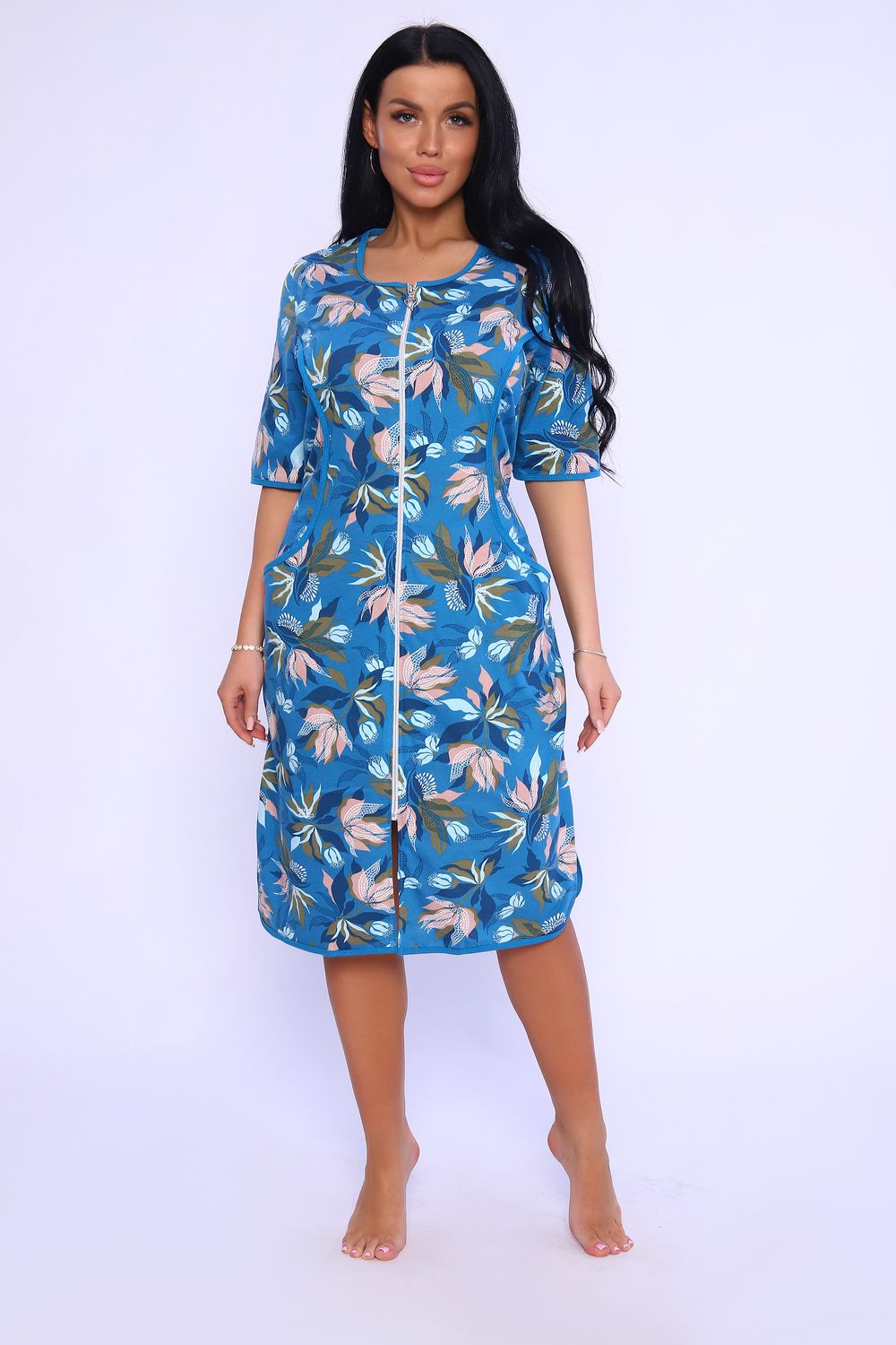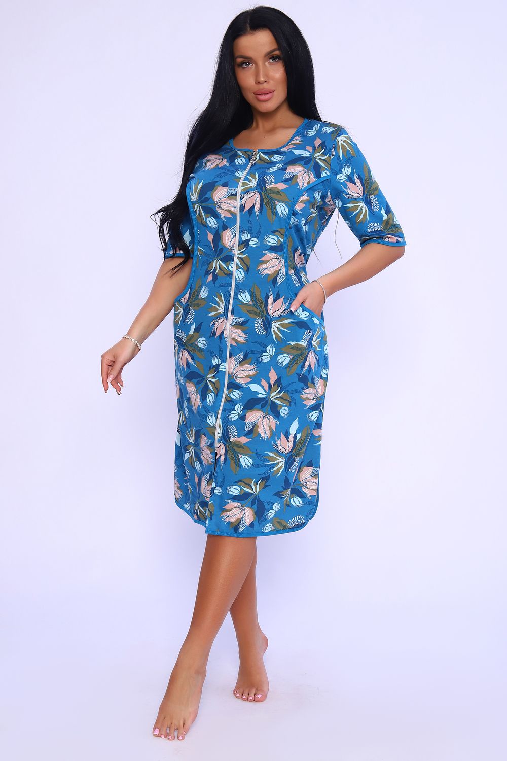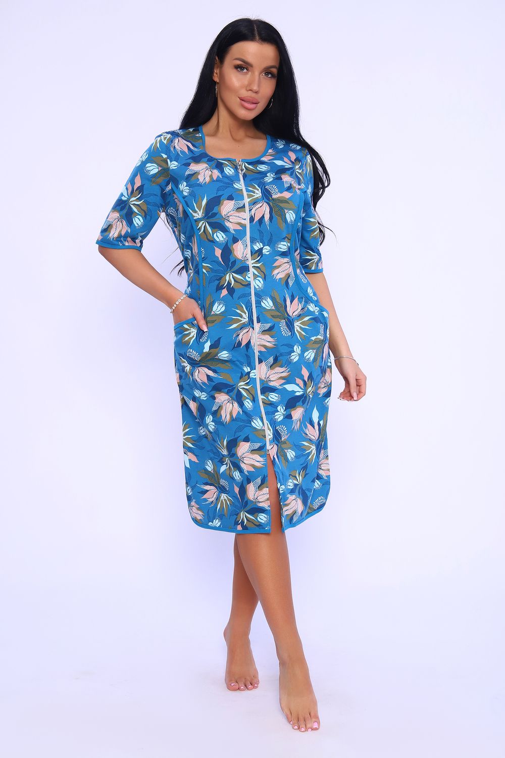 Халат женский домашний из кулирки с цветочным принтом. Халат полуприталенного силуэта с отрезными бочками-рельефами, выходящими из проймы, с внутренними карманами, с центральной застежкой на тесьму-молнию. Горловина с круглым вырезом. Спинка с полупоясами для усиления прилегания в области талии, рукава короткие. Внизу халата в боковых швах разрезы фигурной формы. Полупояса, горловина, рельефы и низ халата обработаны бейкой из однотонной кулирки в тон принта основной ткани.