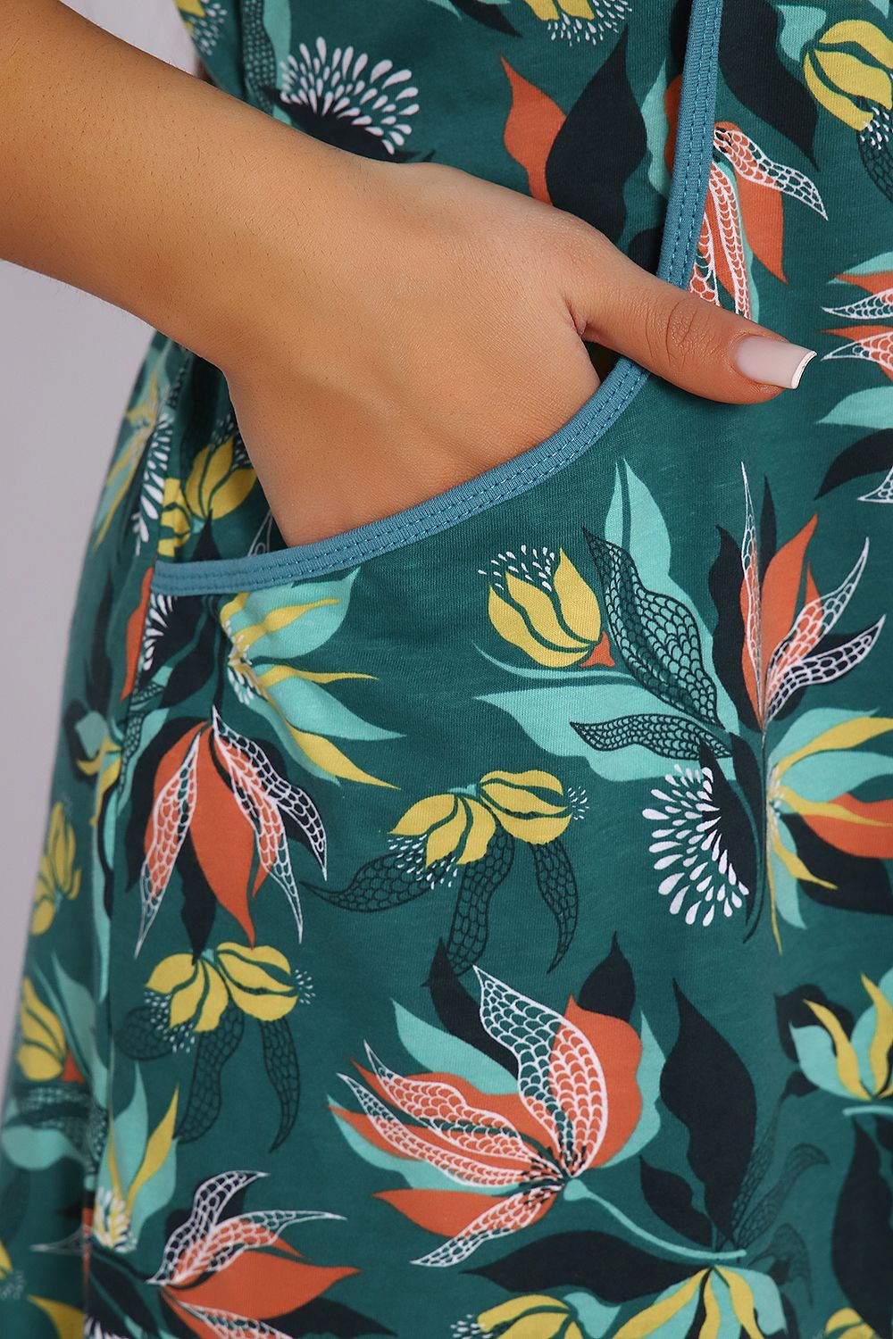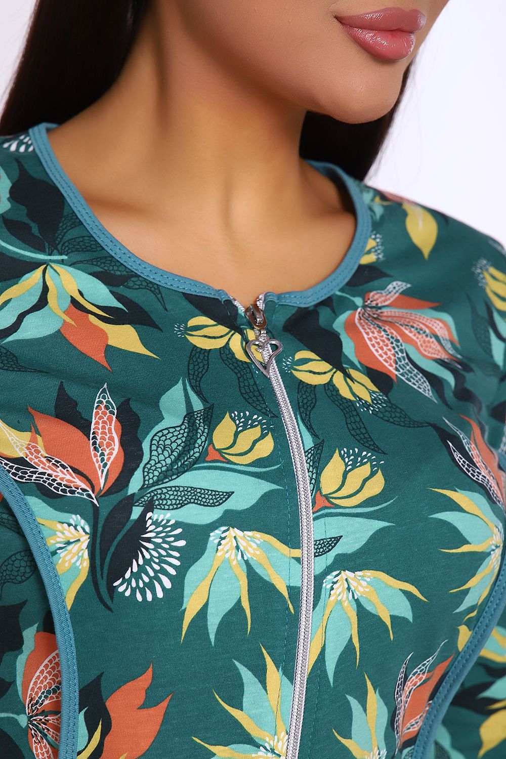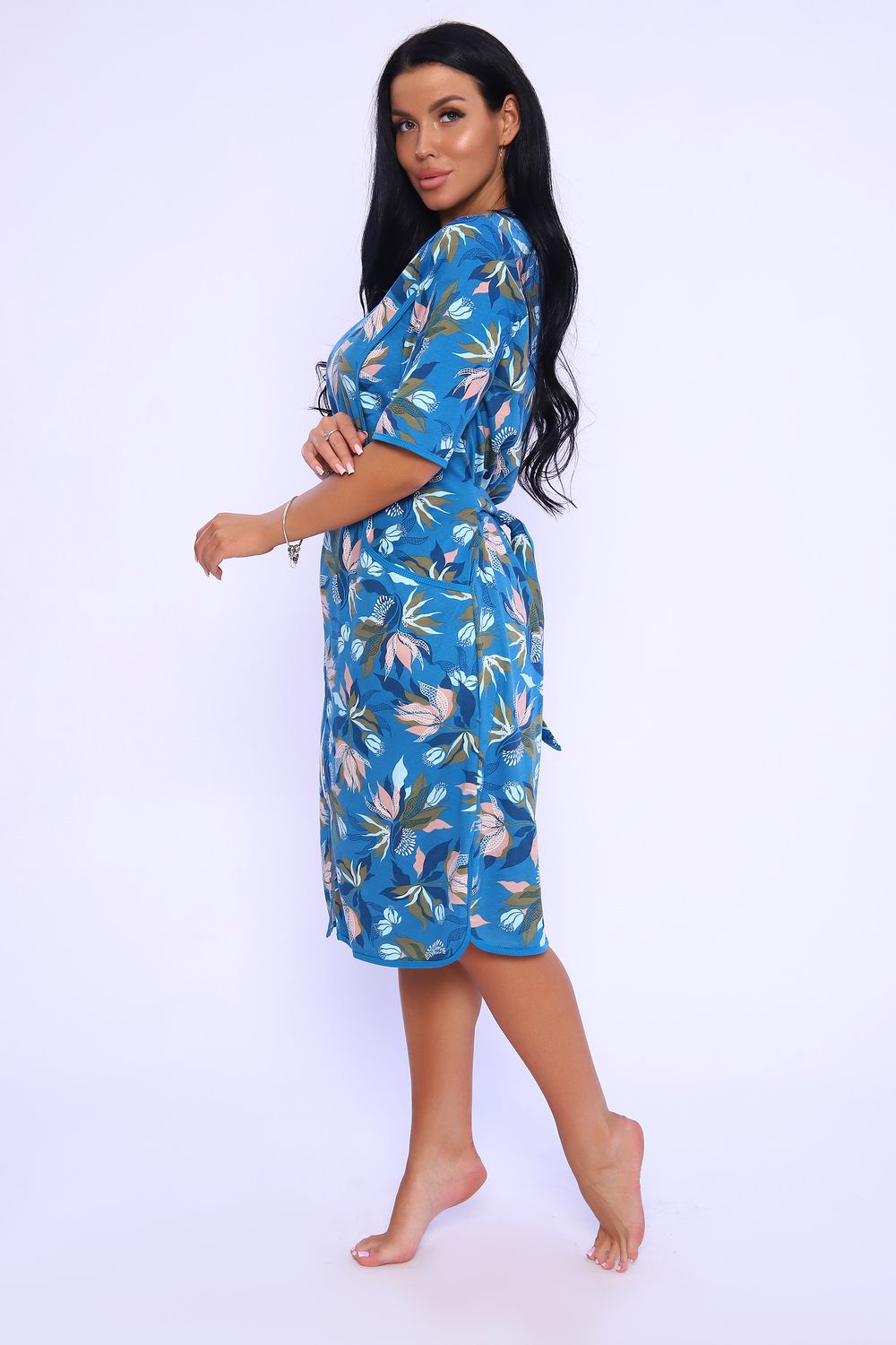 Халат женский домашний из кулирки с цветочным принтом. Халат полуприталенного силуэта с отрезными бочками-рельефами, выходящими из проймы, с внутренними карманами, с центральной застежкой на тесьму-молнию. Горловина с круглым вырезом. Спинка с полупоясами для усиления прилегания в области талии, рукава короткие. Внизу халата в боковых швах разрезы фигурной формы. Полупояса, горловина, рельефы и низ халата обработаны бейкой из однотонной кулирки в тон принта основной ткани.