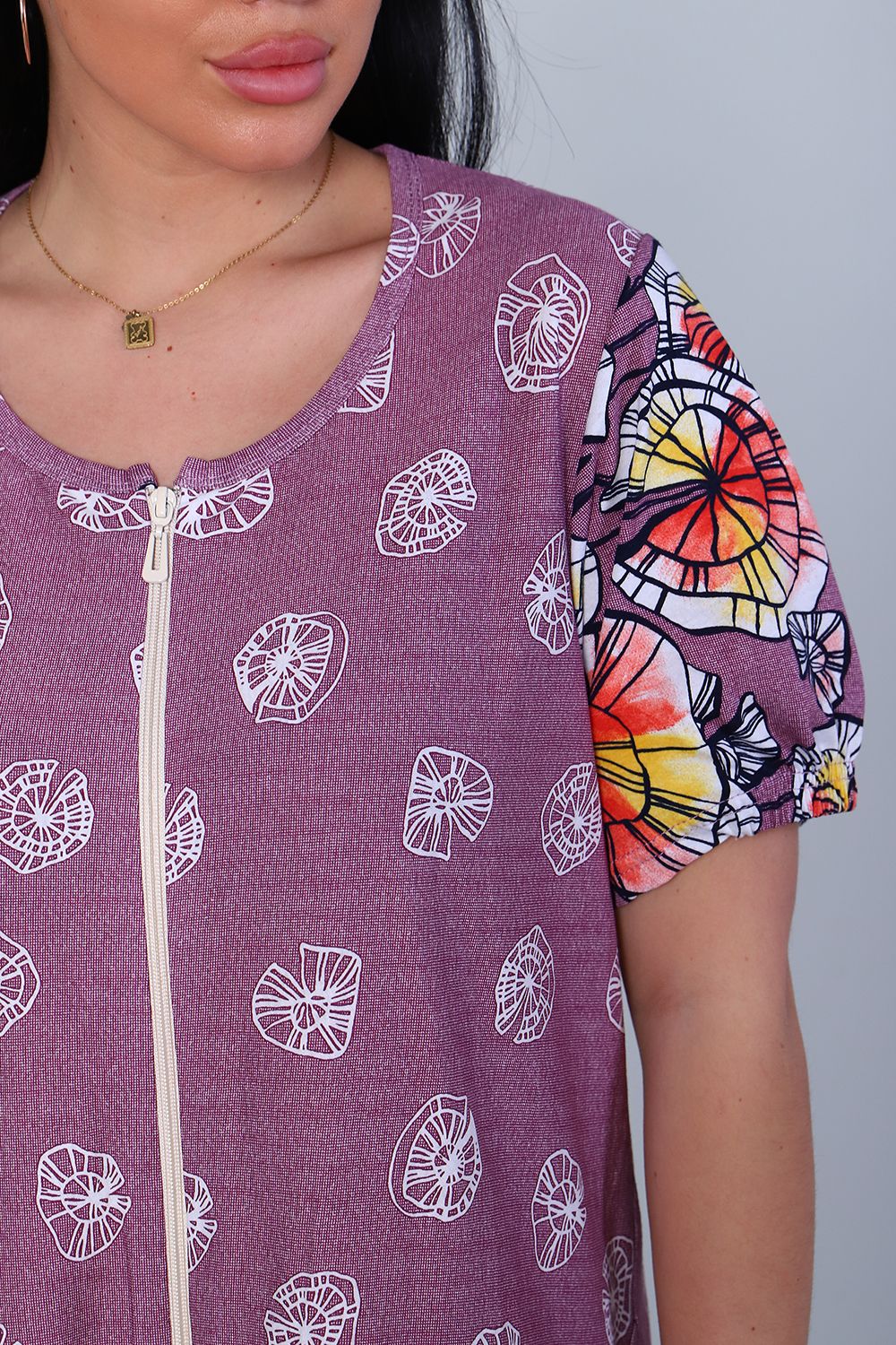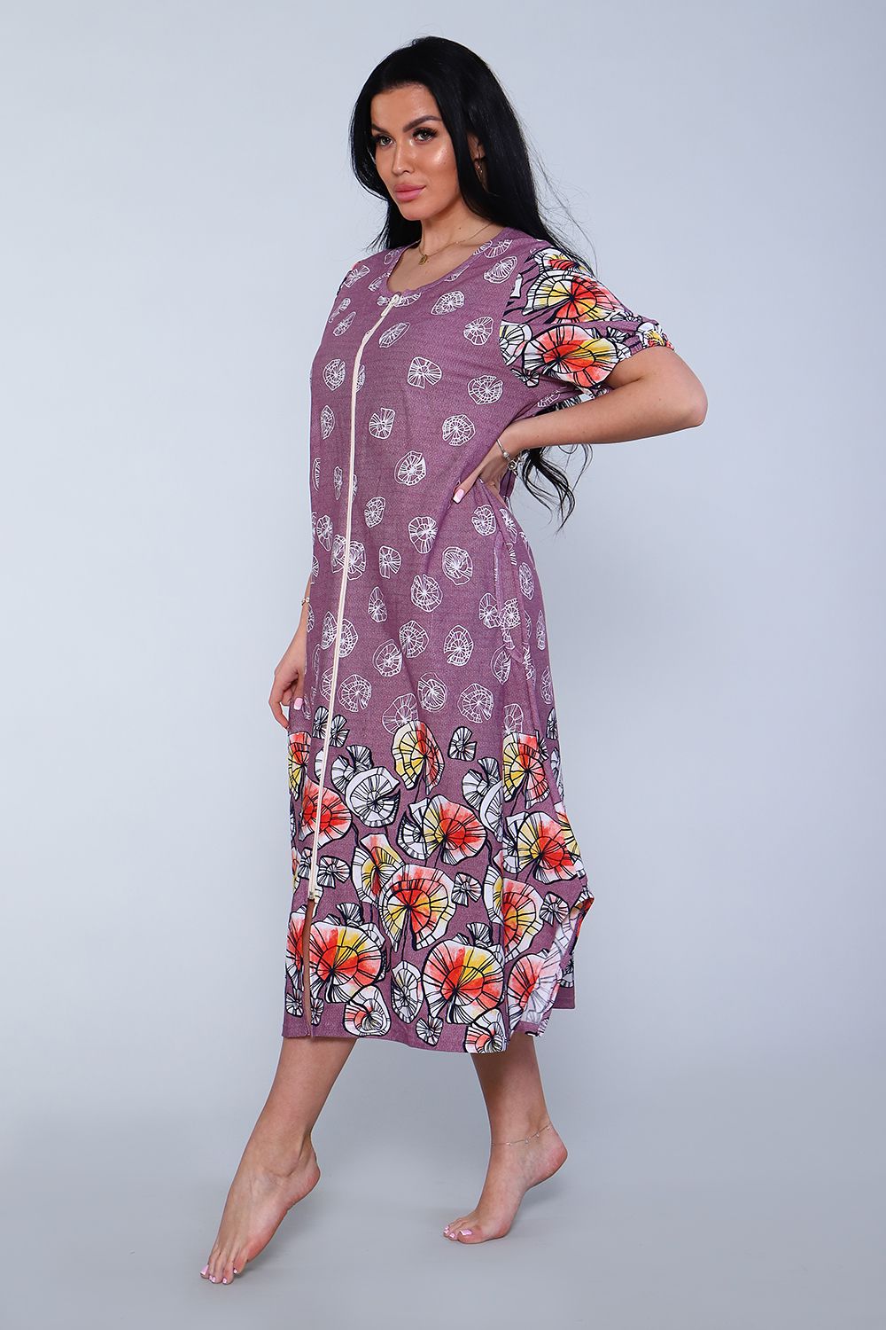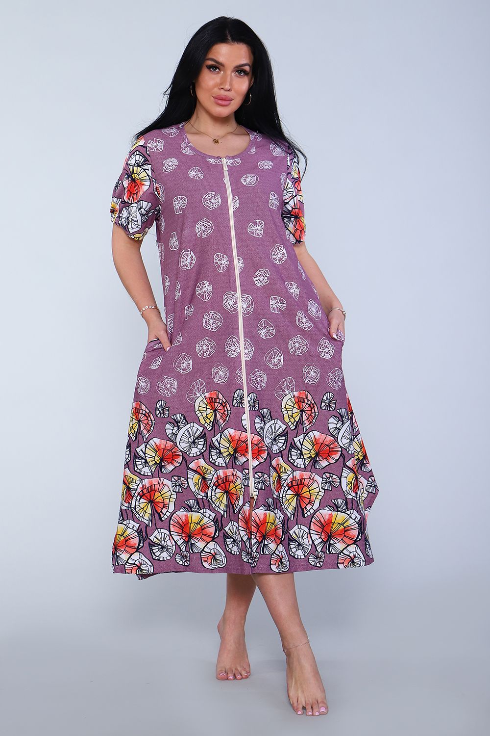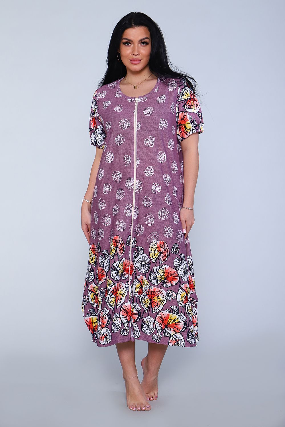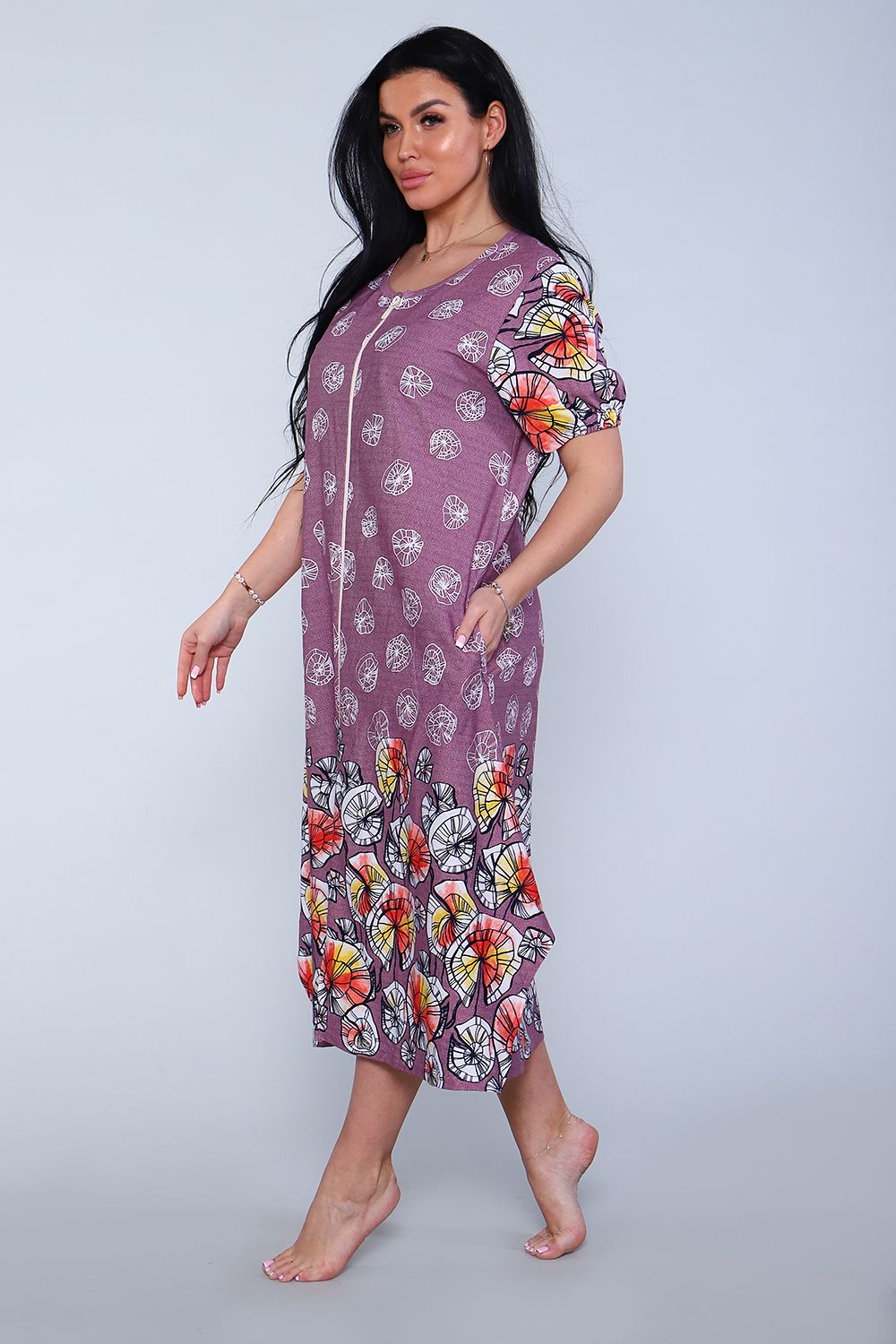 Халат женский, свободного кроя. На полочке халата в боковых швах расположены карманы. На рукавах посередине низка в подгибке втачена резинка, которая придает небольшую пышность рукаву. Изделие А-образного силуэта с хорошим расширением к низу, отлично садится на женщин с широкими бедрами. Халатик хорошо подходит для дома и отдыха на даче.