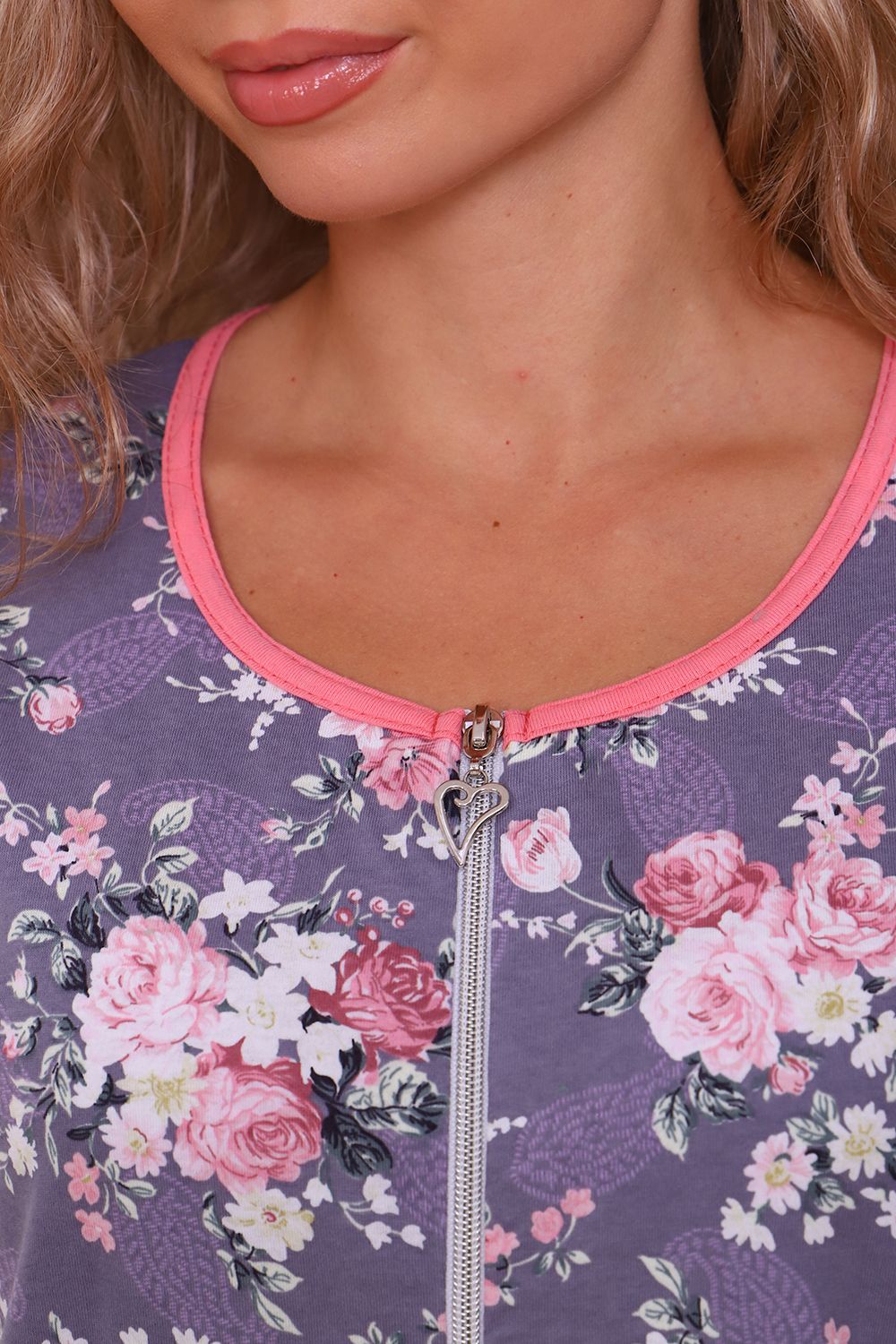 Халат женский из красивой нежной расцветки с розочками. Халат на молнии. По горловине, карману и низу изделия отделочная бейка. Низ изделия закруглен к боковому шву.