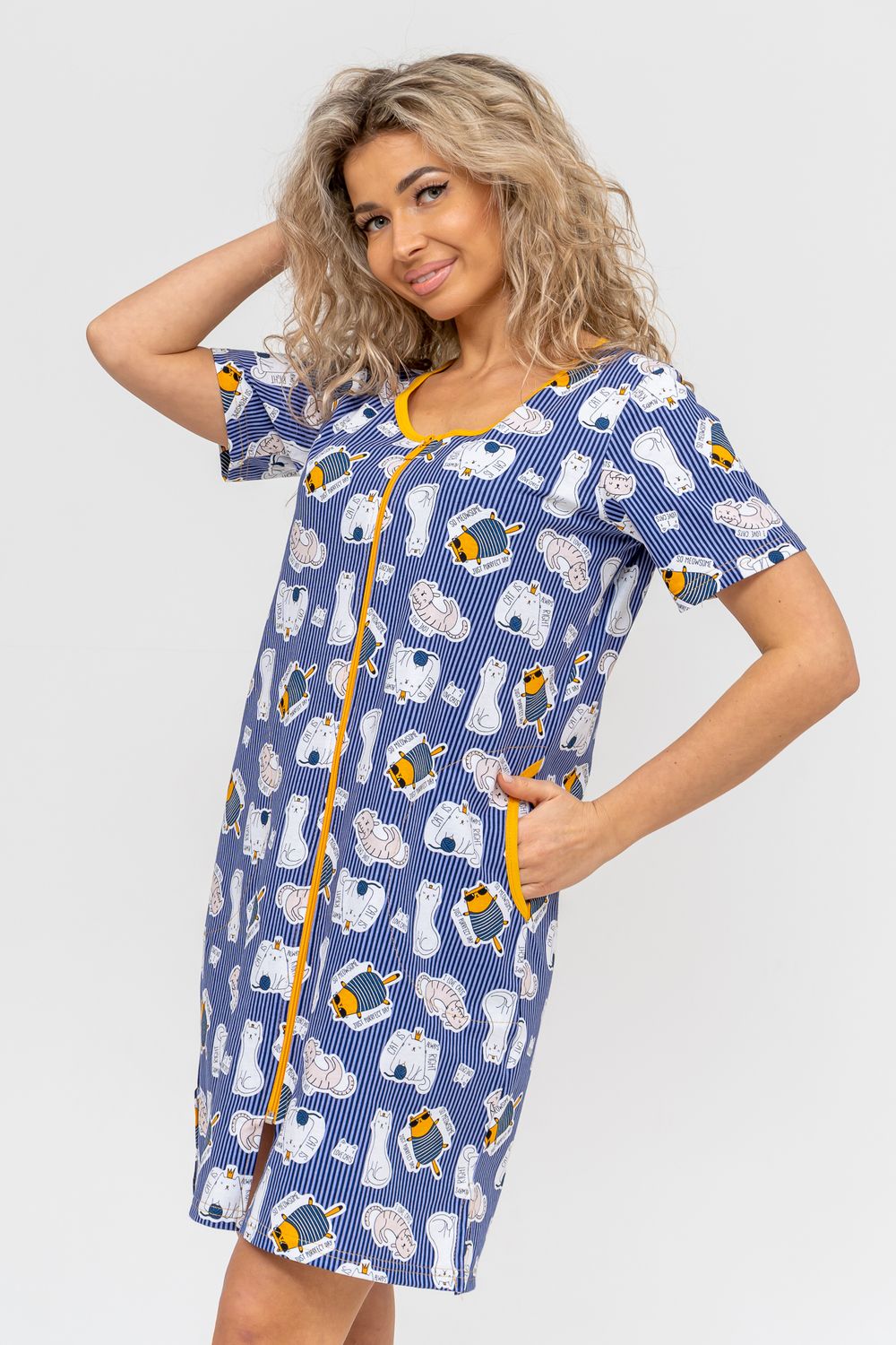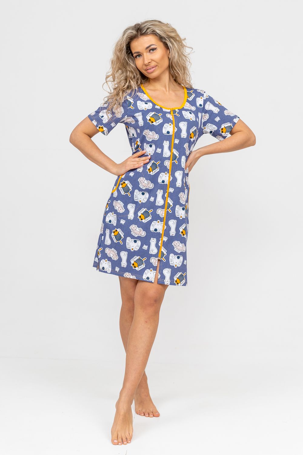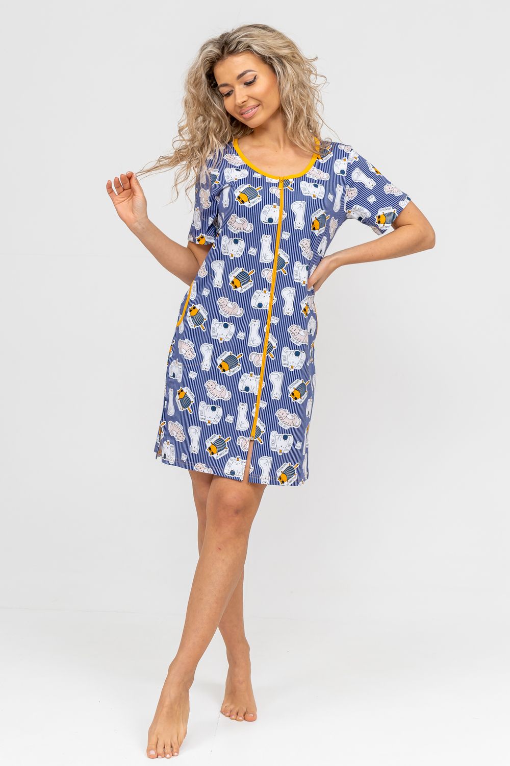 Женский халатик модных трендовых расцветок выполнен из 100% хлопчатобумажной ткани, что обеспечивает максимальный комфорт при ношении. Отличается мягкостью и приятной на ощупь текстурой. Материал прекрасно дышит. Носить такой халатик Вы сможете как летом, так и в любой другой сезон. Надёжный замок на молнии сохраняет свои свойства в течении всего времени использования. Женственный вырез и 2 боковых кармана добавляют образу шарм и делают изделие удобным и практичным. Изысканный, средней длины халатик подойдёт для любого типа фигуры. Отличная модель для дома, для роддома, после родов, для кухонных дел и хозяйственной уборки, для дачи. И конечно идеально после душа, сауны, бани и ванной. А так же будет замечательным подарком на любой праздник: 14 февраля, день рождения, 8 марта. Рекомендуется стирать в деликатном режиме 30 °С. Это поможет избежать деформации и сохранить яркость цвета.