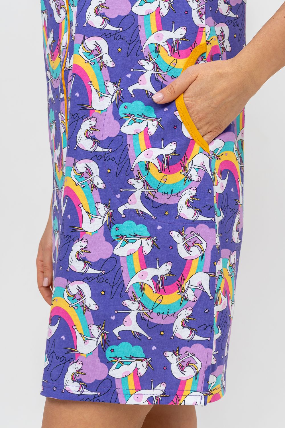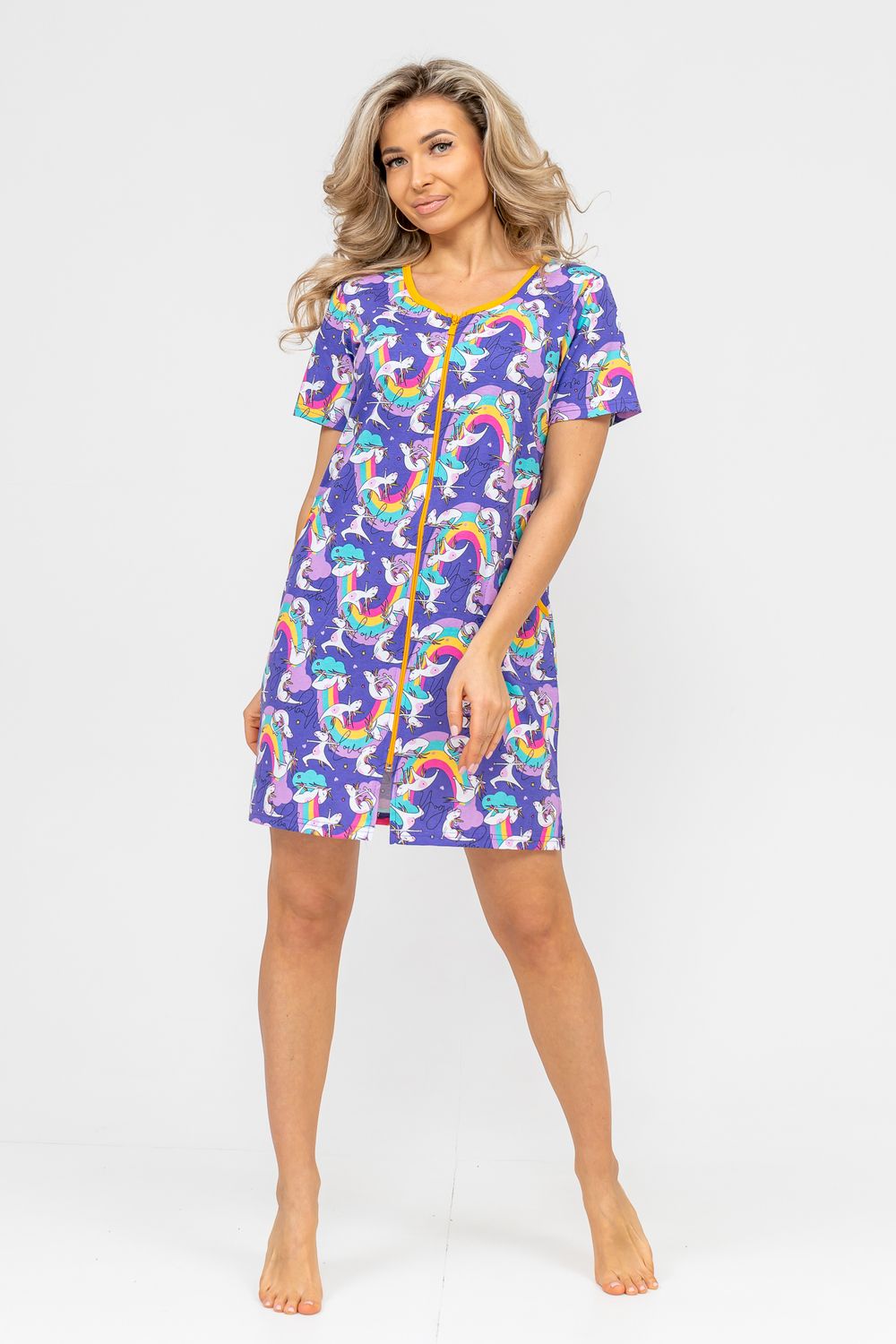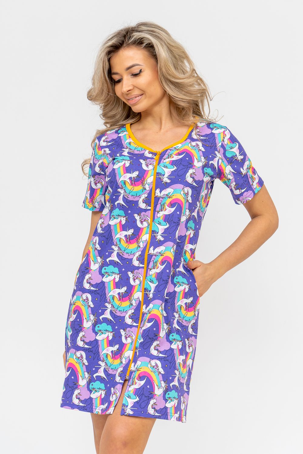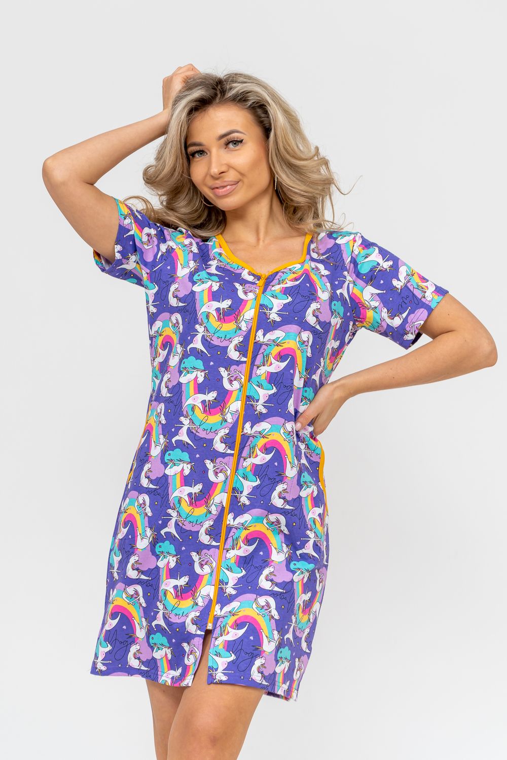 Женский халатик модных трендовых расцветок выполнен из 100% хлопчатобумажной ткани, что обеспечивает максимальный комфорт при ношении. Отличается мягкостью и приятной на ощупь текстурой. Материал прекрасно дышит. Носить такой халатик Вы сможете как летом, так и в любой другой сезон. Надёжный замок на молнии сохраняет свои свойства в течении всего времени использования. Женственный вырез и 2 боковых кармана добавляют образу шарм и делают изделие удобным и практичным. Изысканный, средней длины халатик подойдёт для любого типа фигуры. Отличная модель для дома, для роддома, после родов, для кухонных дел и хозяйственной уборки, для дачи. И конечно идеально после душа, сауны, бани и ванной. А так же будет замечательным подарком на любой праздник: 14 февраля, день рождения, 8 марта. Рекомендуется стирать в деликатном режиме 30 °С. Это поможет избежать деформации и сохранить яркость цвета.