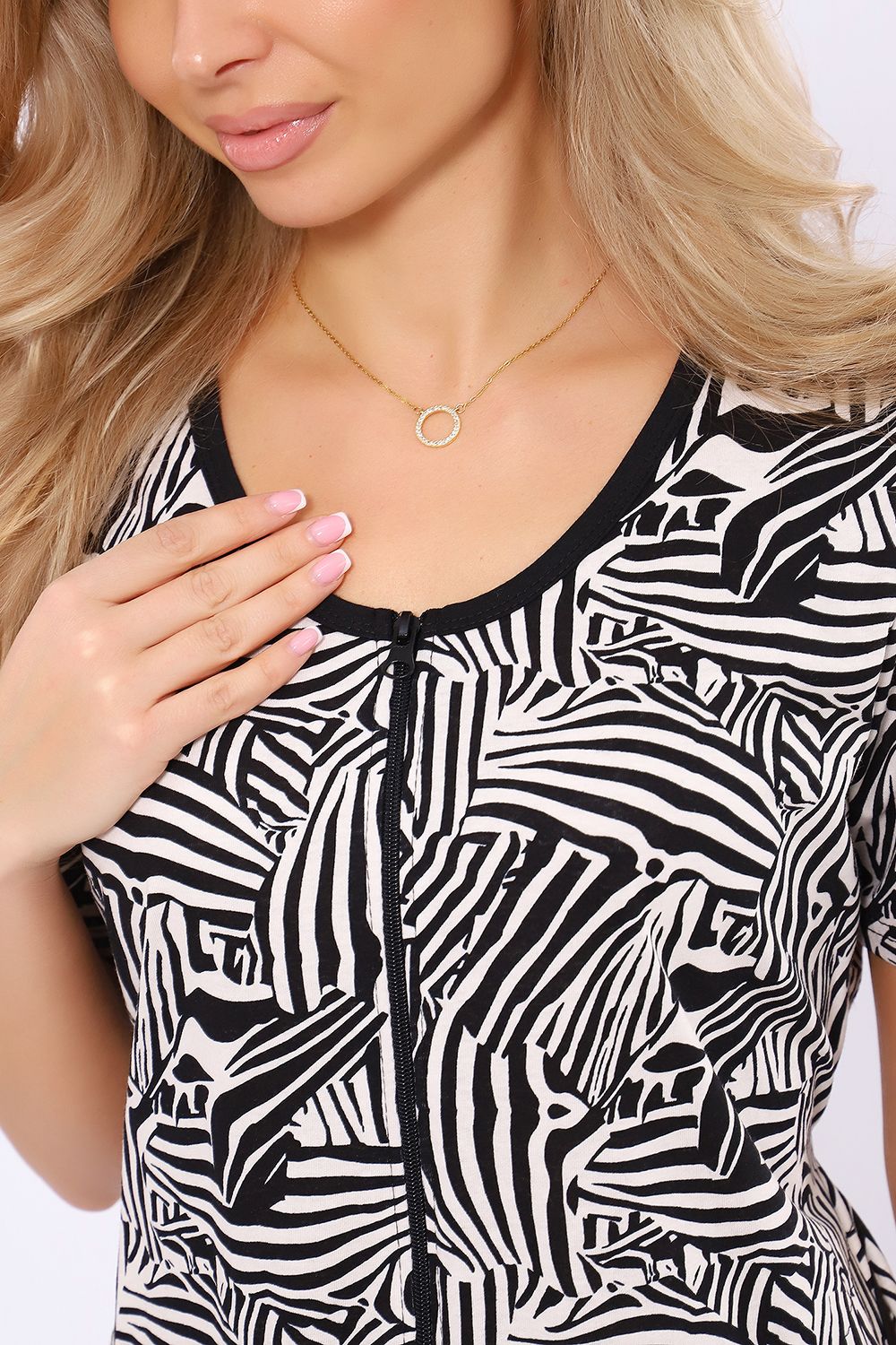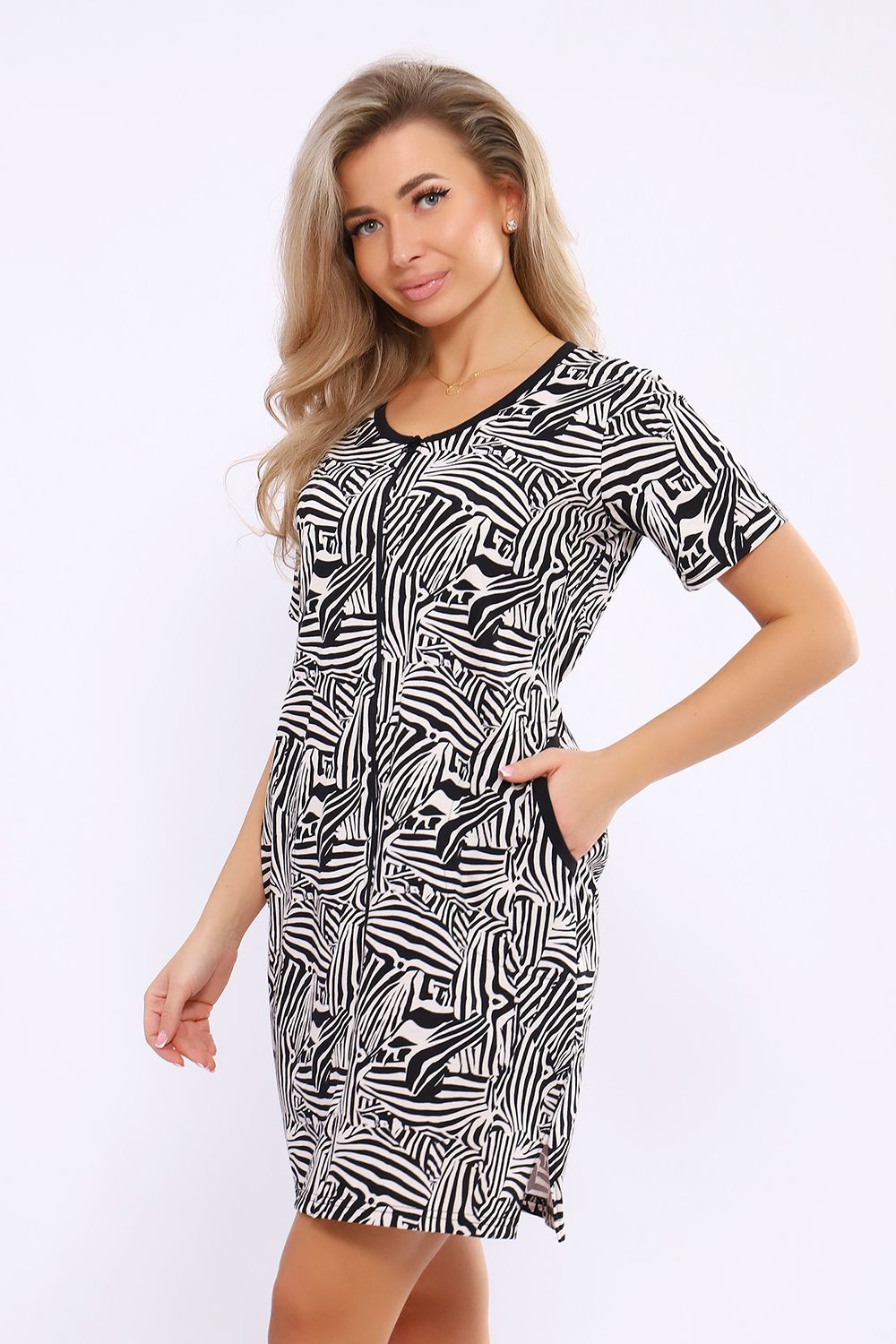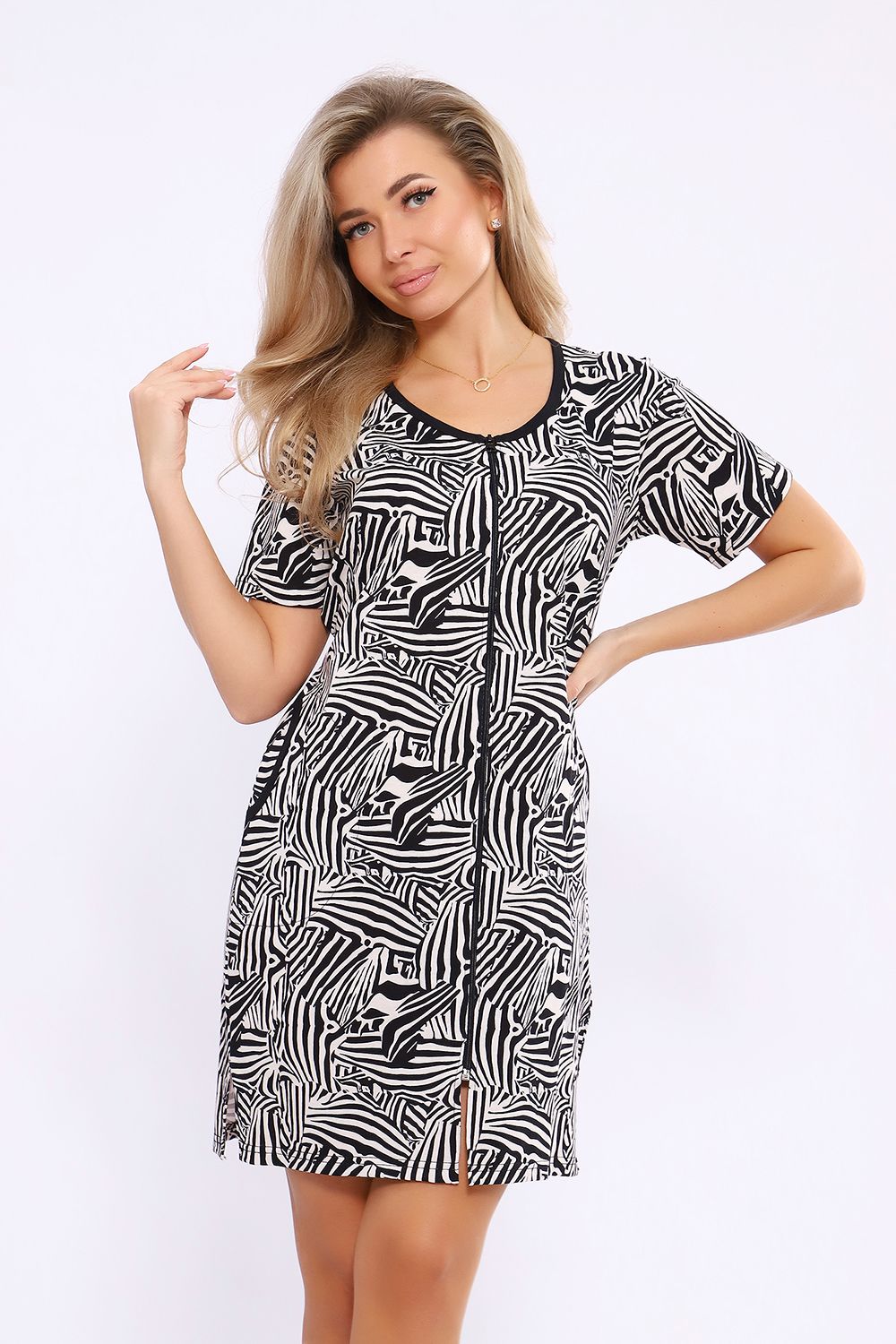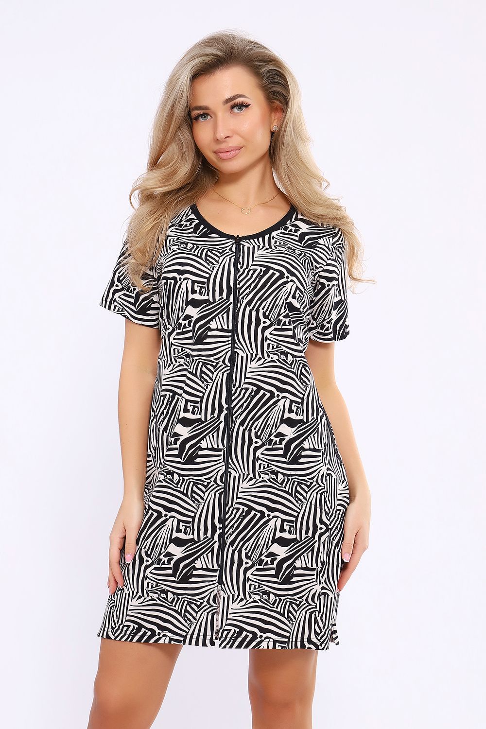 Женский халатик модной расцветки выполнен из 100% хлопчатобумажной ткани, что обеспечивает максимальный комфорт при ношении. Отличается мягкостью и приятной на ощупь текстурой. Материал прекрасно дышит. Носить такой халатик Вы сможете как летом, так и в любой другой сезон. Надёжный замок на молнии сохраняет свои свойства в течении всего времени использования. Женственный вырез и 2 боковых кармана добавляют образу шарм и делают изделие удобным и практичным. А изысканный поясок подчеркнёт вашу талию. Халатик средней длины подойдёт для любого типа фигуры. Отличная модель для дома, для роддома, после родов, для кухонных дел и хозяйственной уборки, для дачи. И конечно идеально после душа, сауны, бани и ванной. А так же будет замечательным подарком на любой праздник: 14 февраля, день рождения, 8 марта. Рекомендуется стирать в деликатном режиме 30 °С. Это поможет избежать деформации и сохранить яркость цвета.