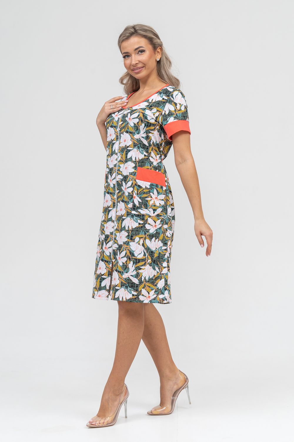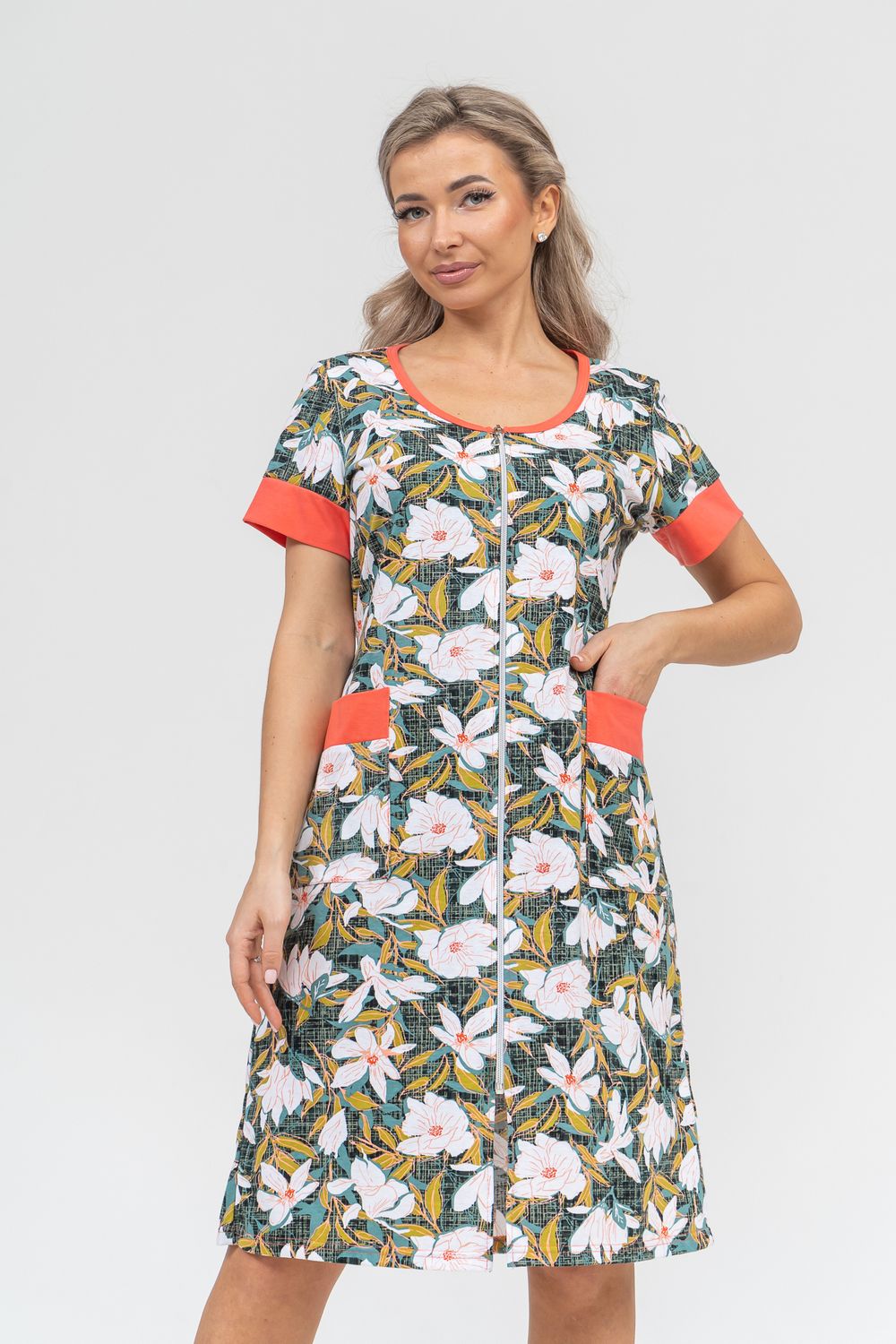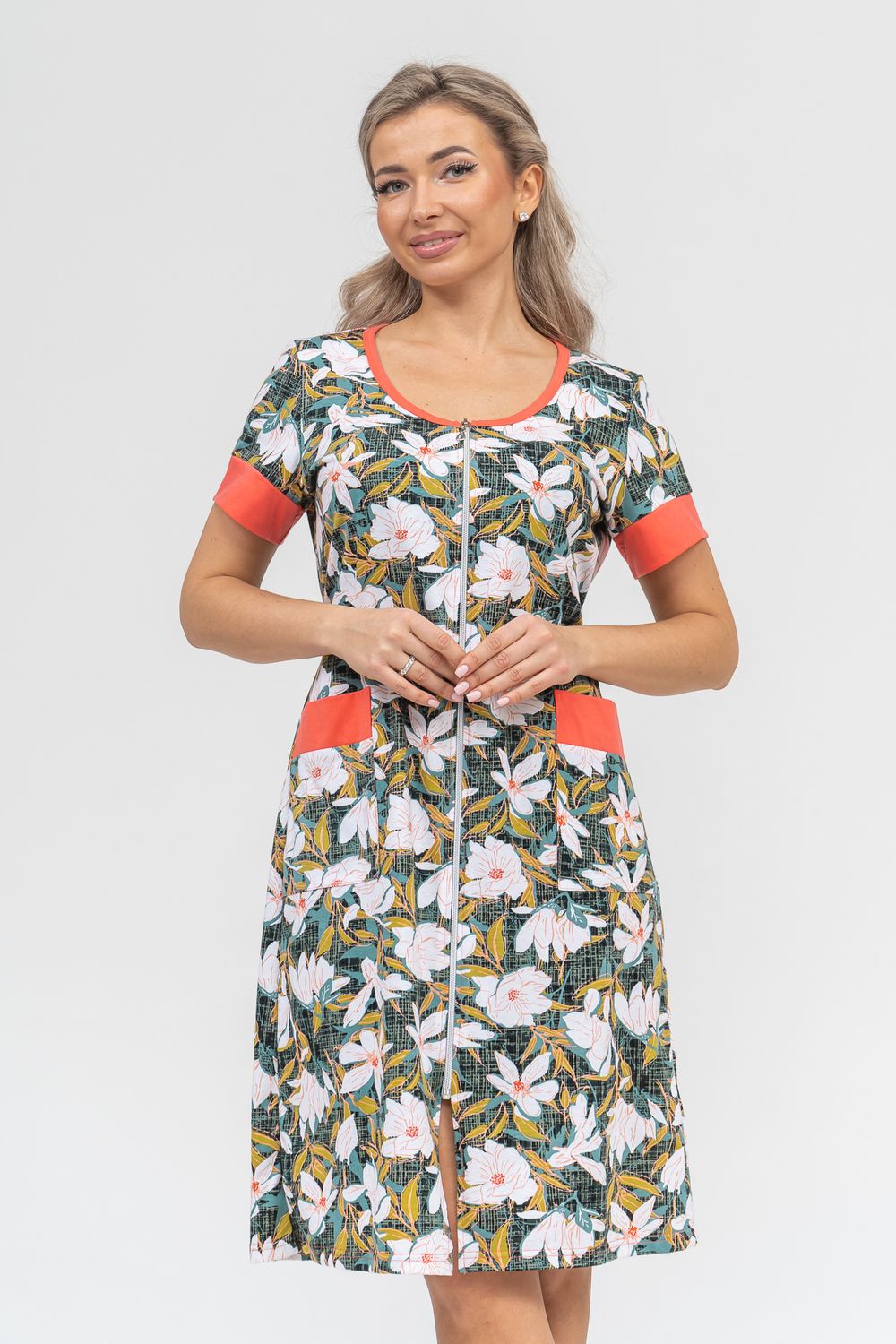Женский халатик на молнии – самая распространенная и универсальная одежда для домашнего отдыха и хозяйственных хлопот. После трудного рабочего дня, приходя домой, первым делом хочется переодеться. И данная модель это идеальный вариант среди представительниц прекрасной половины человечества. Модель выполнена из 100% хлопчатобумажной ткани. Халат так же дополняет яркая отделка по рукавам и карманам. А пояс на линии талии поможет легко смоделировать женственный силуэт и при этом Вы будете чувствовать себя легко и непринуждённо. Данная модель прекрасно подойдёт для дома, дачи и отдыха, создавая по-настоящему яркий образ и хорошее настроение!