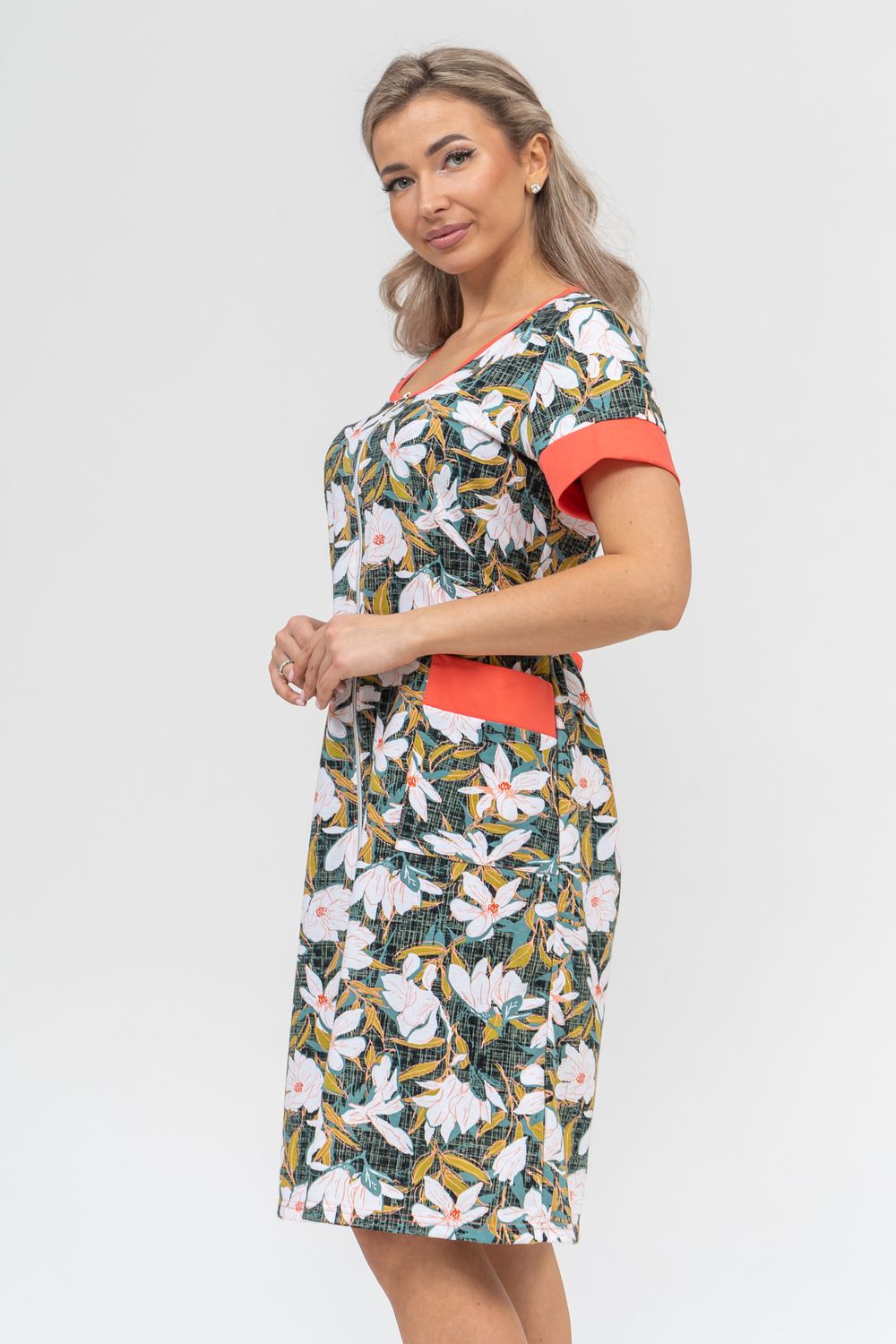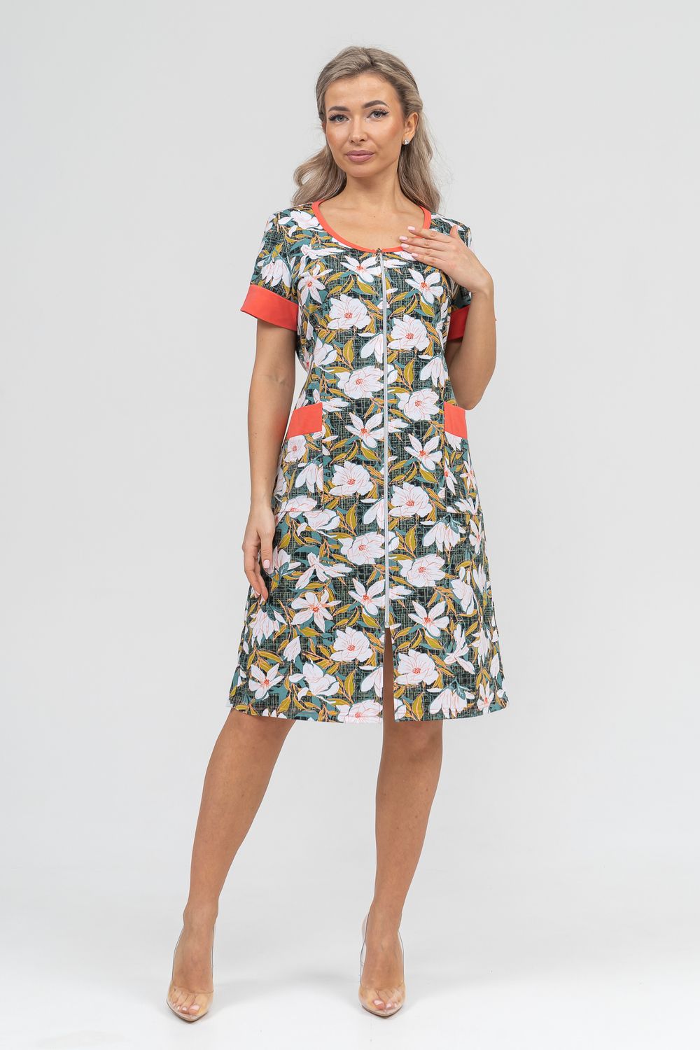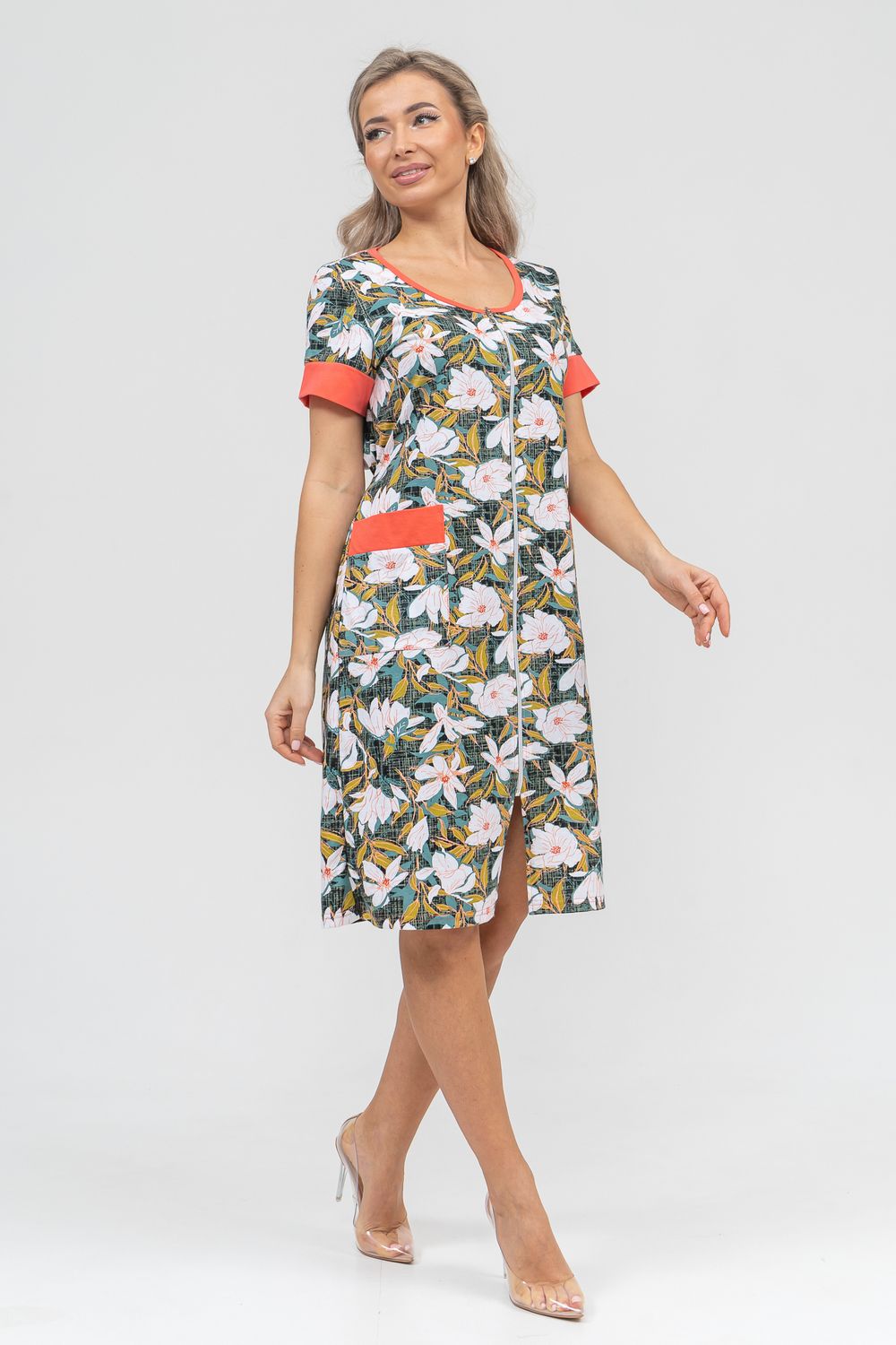 Женский халатик на молнии – самая распространенная и универсальная одежда для домашнего отдыха и хозяйственных хлопот. После трудного рабочего дня, приходя домой, первым делом хочется переодеться. И данная модель это идеальный вариант среди представительниц прекрасной половины человечества. Модель выполнена из 100% хлопчатобумажной ткани. Халат так же дополняет яркая отделка по рукавам и карманам. А пояс на линии талии поможет легко смоделировать женственный силуэт и при этом Вы будете чувствовать себя легко и непринуждённо. Данная модель прекрасно подойдёт для дома, дачи и отдыха, создавая по-настоящему яркий образ и хорошее настроение!