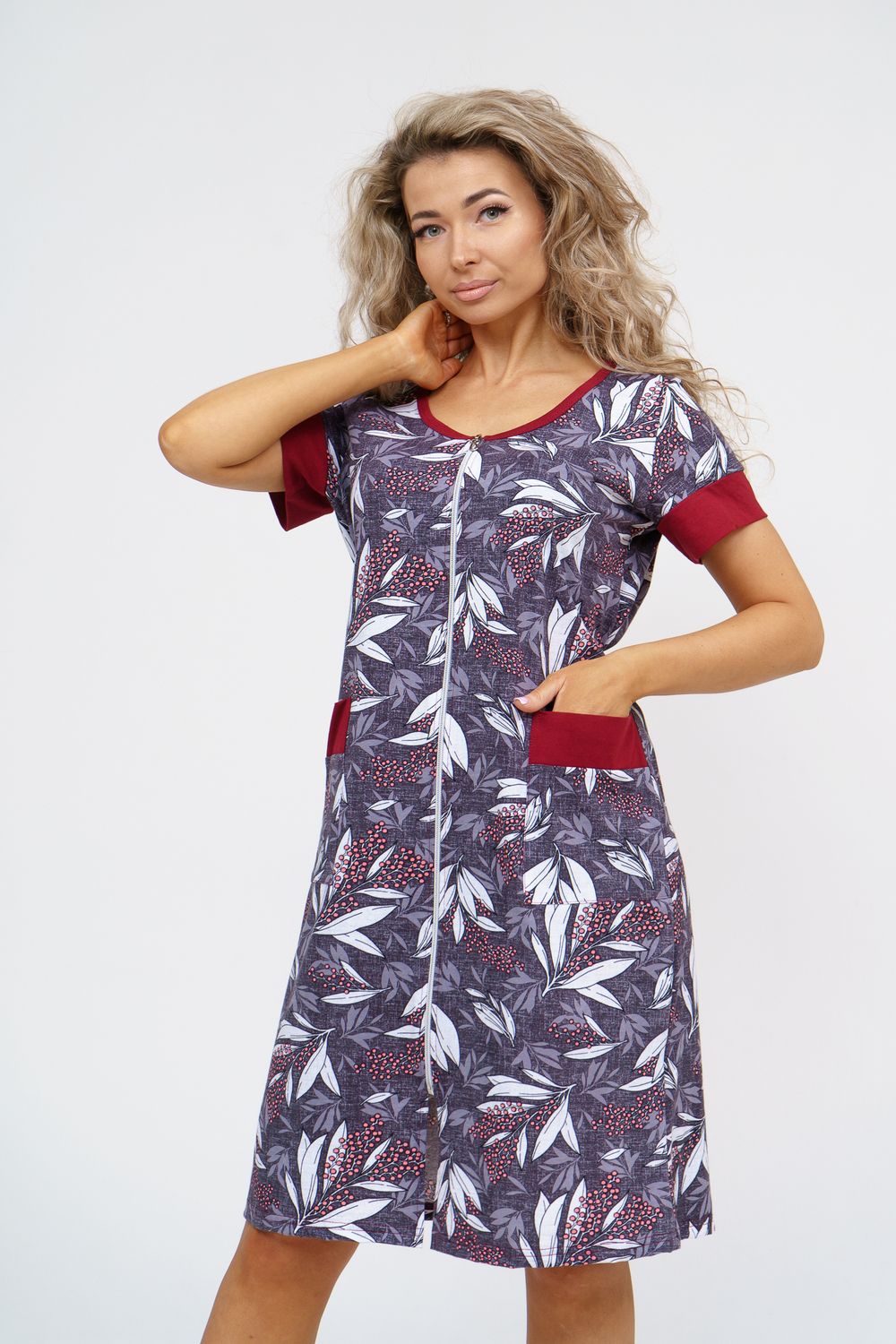Женский халатик на молнии – самая распространенная и универсальная одежда для домашнего отдыха и хозяйственных хлопот. После трудного рабочего дня, приходя домой, первым делом хочется переодеться. И данная модель это идеальный вариант среди представительниц прекрасной половины человечества. Модель выполнена из 100% хлопчатобумажной ткани. Халат так же дополняет яркая отделка по рукавам и карманам. А пояс на линии талии поможет легко смоделировать женственный силуэт и при этом Вы будете чувствовать себя легко и непринуждённо. Данная модель прекрасно подойдёт для дома, дачи и отдыха, создавая по-настоящему яркий образ и хорошее настроение!