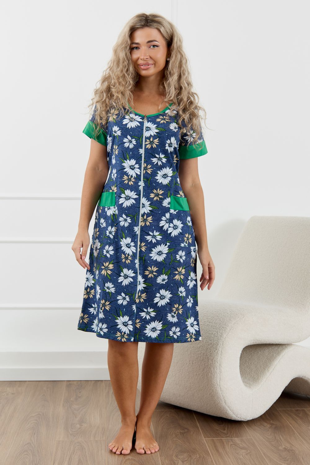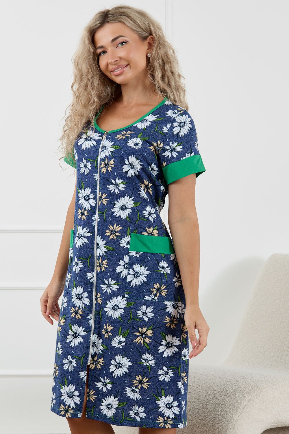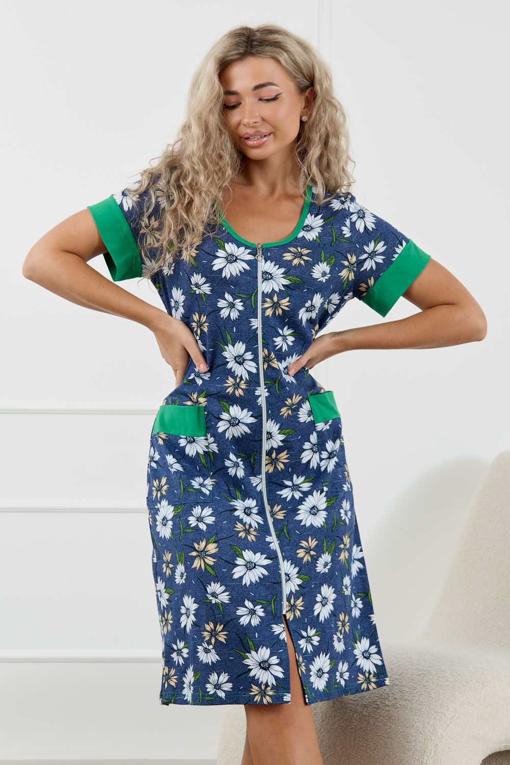 Женский халатик на молнии – самая распространенная и универсальная одежда для домашнего отдыха и хозяйственных хлопот. После трудного рабочего дня, приходя домой, первым делом хочется переодеться. И данная модель это идеальный вариант среди представительниц прекрасной половины человечества. Модель выполнена из 100% хлопчатобумажной ткани. Халат так же дополняет яркая отделка по рукавам и карманам. А пояс на линии талии поможет легко смоделировать женственный силуэт и при этом Вы будете чувствовать себя легко и непринуждённо. Данная модель прекрасно подойдёт для дома, дачи и отдыха, создавая по-настоящему яркий образ и хорошее настроение! Рост модели на фото 165см.